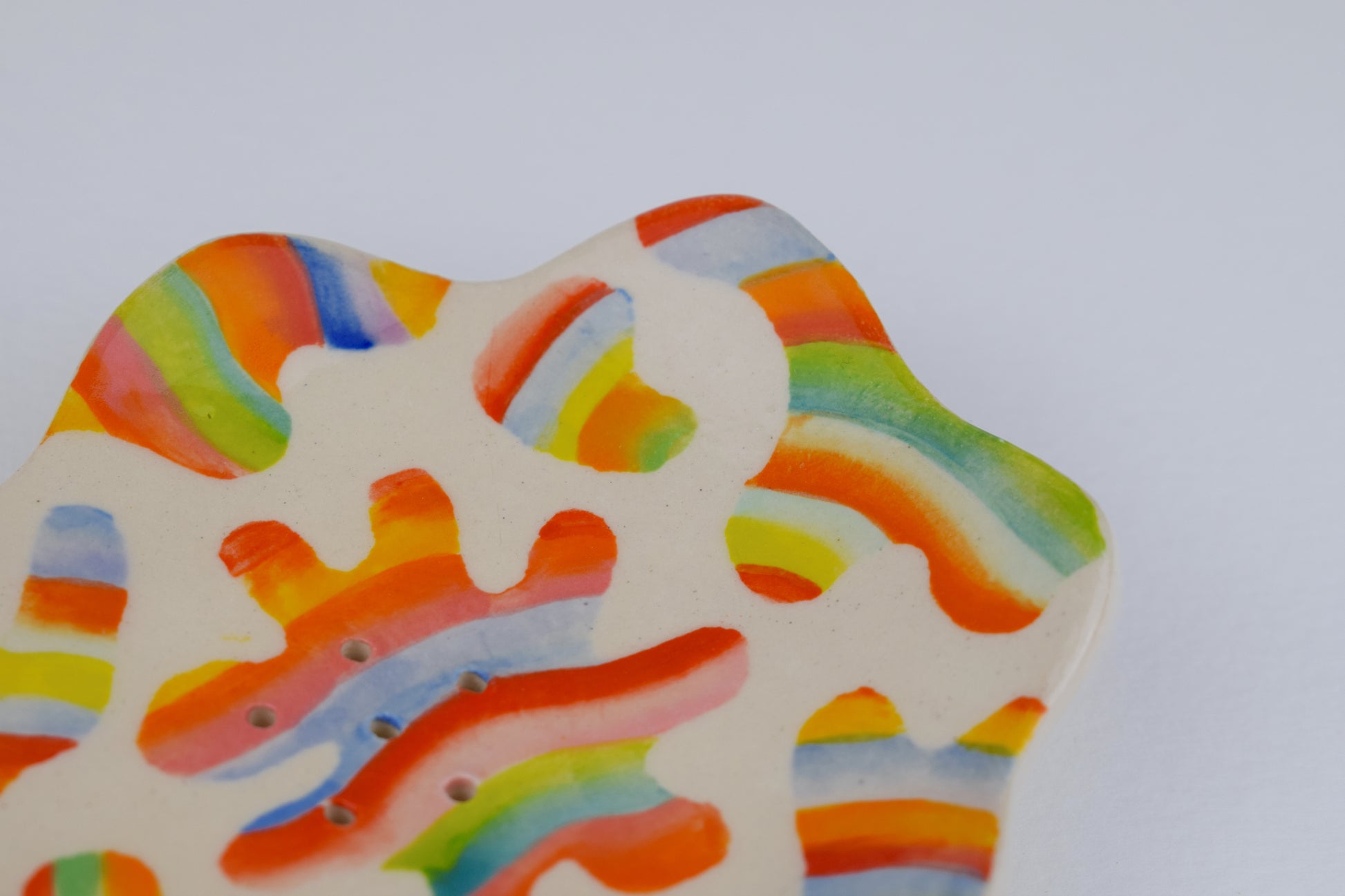 The joyful trinket dish is handmade on the potters wheel in my cosy home studio! Fired twice to over 1200 degrees, the holder is a one of a kind, with the unique pattern created through hand-painting layers of multiple colours of vibrant glaze.
