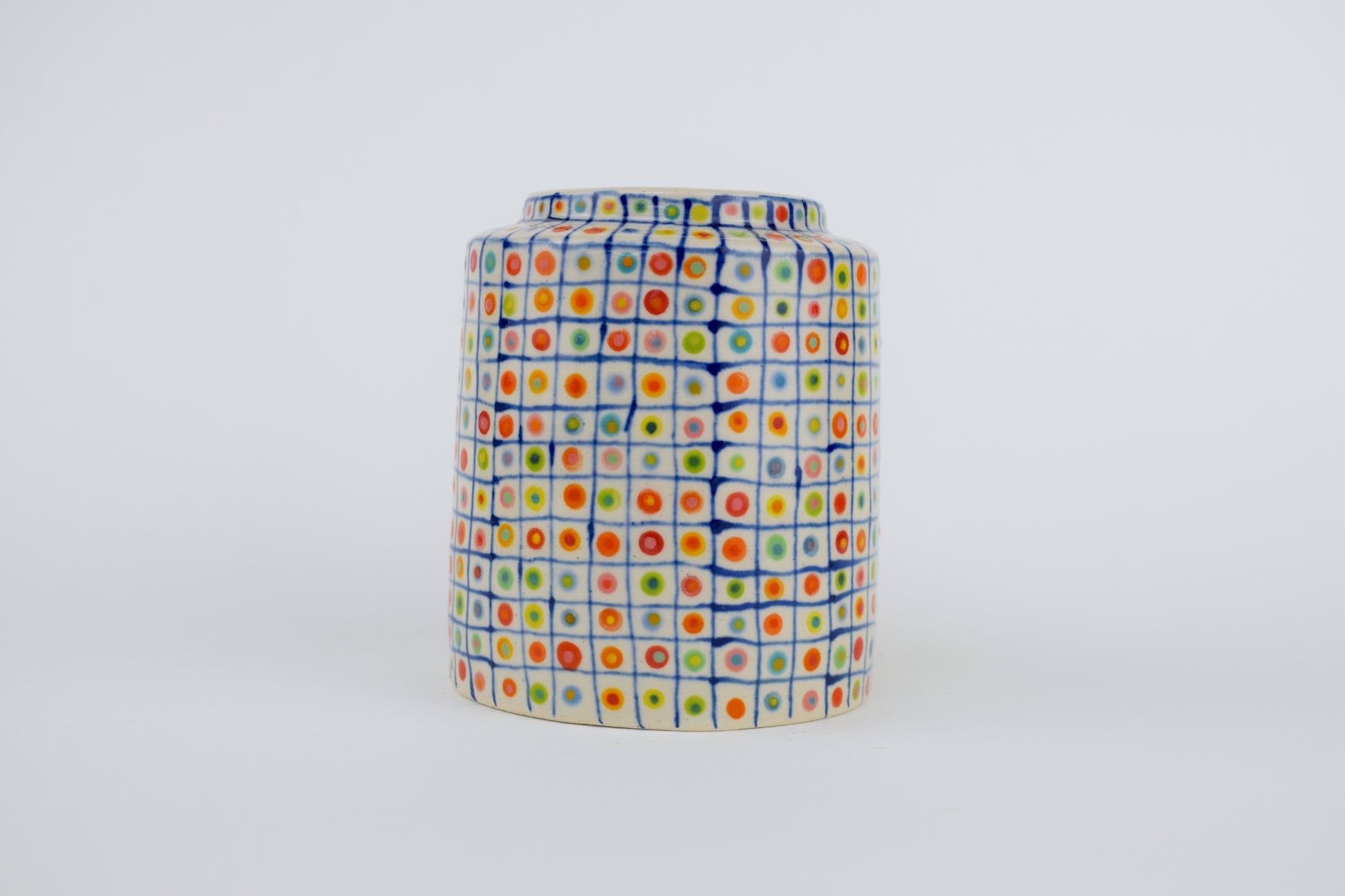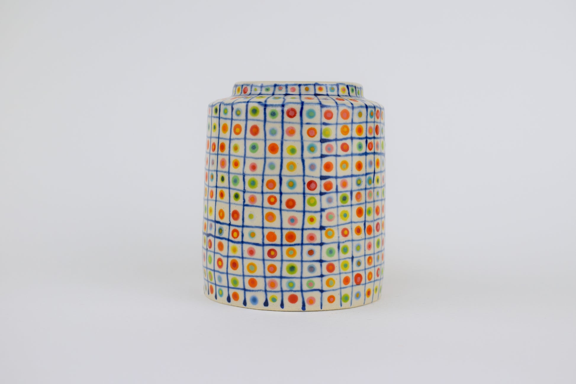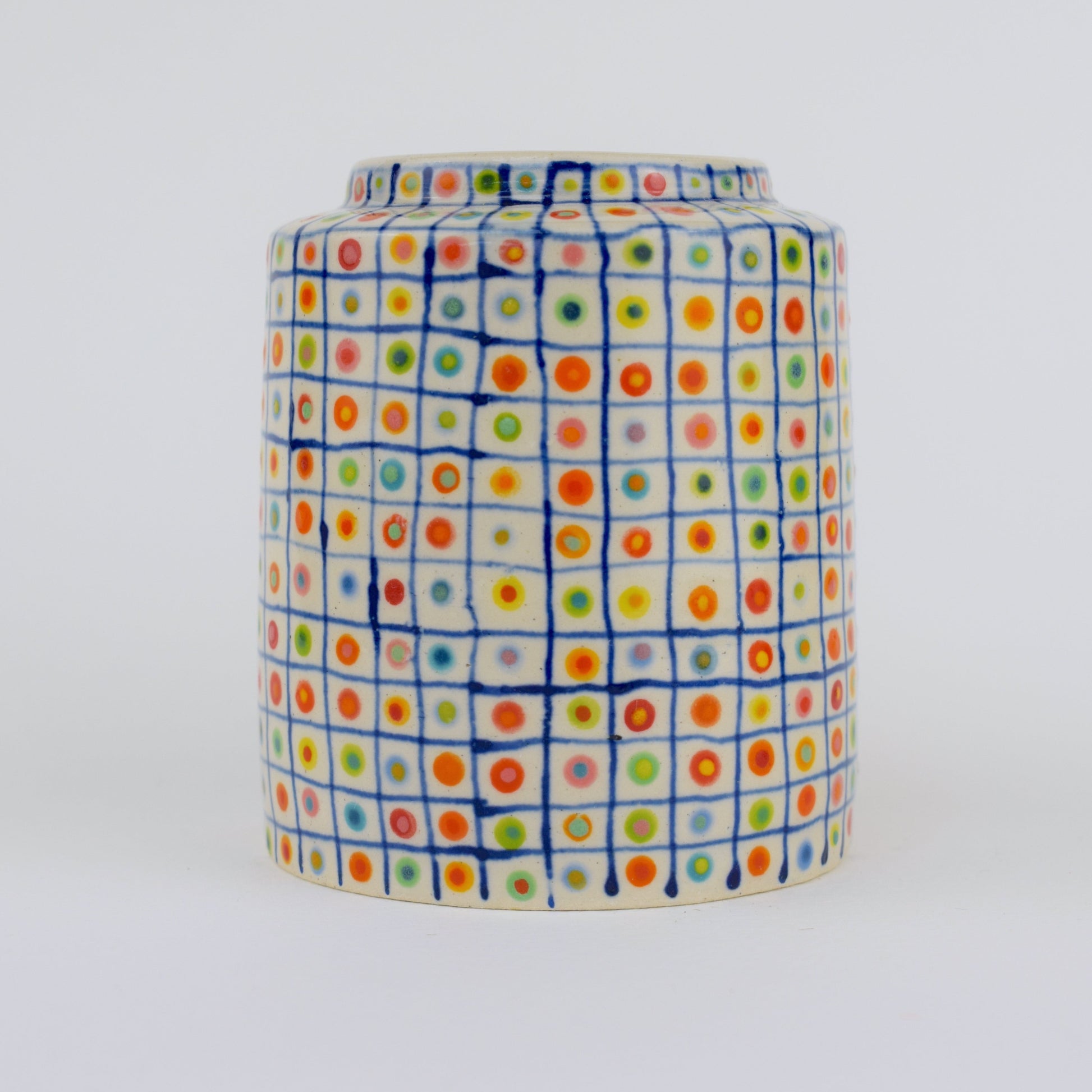The Colour Spot Grid Vase is a hand-thrown stoneware ceramic, carefully made in my cosy home studio and fired to over 1200°C. Each vase is completely unique, featuring a dark blue hand-drawn grid — with a double, colourful glazed dot inside every square. The result is a precise yet playful surface pattern, like a patchwork of tiny, joyful moments arranged in order.
