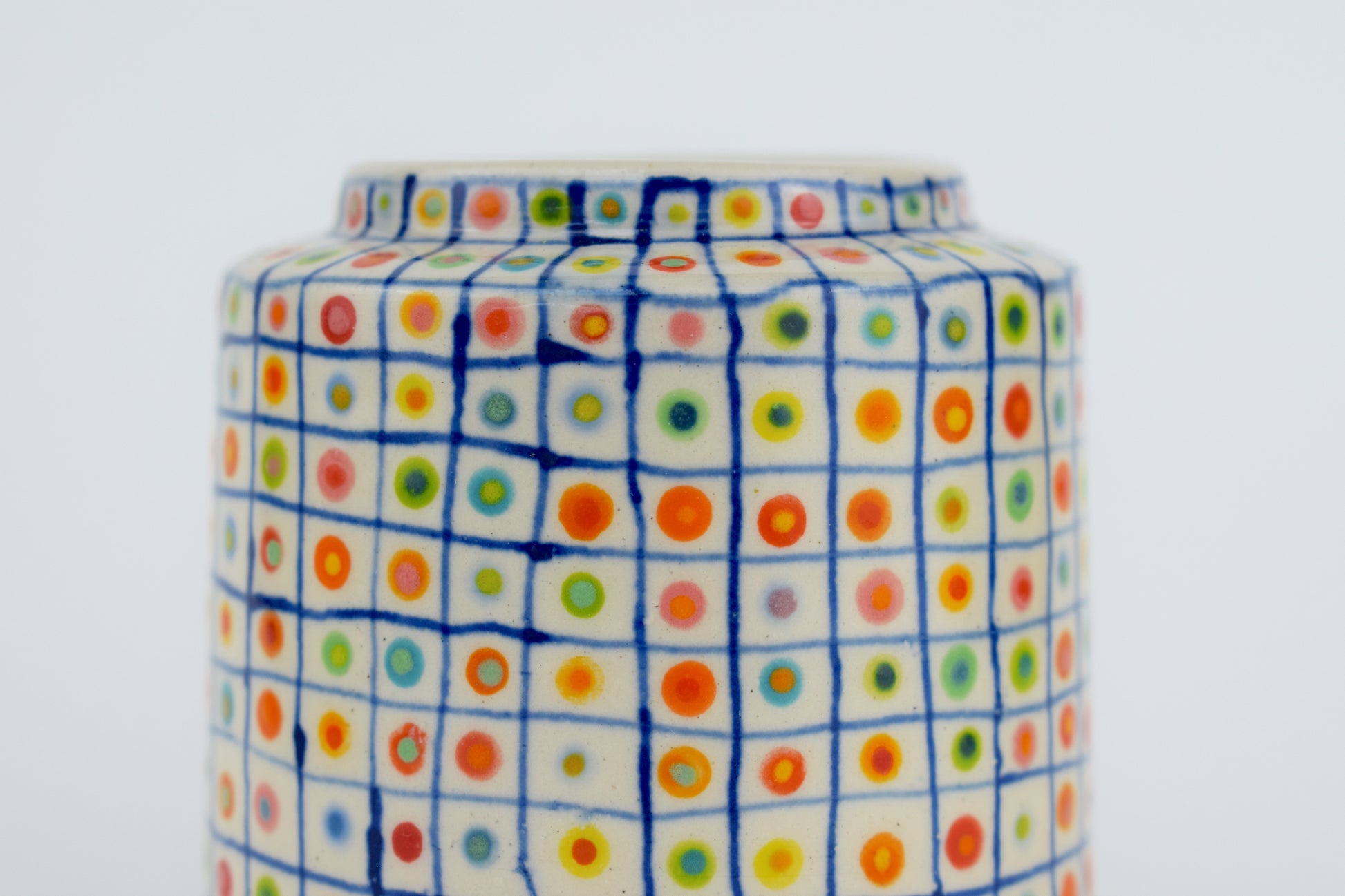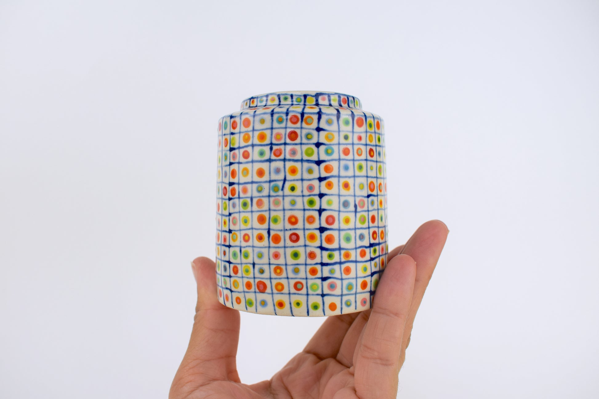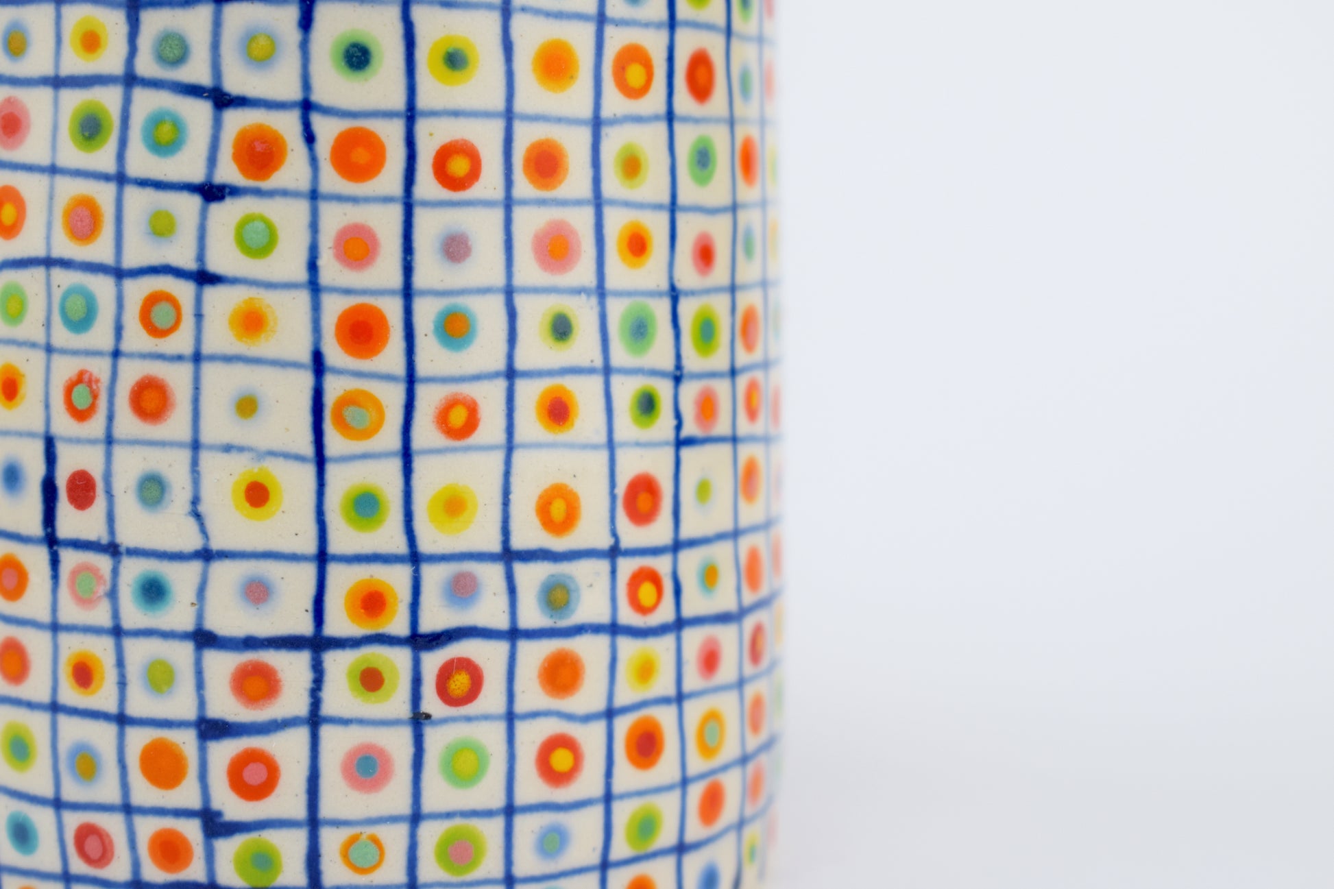 The Colour Spot Grid Vase is a hand-thrown stoneware ceramic, carefully made in my cosy home studio and fired to over 1200°C. Each vase is completely unique, featuring a dark blue hand-drawn grid — with a double, colourful glazed dot inside every square. The result is a precise yet playful surface pattern, like a patchwork of tiny, joyful moments arranged in order.