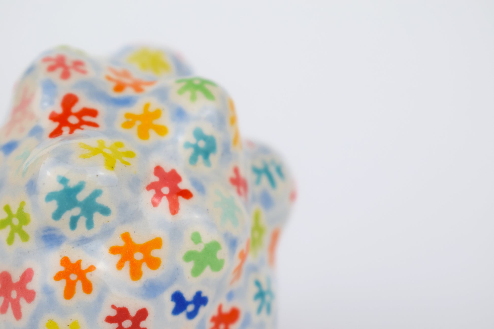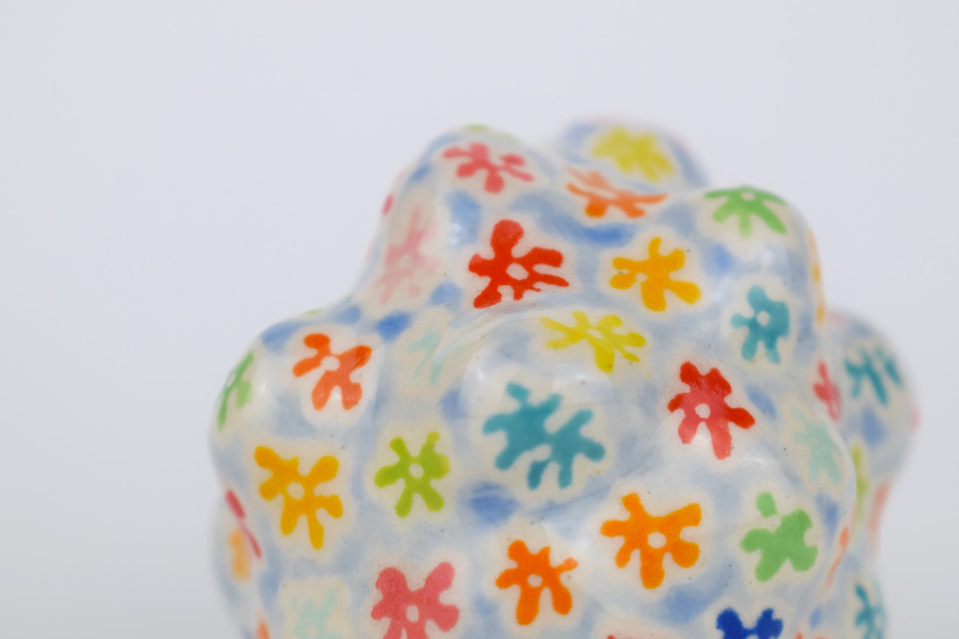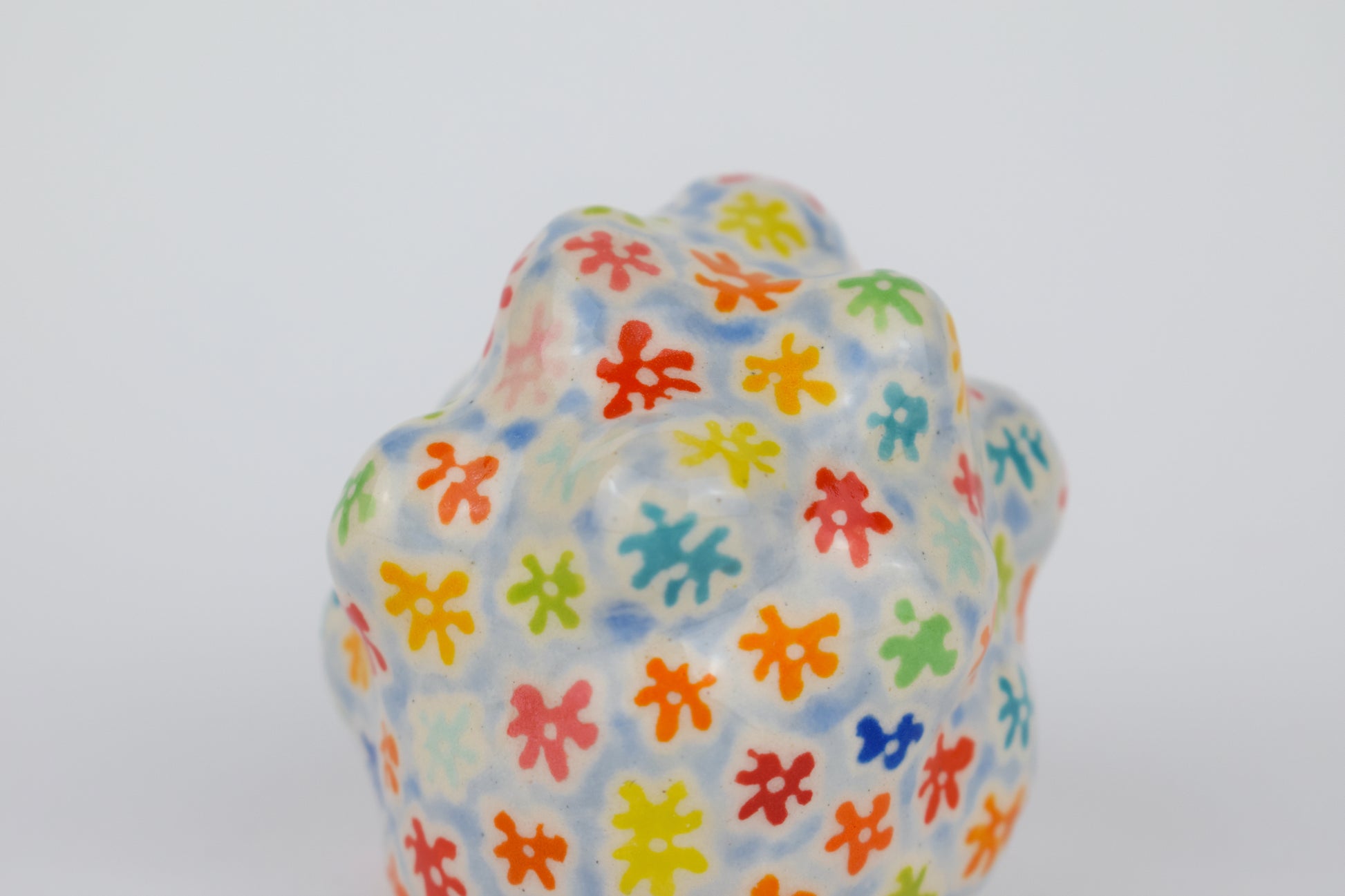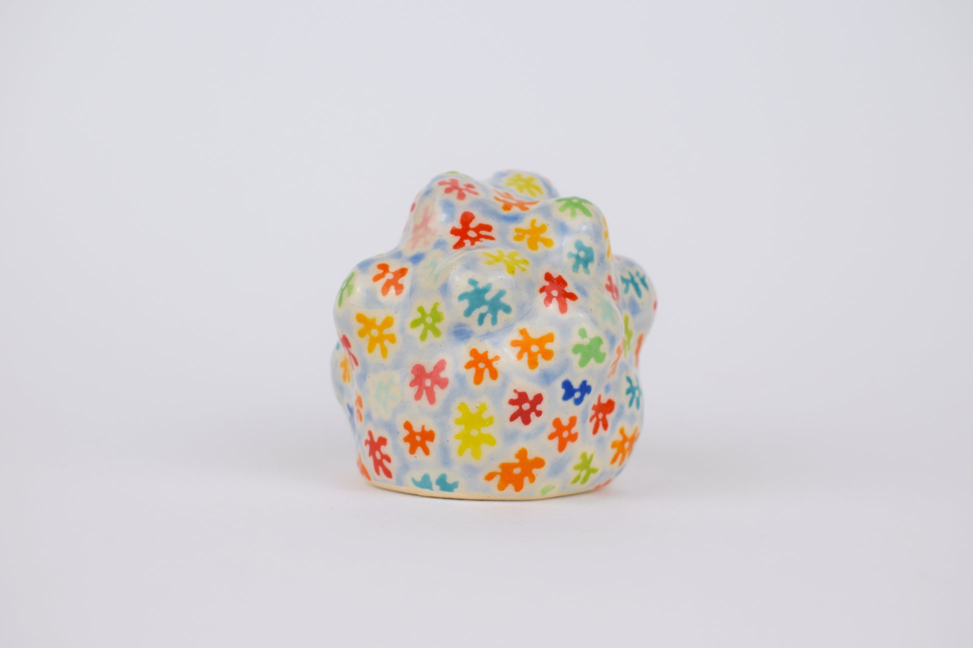 This stoneware mini sculpture has been hand built and painted with vibrant glazes using patterns inspired by nature. Twice fired to over 1000 degrees the ceramic blob can be used as a paper weight, to brighten your mantle piece or as a little colourful friend for your work desk!