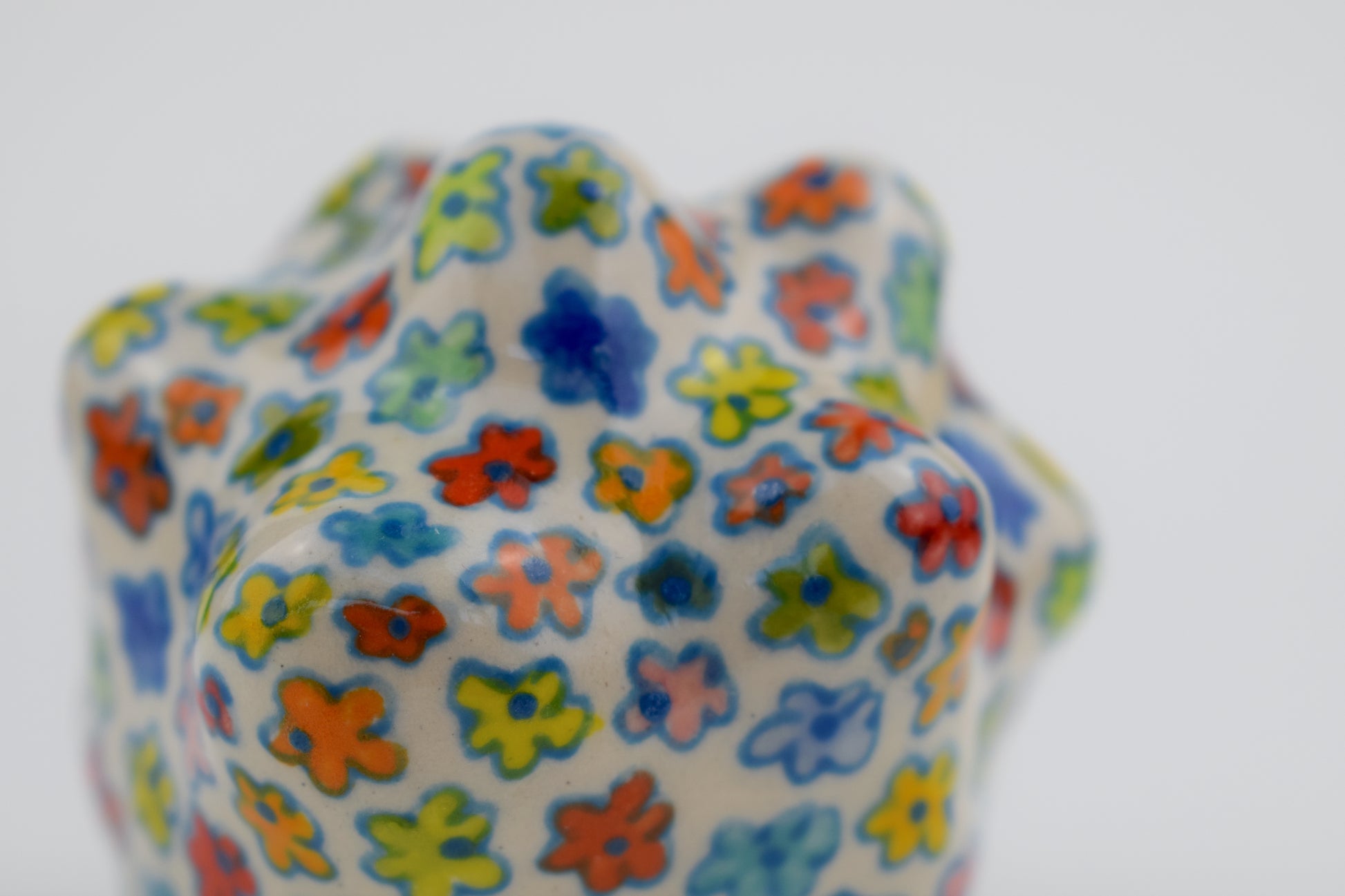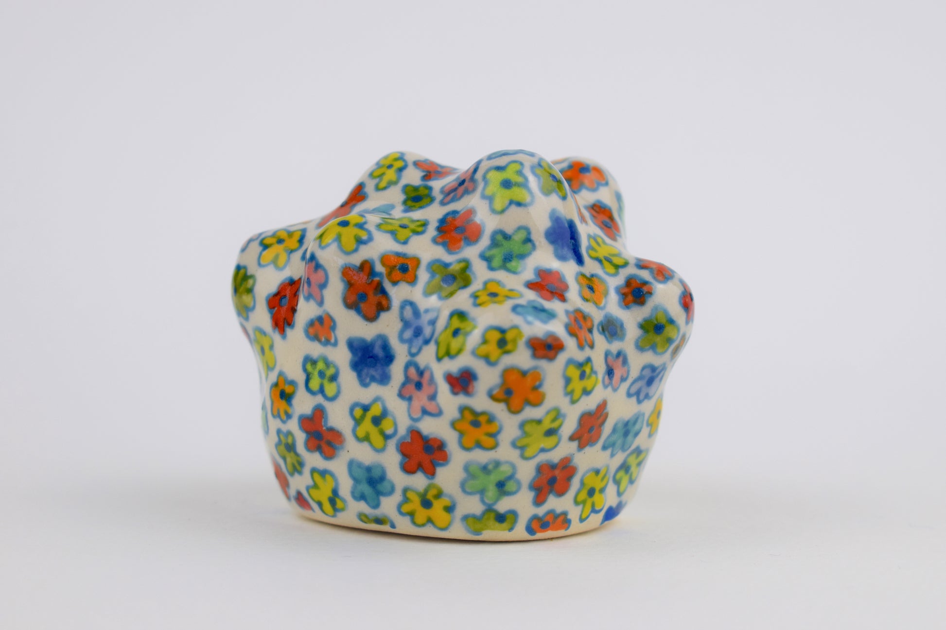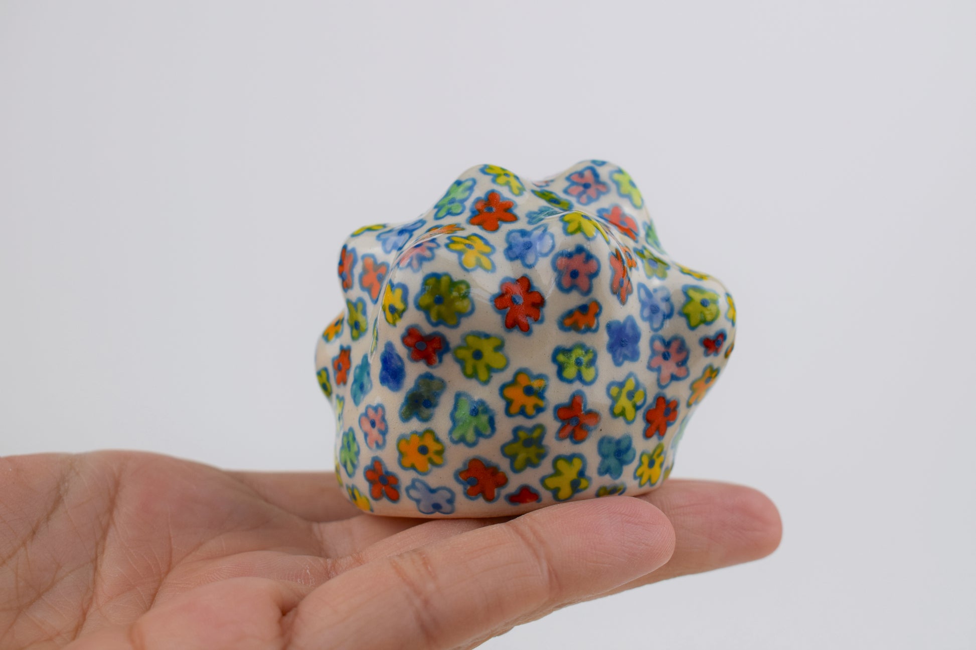 This stoneware mini sculpture has been hand built and painted with vibrant glazes using patterns inspired by nature. Twice fired to over 1000 degrees the ceramic blob can be used as a paper weight, to brighten your mantle piece or as a little colourful friend for your work desk!