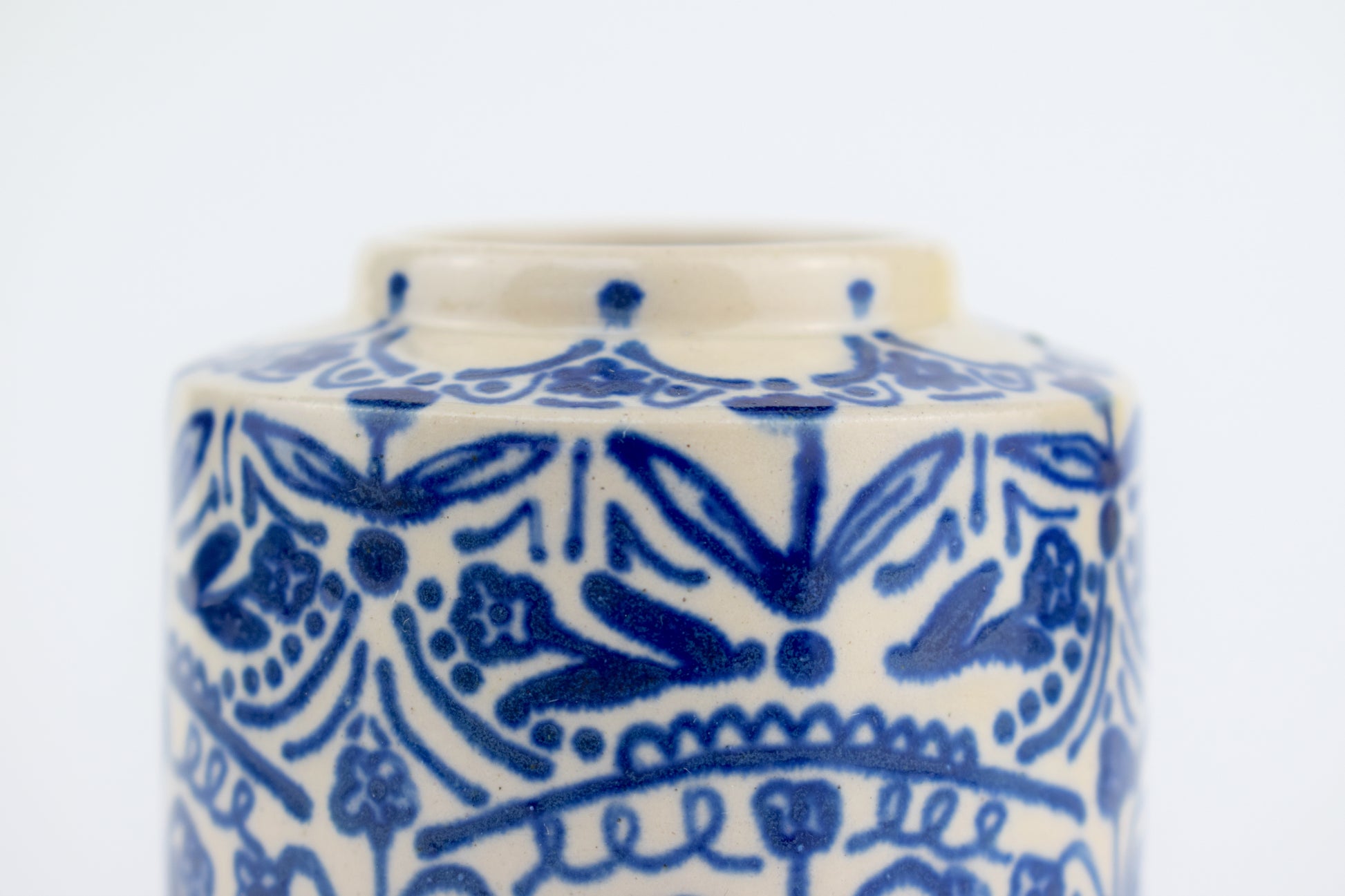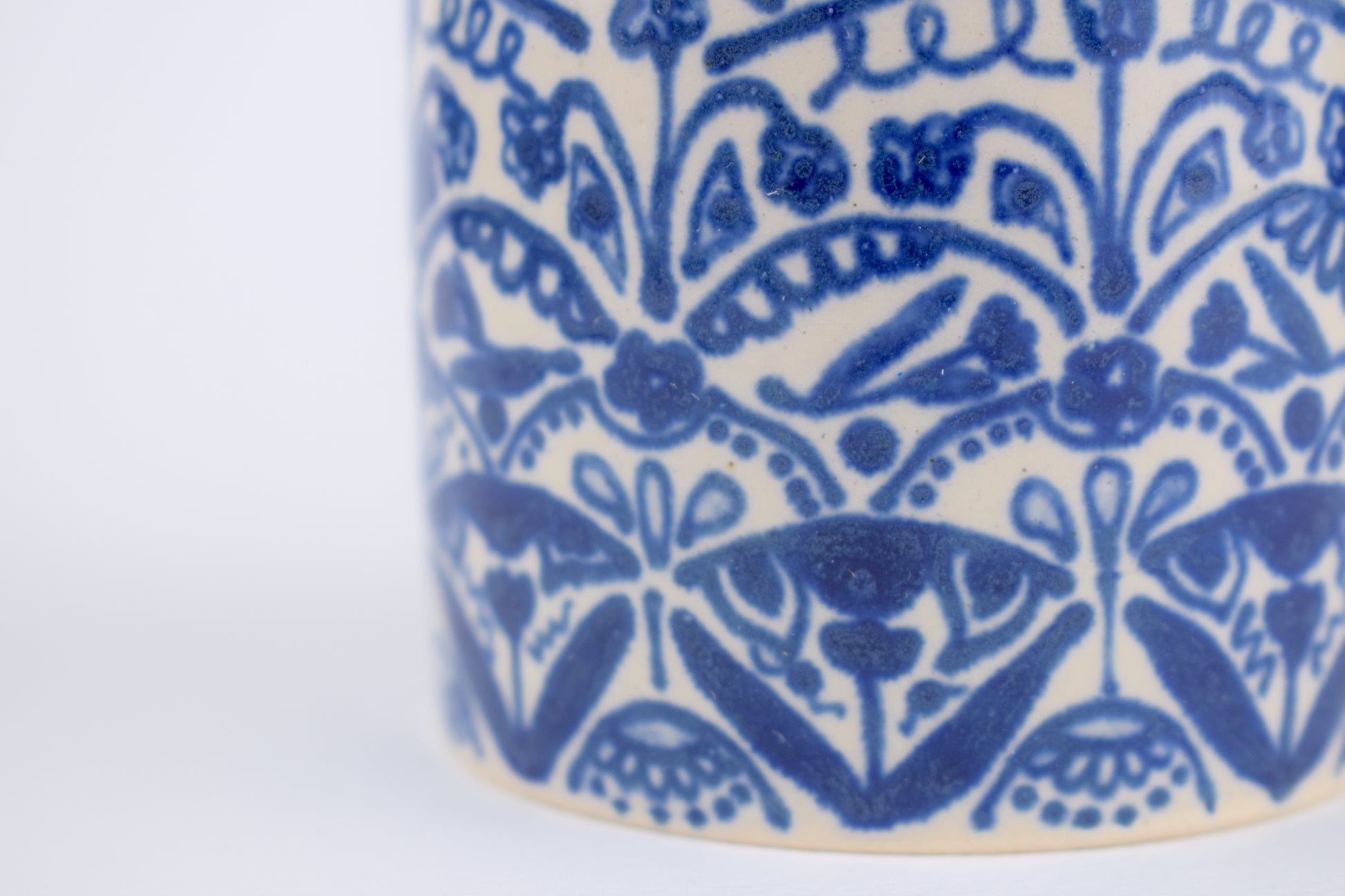 The mini Indigo Bloom Vase is a highly decorative, one-of-a-kind stoneware ceramic, hand-thrown on the potter’s wheel and fired to over 1000°C in my cosy home studio. This piece features a unique floral pattern, created by hand-painting layers of vibrant blue glazes.