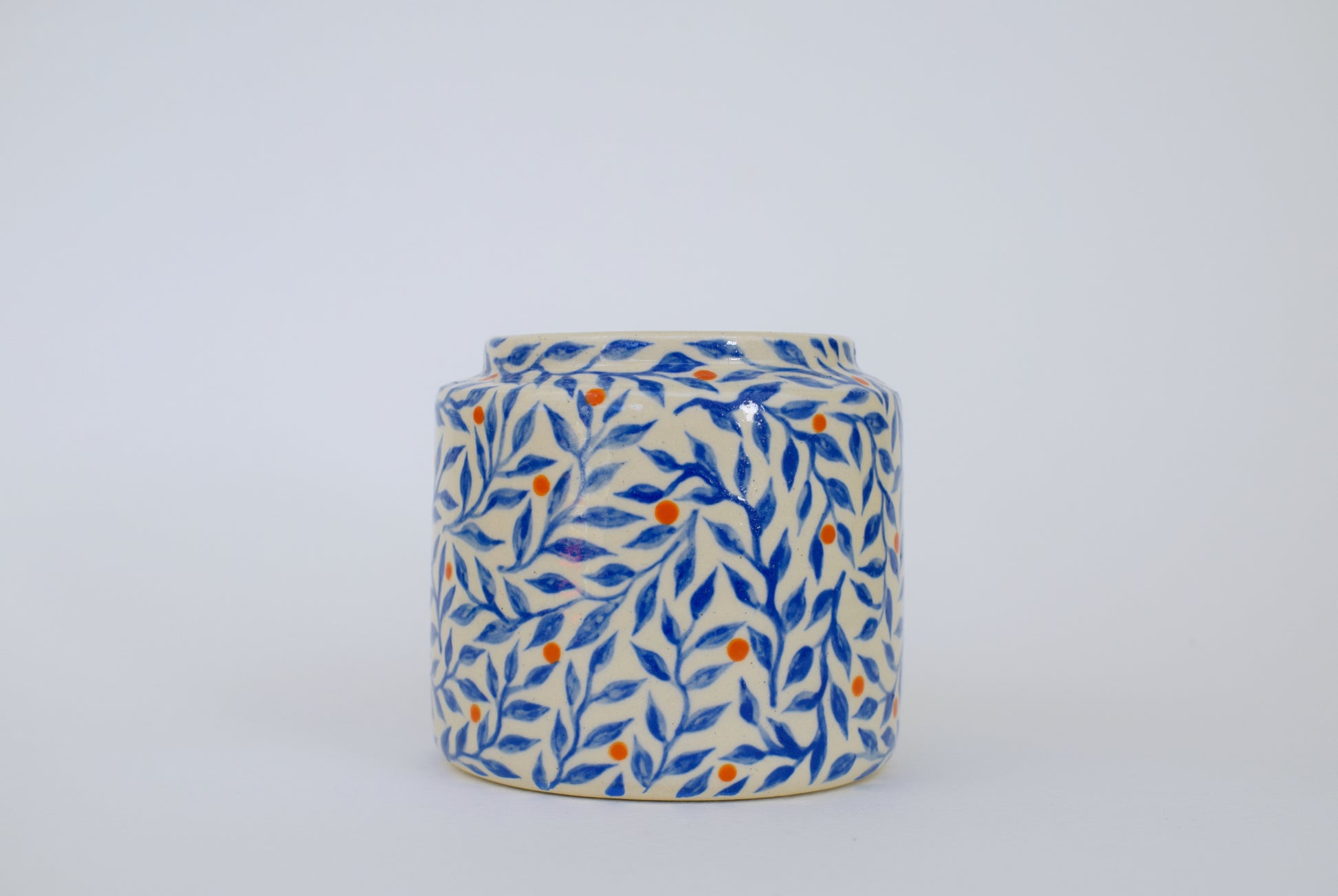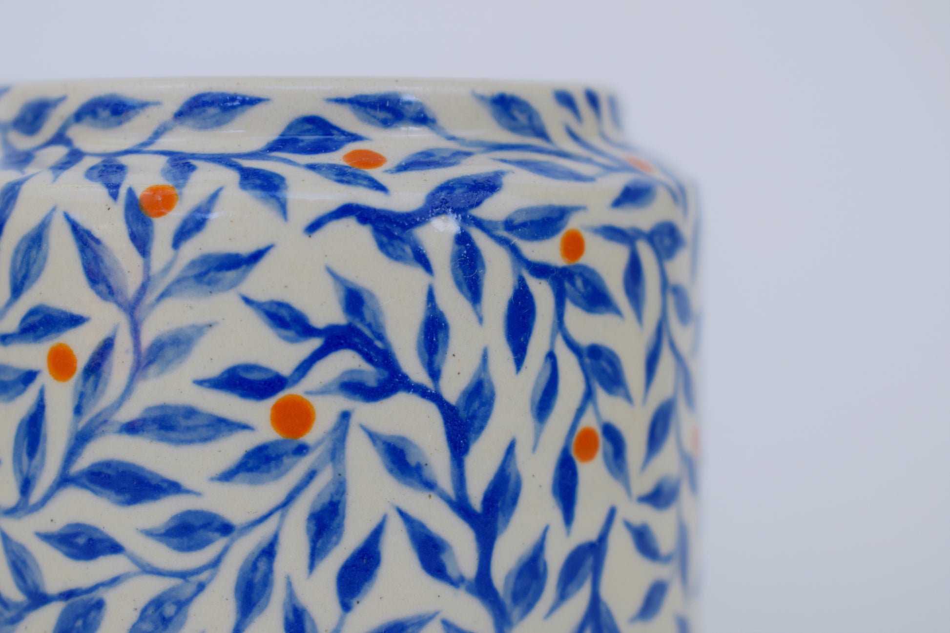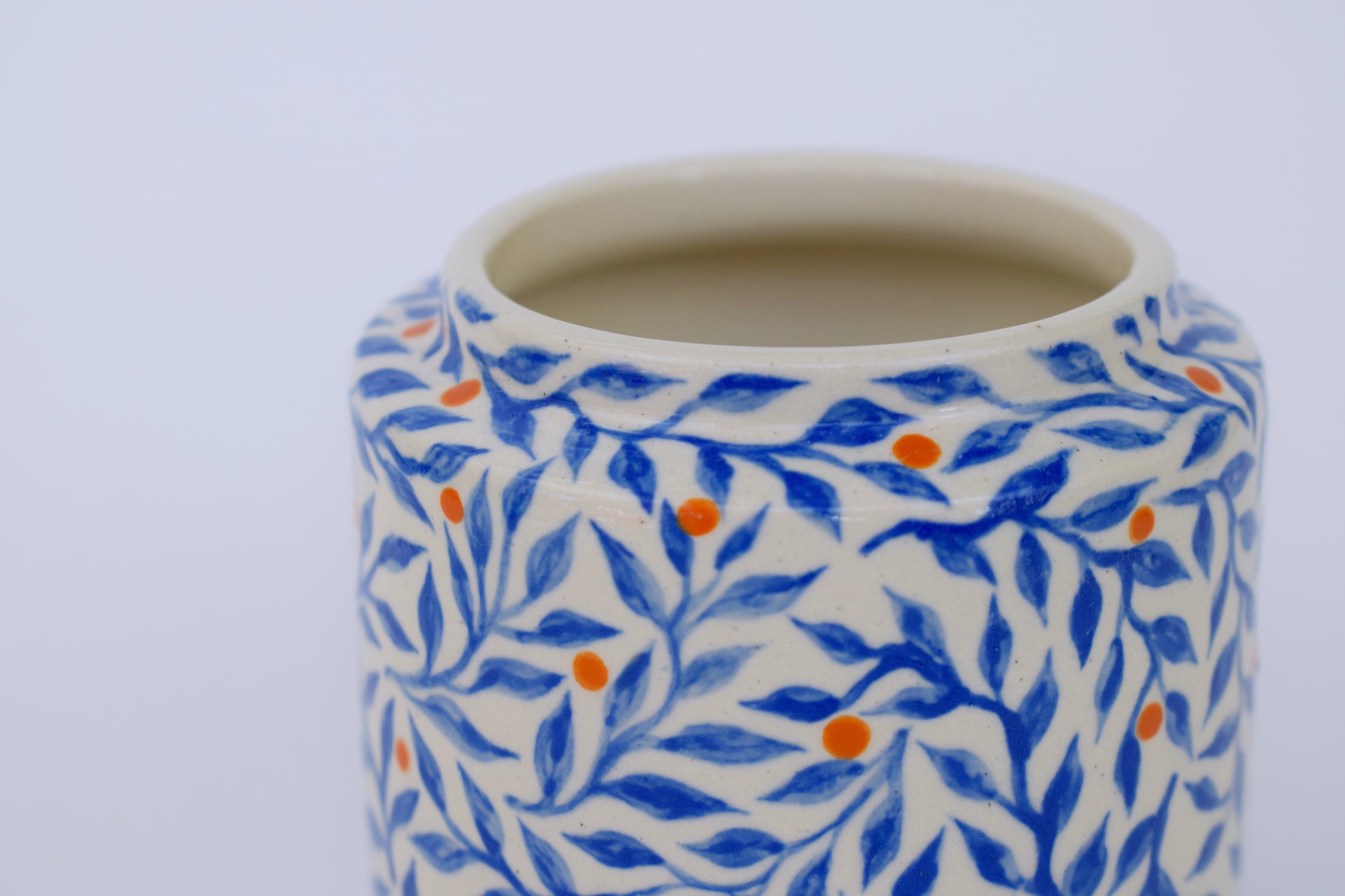 Each vase is a unique stoneware creation, carefully shaped on the potter’s wheel in a cosy home studio. Some are hand-painted, while others are carved with patterns inspired by nature—leaves, textures, and organic forms—creating a subtle, nature-inspired balance between detail and simplicity. The interior is fully sealed with a glossy transparent glaze, making it suitable for fresh or dried stems, or simply as a statement piece on its own.