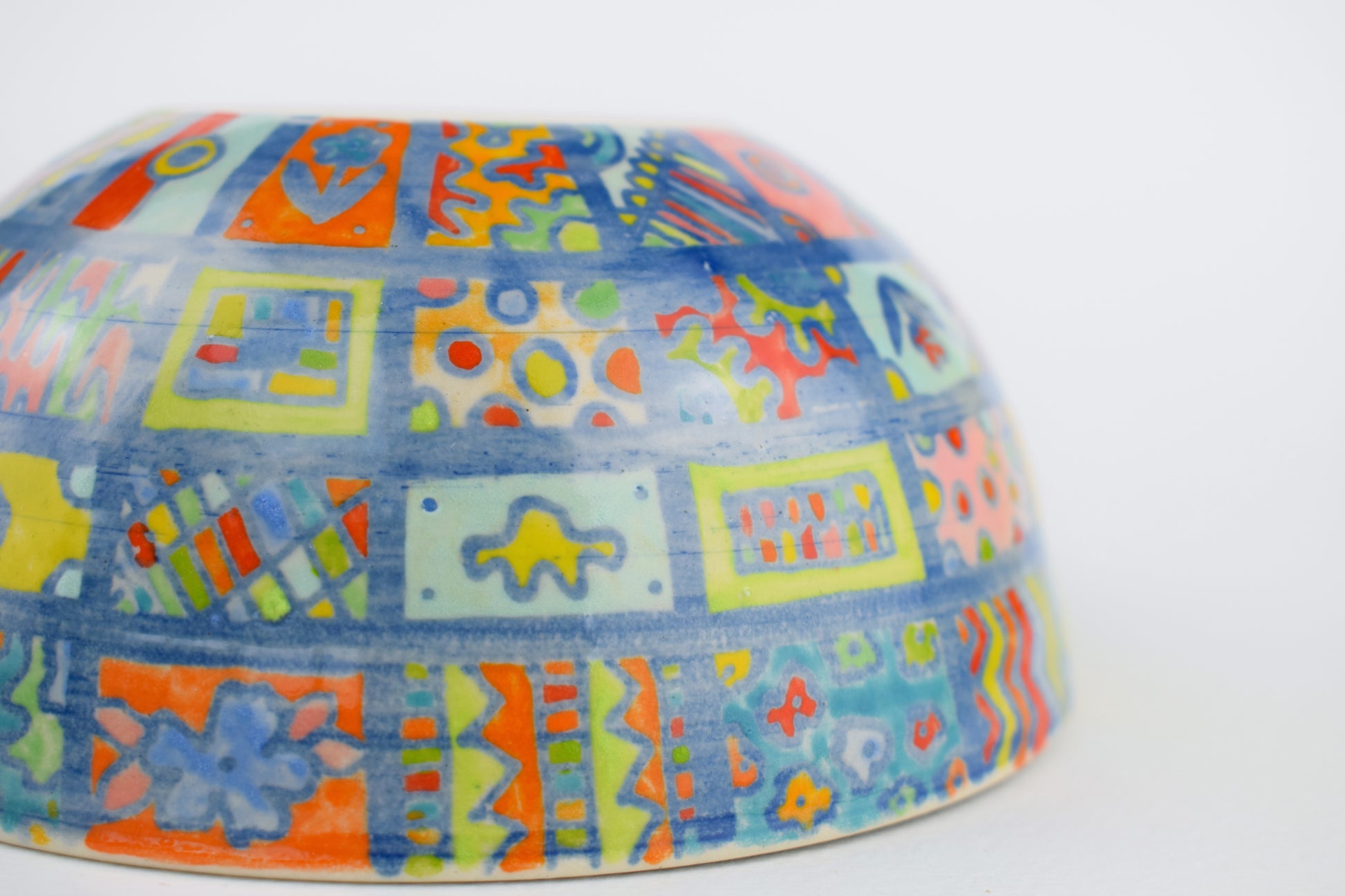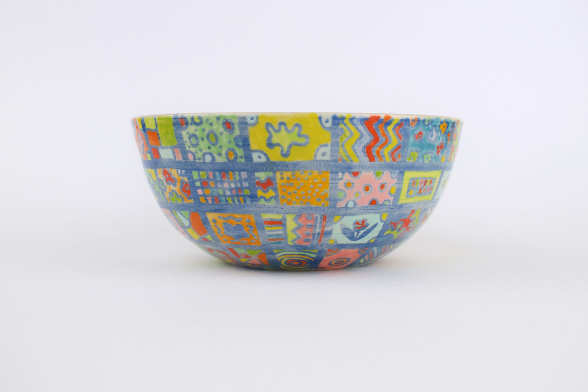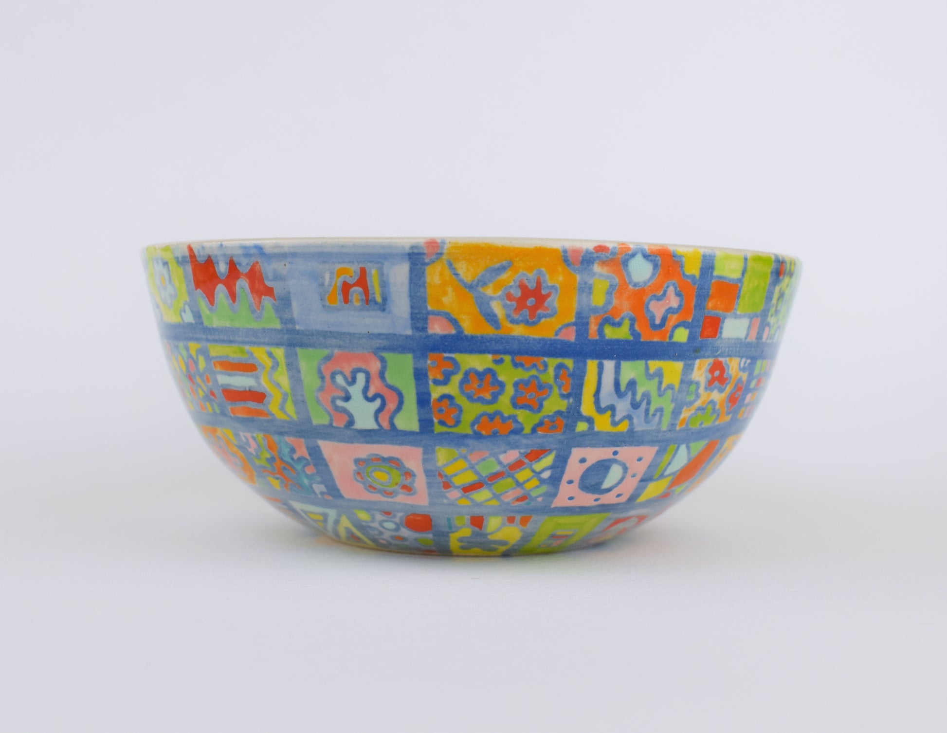 This stoneware bowl has been hand-built and painted with vibrant glazes, featuring a blue grid filled with abstract, colourful drawings — each square like its own tiny artwork. Twice fired to over 1200°C, it brings together structure and spontaneity in a joyful, painterly pattern.