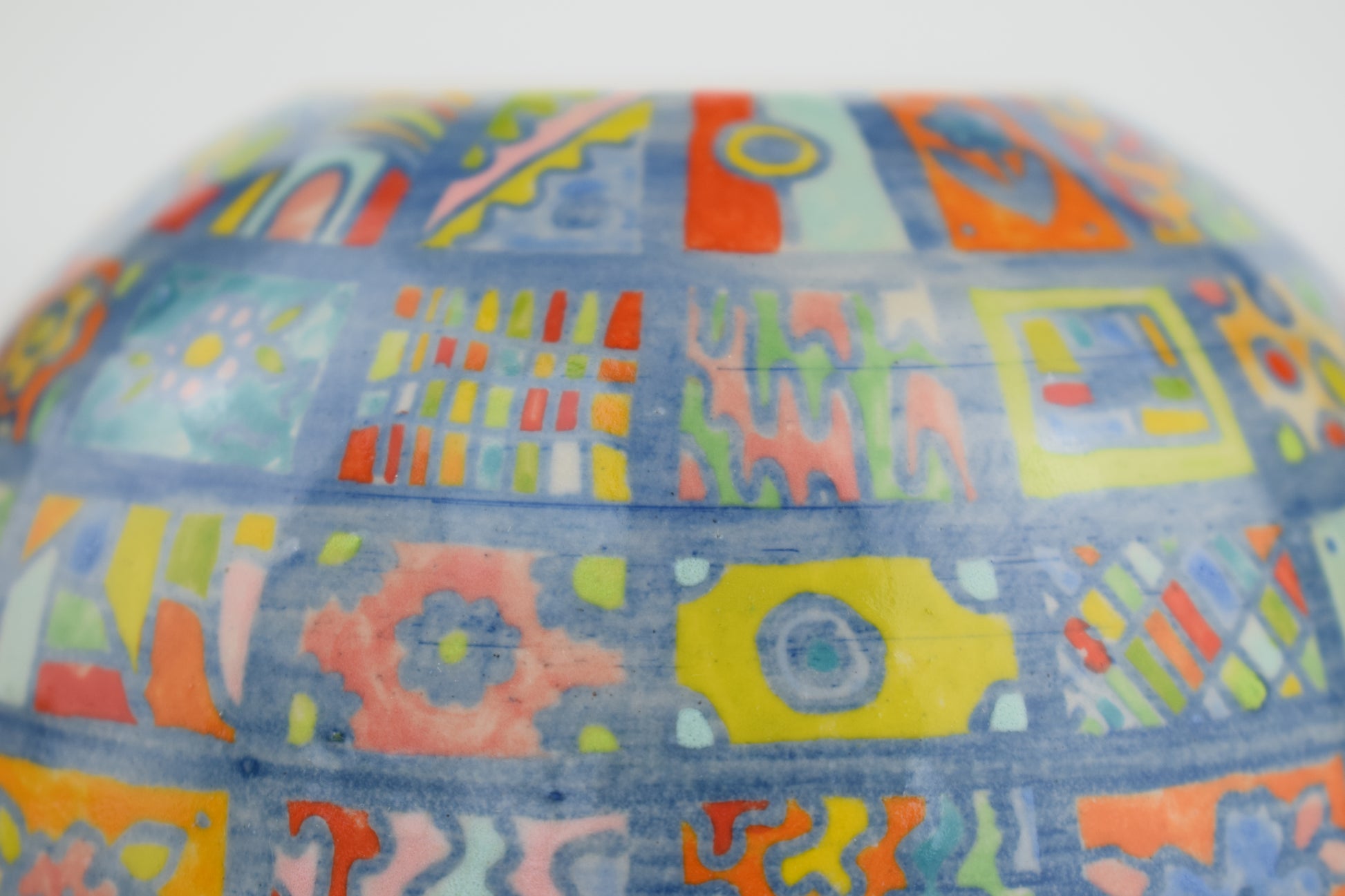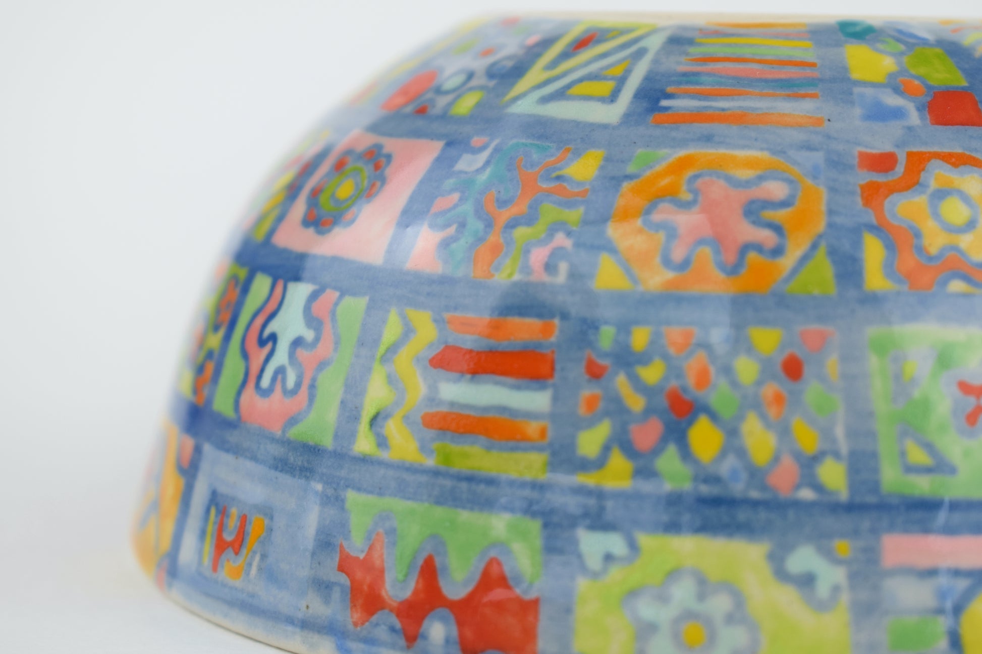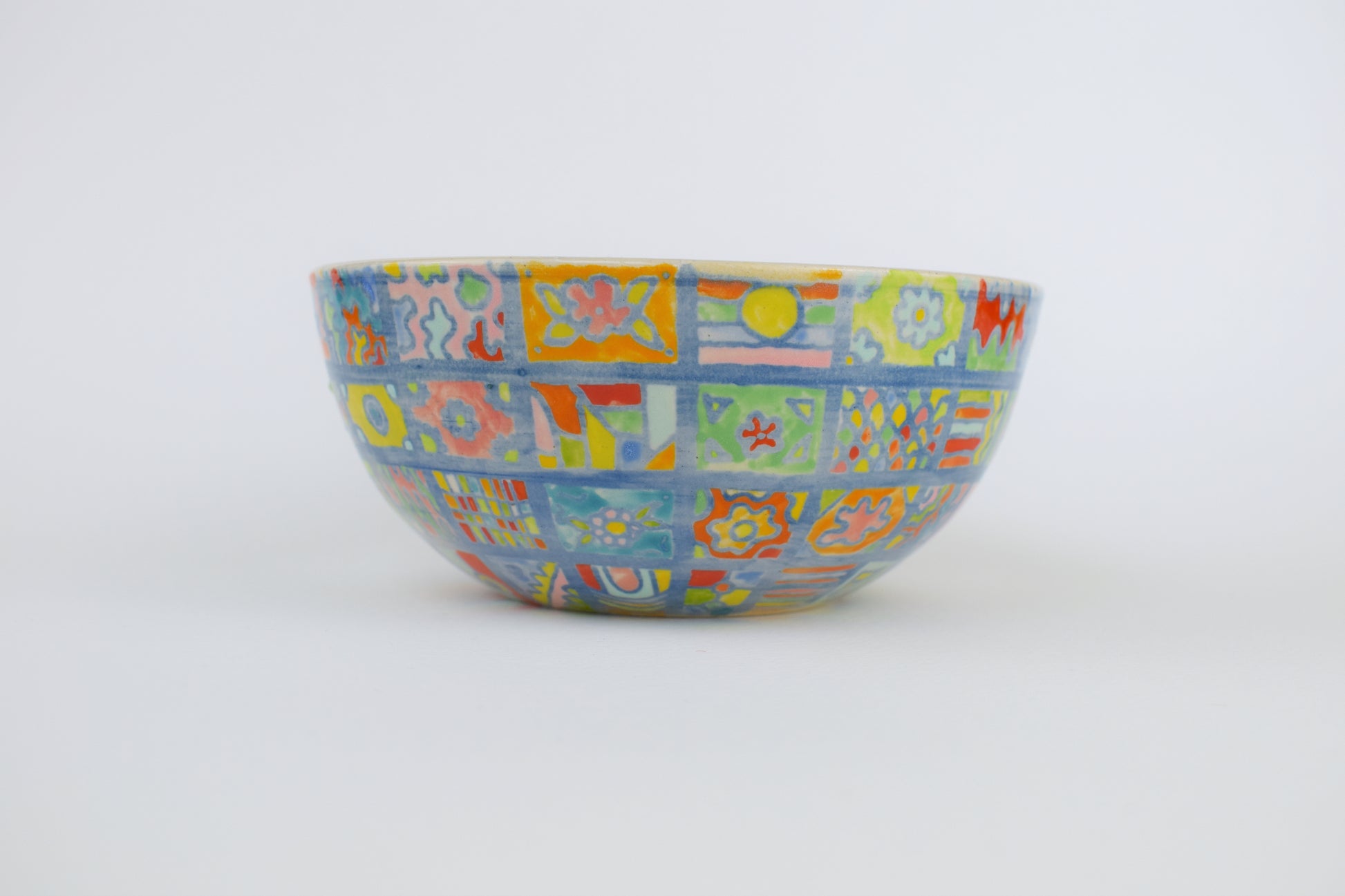 This stoneware bowl has been hand-built and painted with vibrant glazes, featuring a blue grid filled with abstract, colourful drawings — each square like its own tiny artwork. Twice fired to over 1200°C, it brings together structure and spontaneity in a joyful, painterly pattern.
