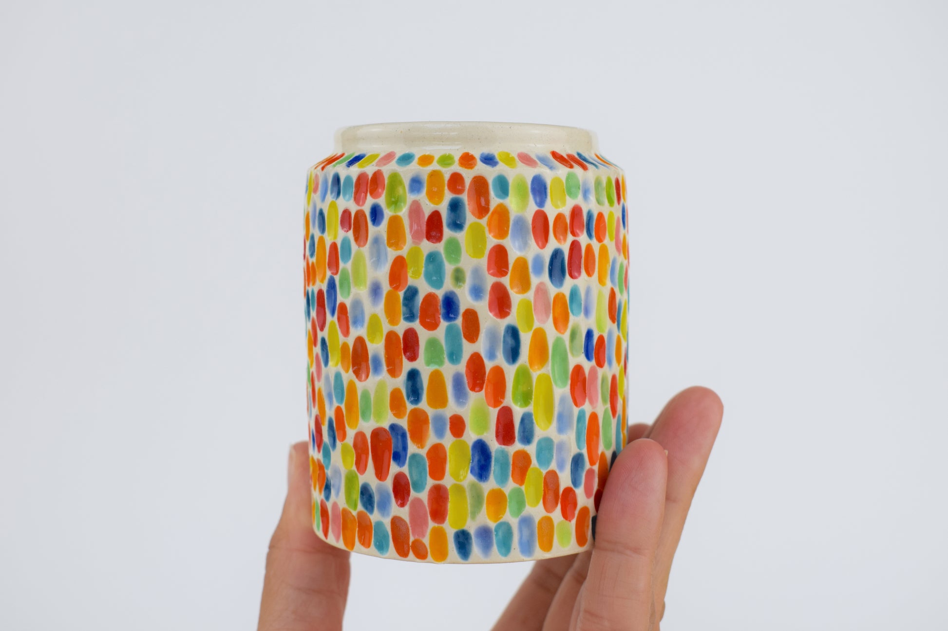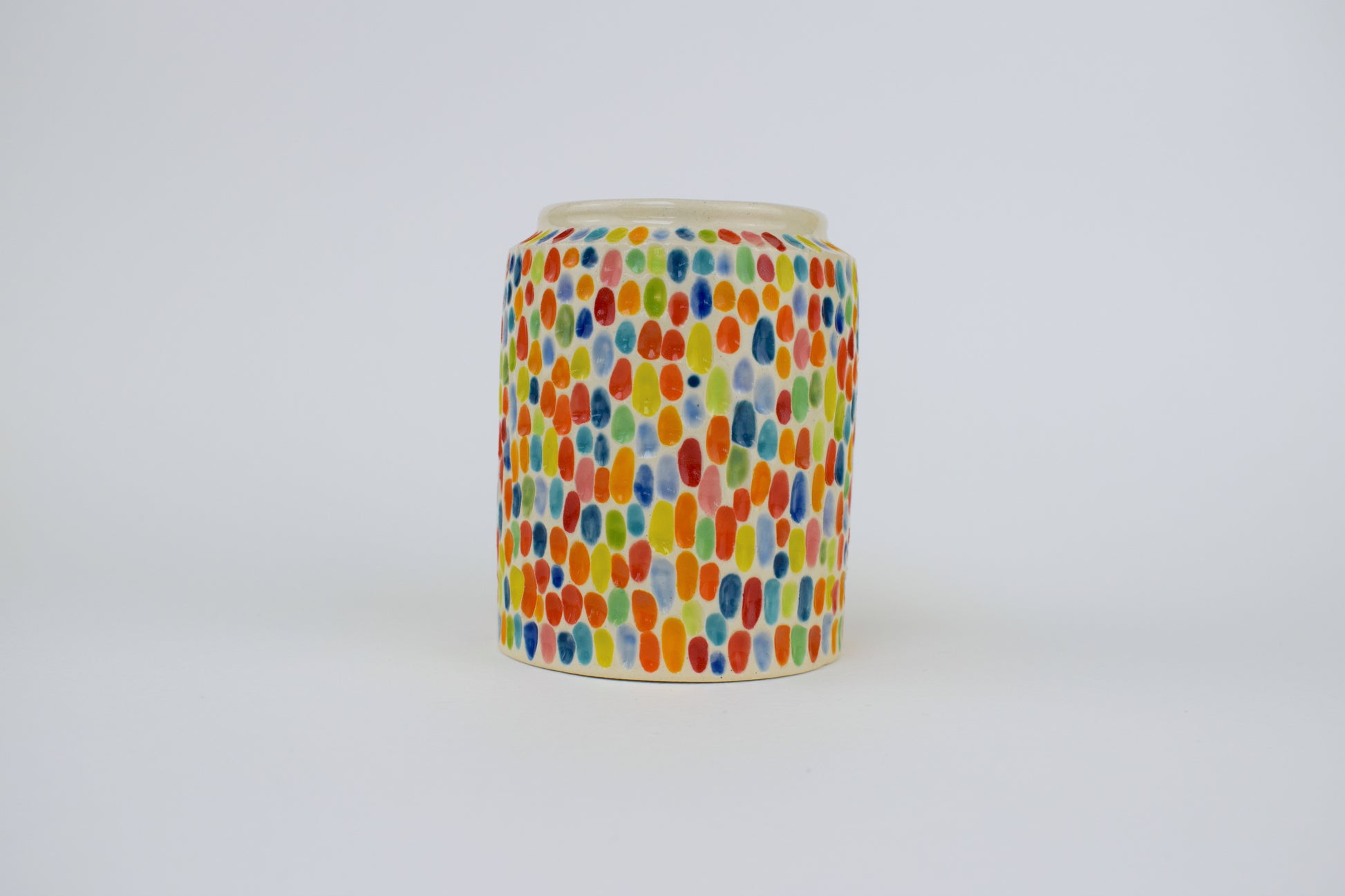 The Carved Colour Mini Vase is a joyful, hand-thrown ceramic made in my cosy home studio. Fired to over 1200°C, this one-of-a-kind vase features a carved surface — each carefully filled with hand-painted rainbow glazes.