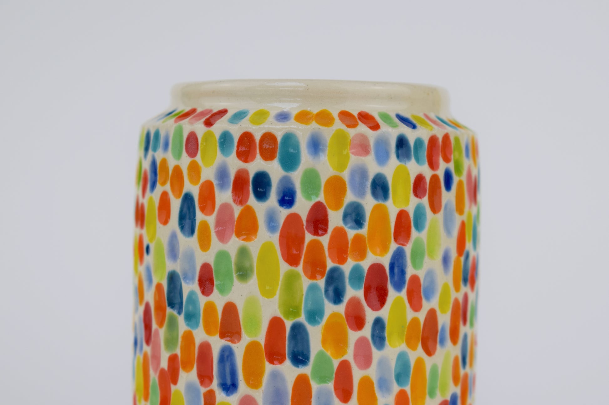 Every colourful carving adds a sculptural and playful feel, creating a tactile surface that’s as delightful to touch as it is to look at. The interior is finished with a glossy transparent glaze, making the vase fully sealed and ready for a single flower stem, a small bunch, or simply as a bright, bold statement piece in your home.