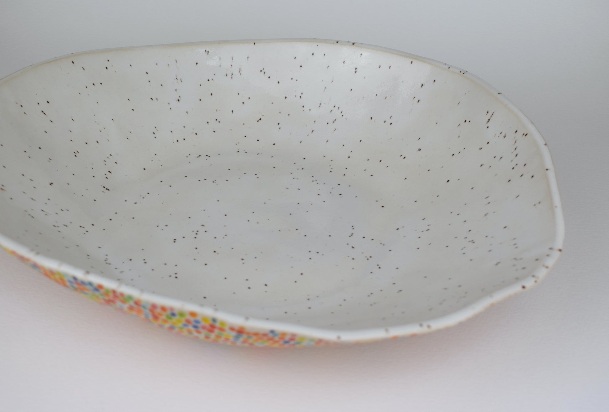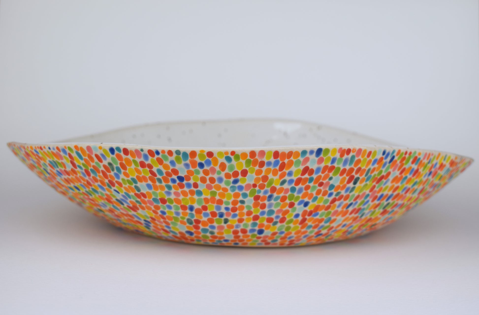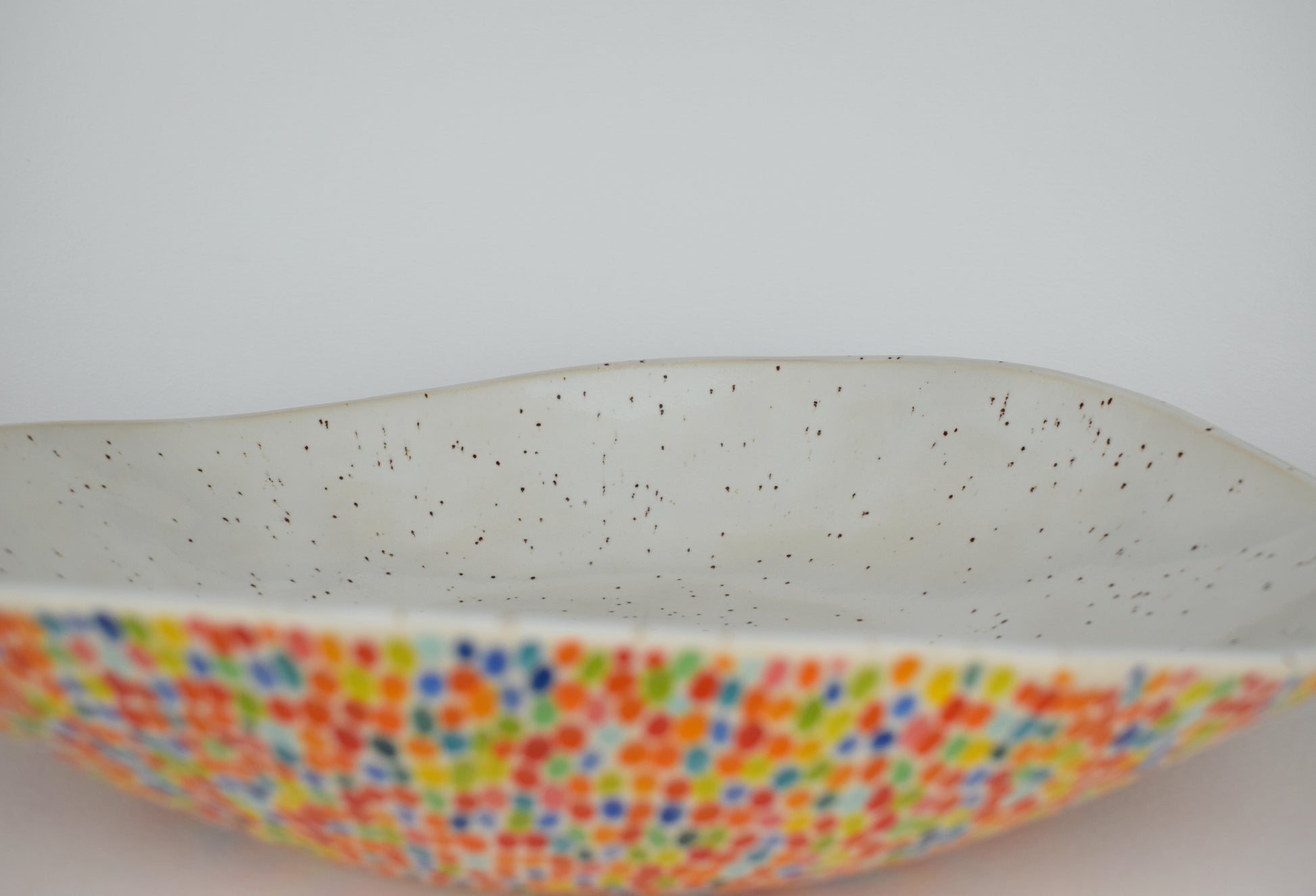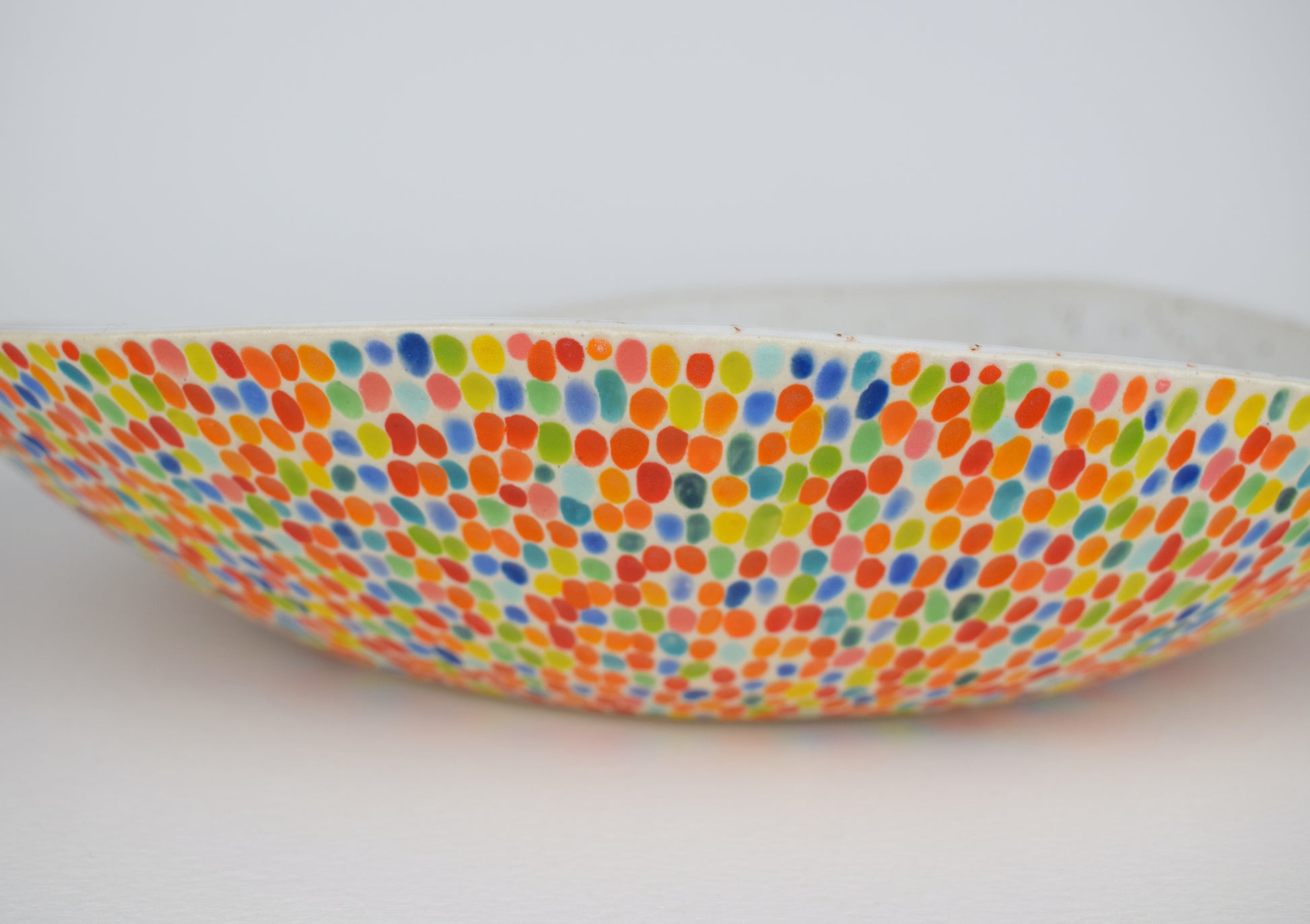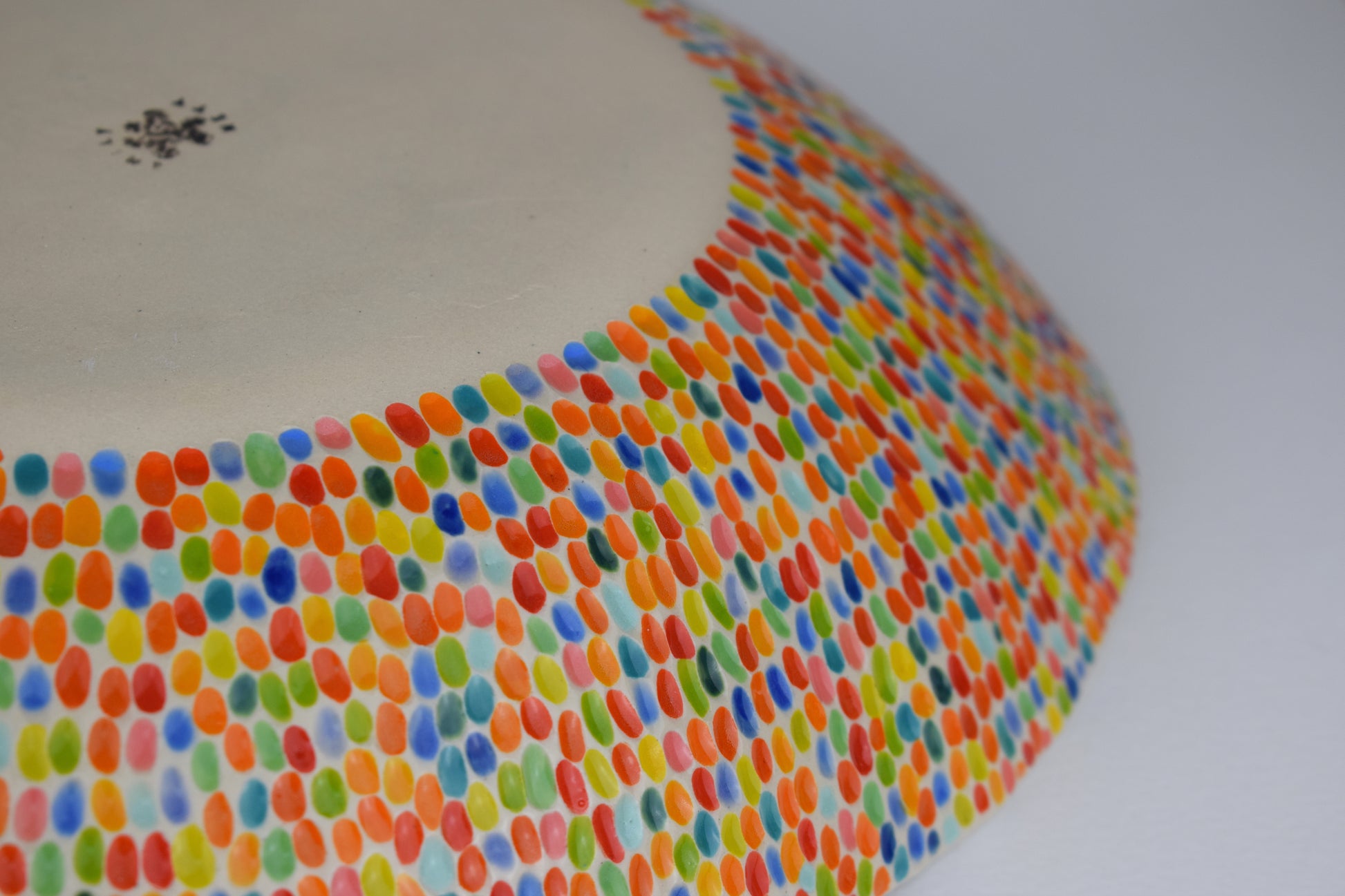 This handmade stoneware fruit bowl is designed to bring colour, texture, and joy into your everyday kitchen rituals. Each bowl is carefully carved by hand, with every individual mark painted in a different colour, creating a playful, confetti-like surface that feels alive with movement and detail.