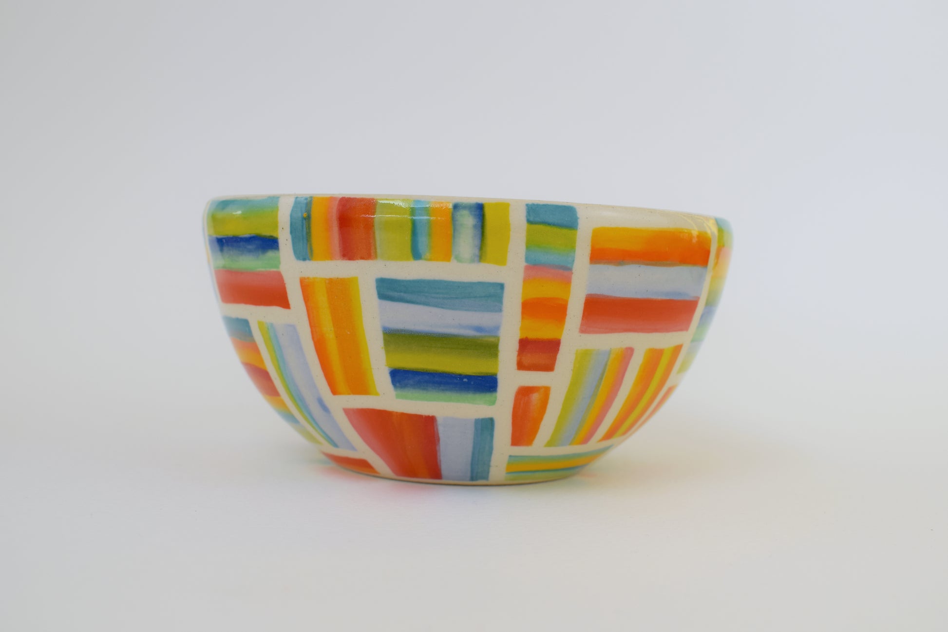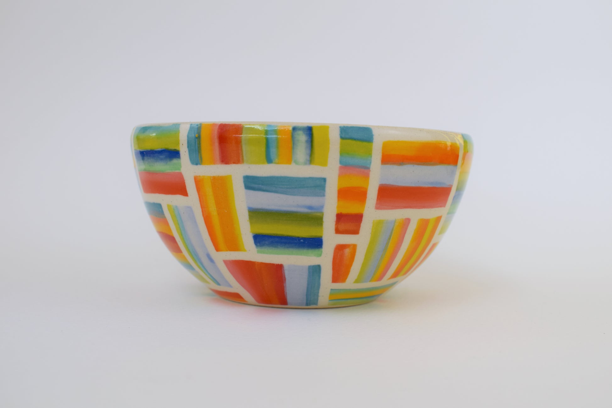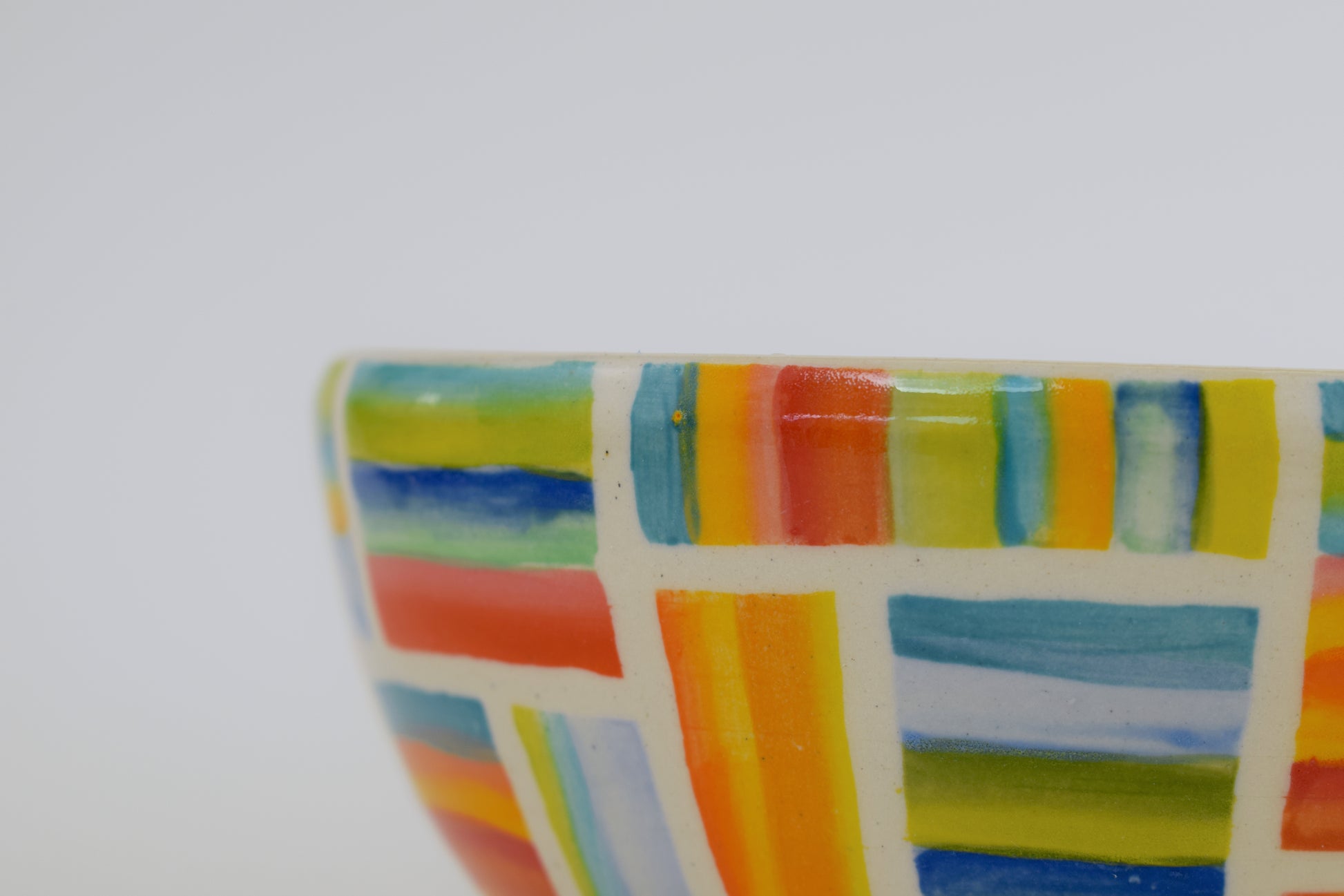 This hand-built stoneware bowl features a structured square pattern, with a bold stripe running down the centre of each one. Glazed in vibrant, joyful colours and twice fired to over 1200°C, it’s food-safe and ready to bring a playful rhythm to your table. The repeating design gives the bowl a sense of movement — a patchwork of colour and line that feels both balanced and full of character.