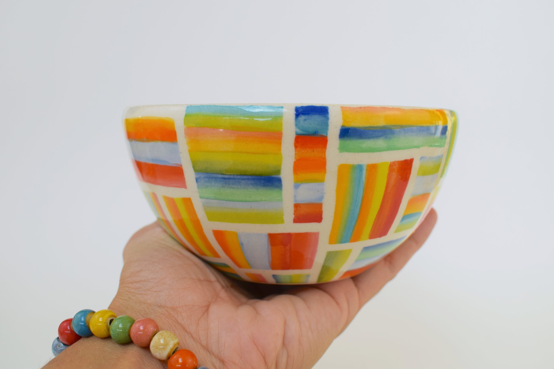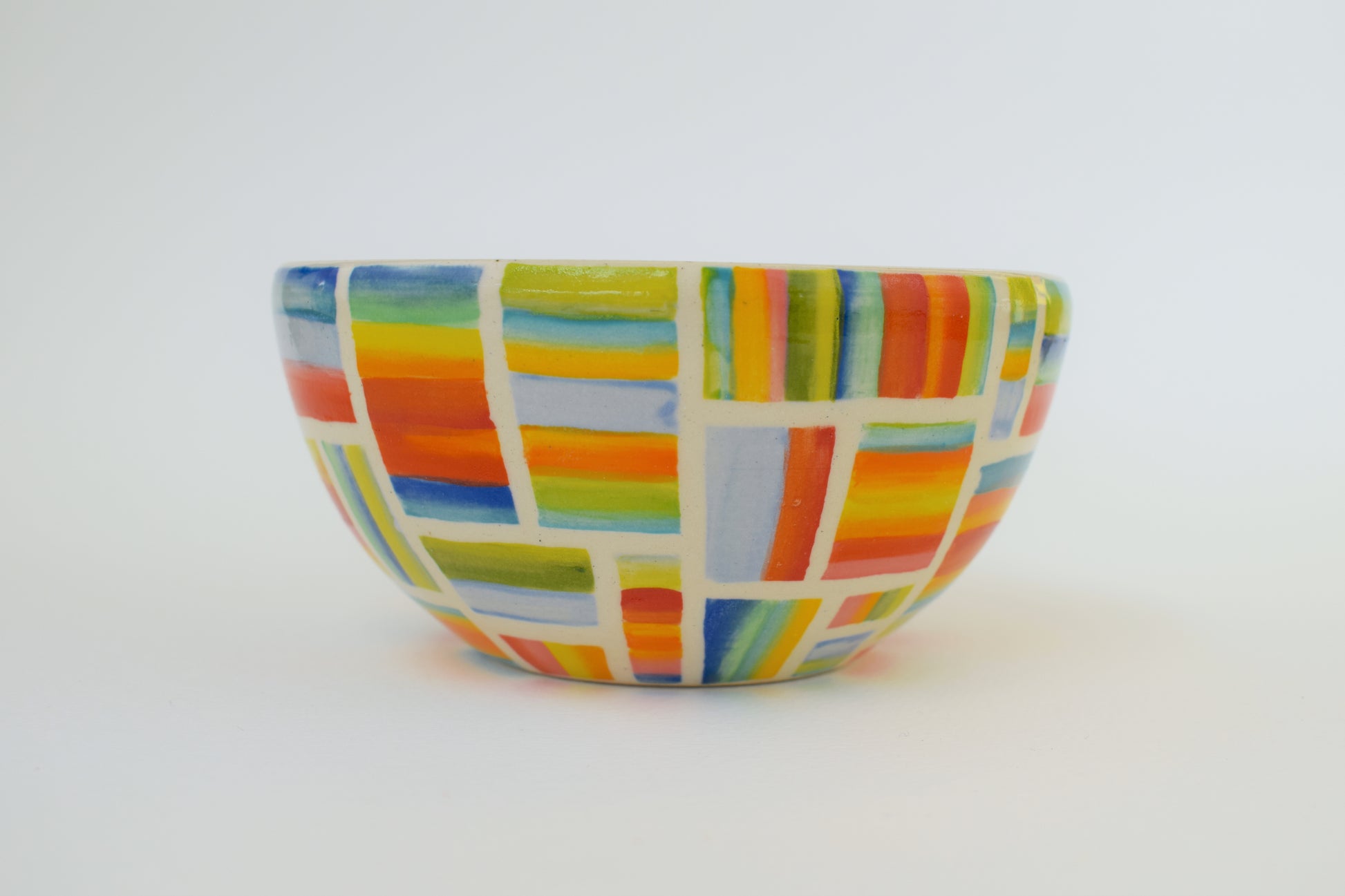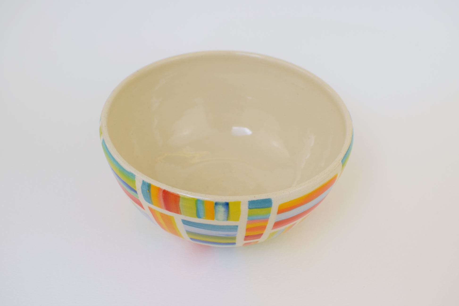 This hand-built stoneware bowl features a structured square pattern, with a bold stripe running down the centre of each one. Glazed in vibrant, joyful colours and twice fired to over 1200°C, it’s food-safe and ready to bring a playful rhythm to your table. The repeating design gives the bowl a sense of movement — a patchwork of colour and line that feels both balanced and full of character.