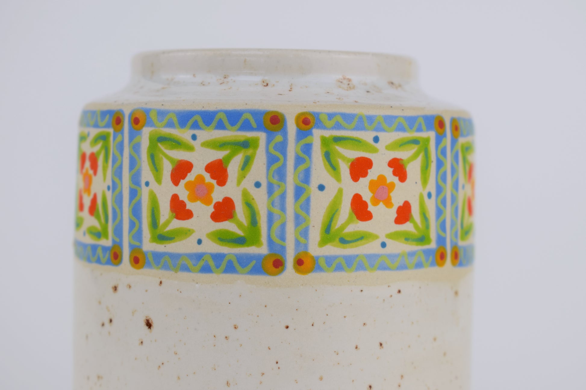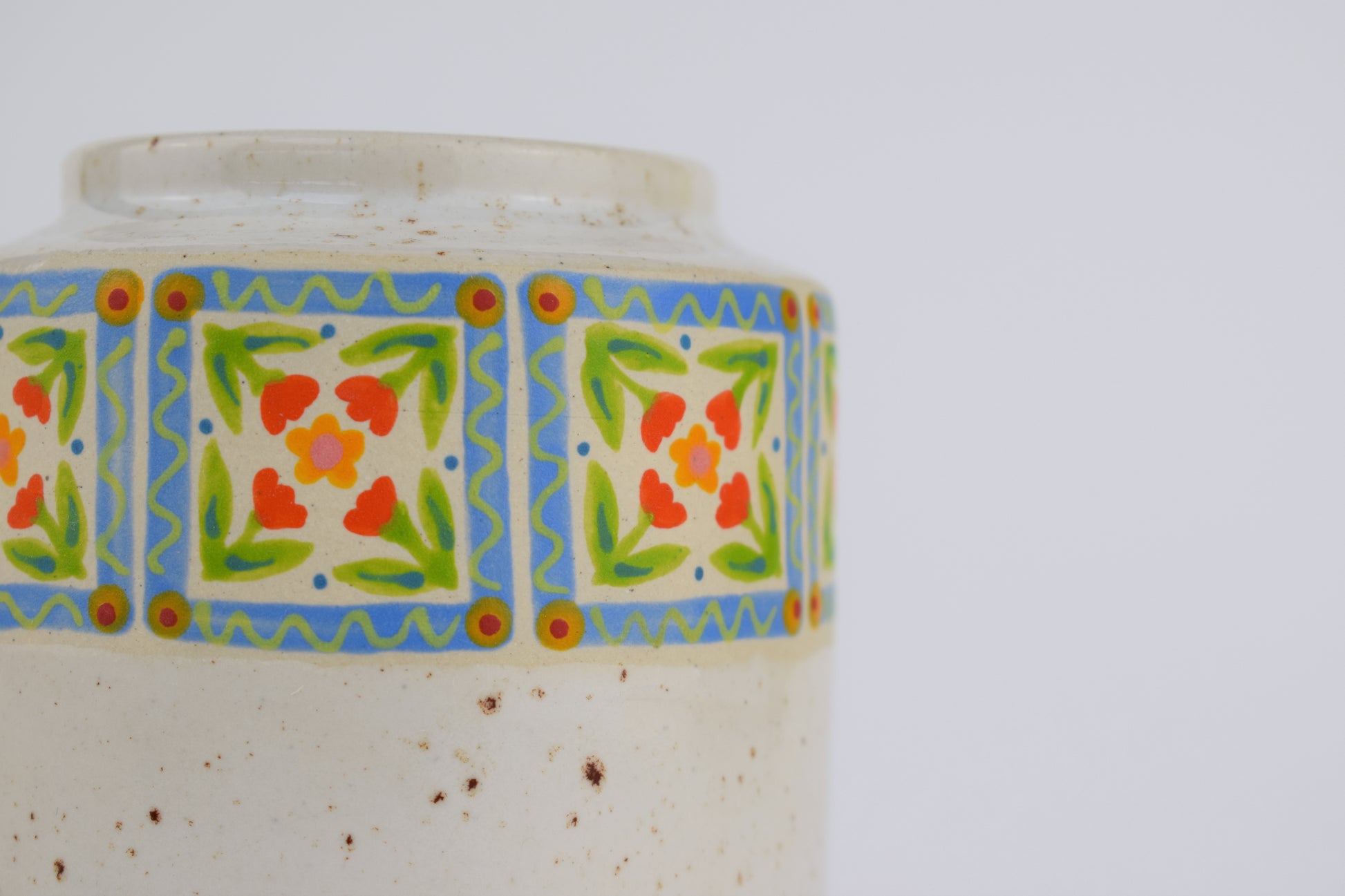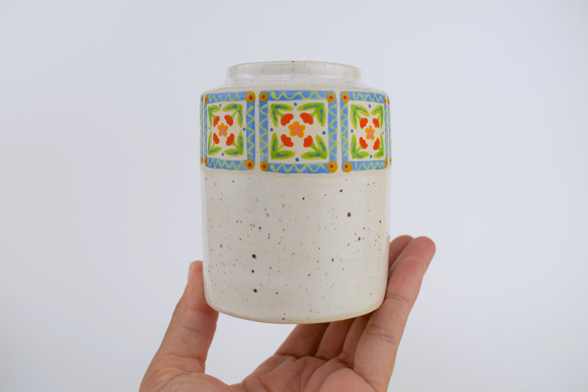 The Blossom Border Mini Vase is a highly decorative stoneware ceramic, hand-thrown on the potter’s wheel and made in my cosy home studio. Fired to over 1200°C, this one-of-a-kind piece features a striking band of hand-painted, matte floral motifs around the rim, contrasting beautifully with a gently speckled glaze covering the rest of the surface.