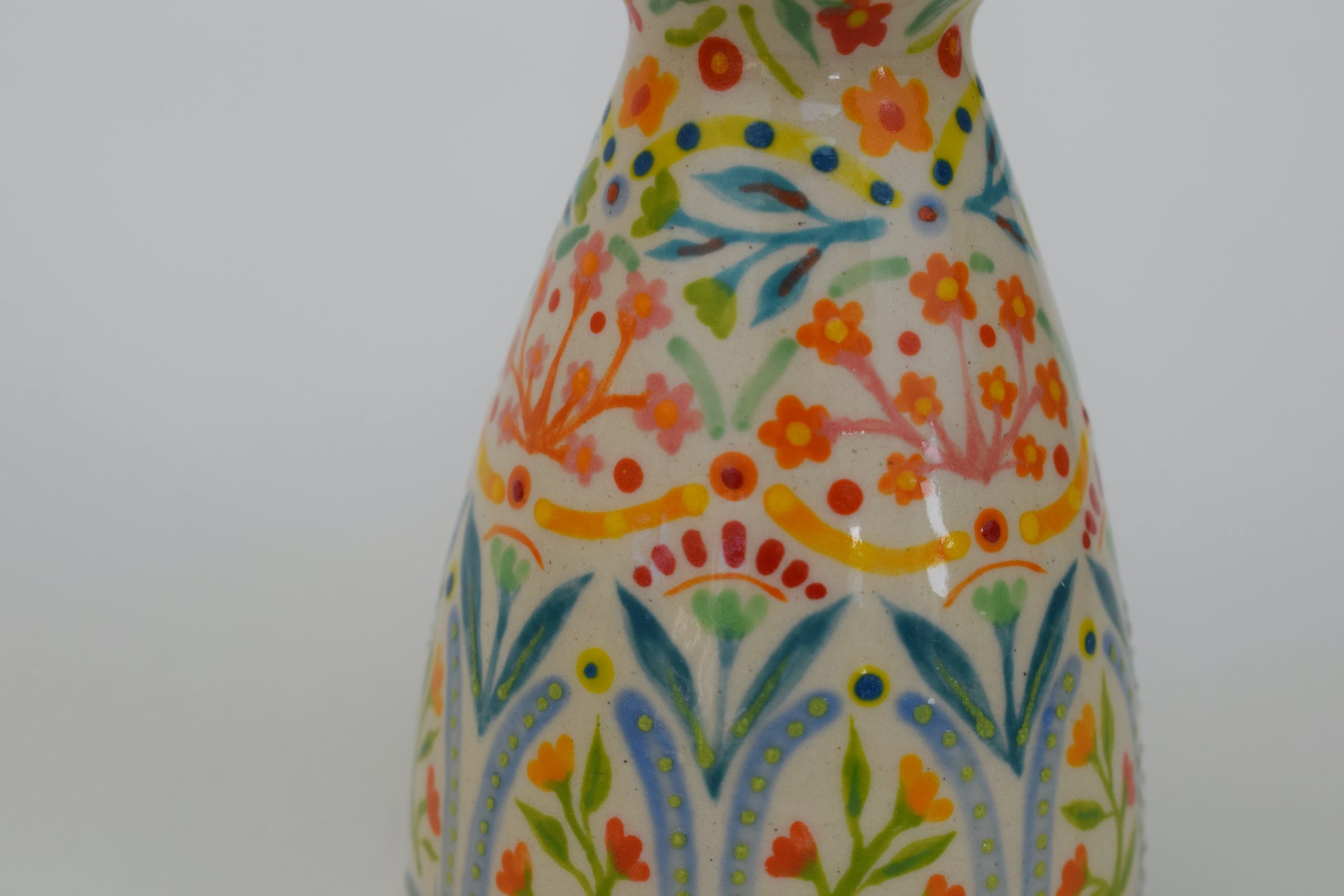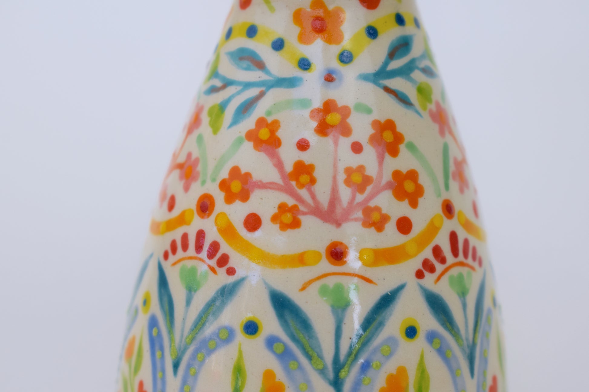 Each vase is a unique stoneware creation, carefully shaped on the potter’s wheel in a cosy home studio. Some are hand-painted, while others are carved with patterns inspired by nature—leaves, textures, and organic forms—creating a subtle, nature-inspired balance between detail and simplicity. The interior is fully sealed with a glossy transparent glaze, making it suitable for fresh or dried stems, or simply as a statement piece on its own.