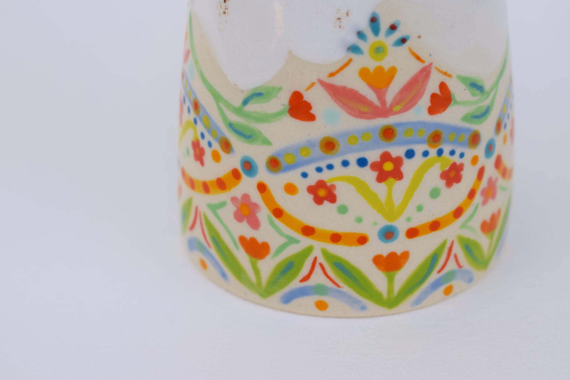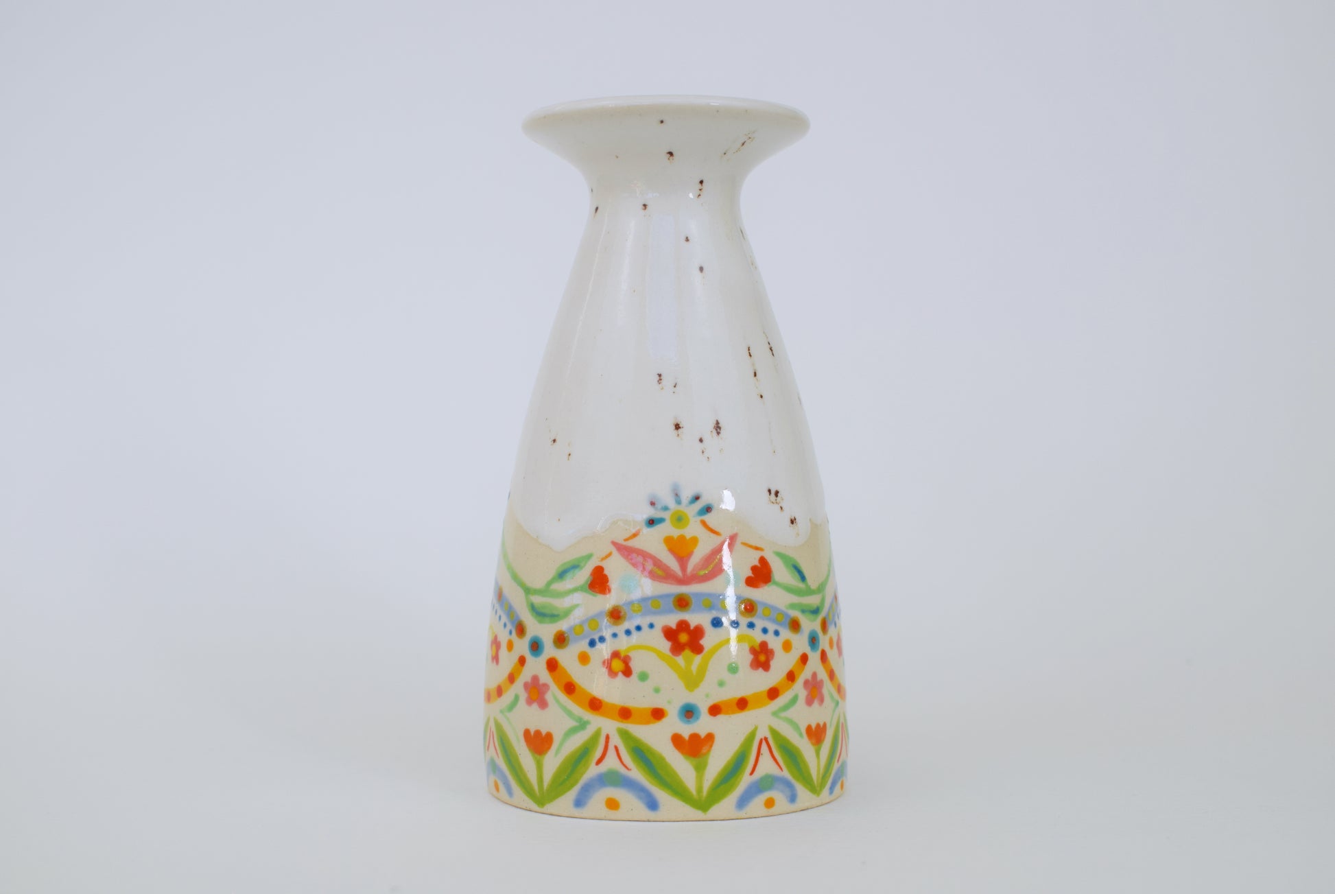 Each vase is a unique stoneware creation, carefully shaped on the potter’s wheel in a cosy home studio. Some are hand-painted, while others are carved with patterns inspired by nature—leaves, textures, and organic forms—creating a subtle, nature-inspired balance between detail and simplicity. The interior is fully sealed with a glossy transparent glaze, making it suitable for fresh or dried stems, or simply as a statement piece on its own.