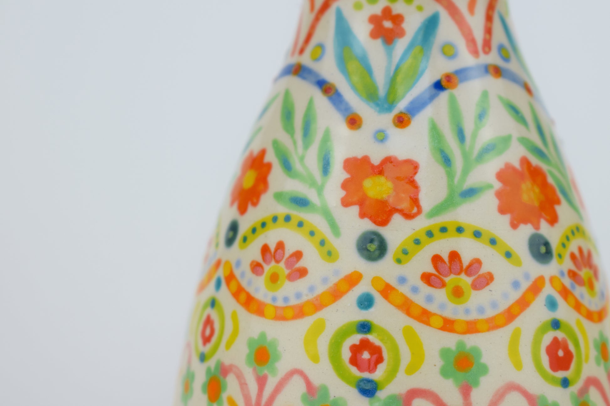 Each vase is a unique stoneware creation, carefully shaped on the potter’s wheel in a cosy home studio. Some are hand-painted, while others are carved with patterns inspired by nature—leaves, textures, and organic forms—creating a subtle, nature-inspired balance between detail and simplicity. The interior is fully sealed with a glossy transparent glaze, making it suitable for fresh or dried stems, or simply as a statement piece on its own.
