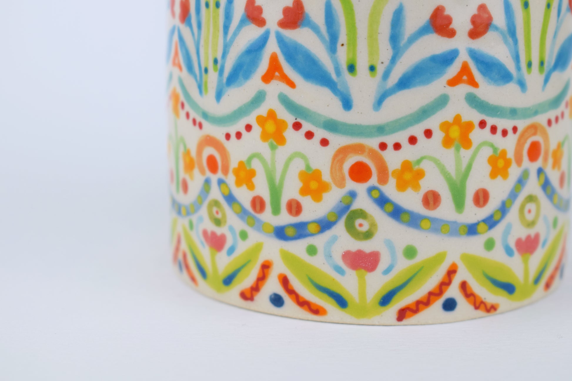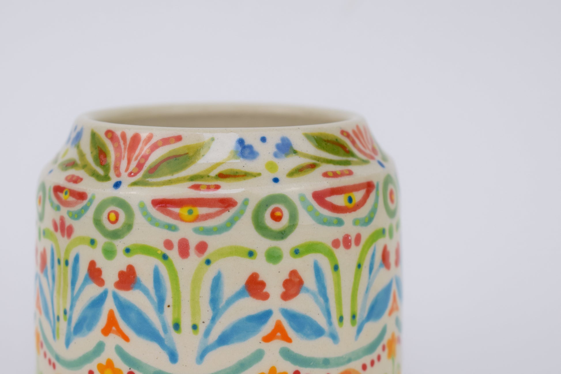 Each vase is a unique stoneware creation, carefully shaped on the potter’s wheel in a cosy home studio. Some are hand-painted, while others are carved with patterns inspired by nature—leaves, textures, and organic forms—creating a subtle, nature-inspired balance between detail and simplicity. The interior is fully sealed with a glossy transparent glaze, making it suitable for fresh or dried stems, or simply as a statement piece on its own.