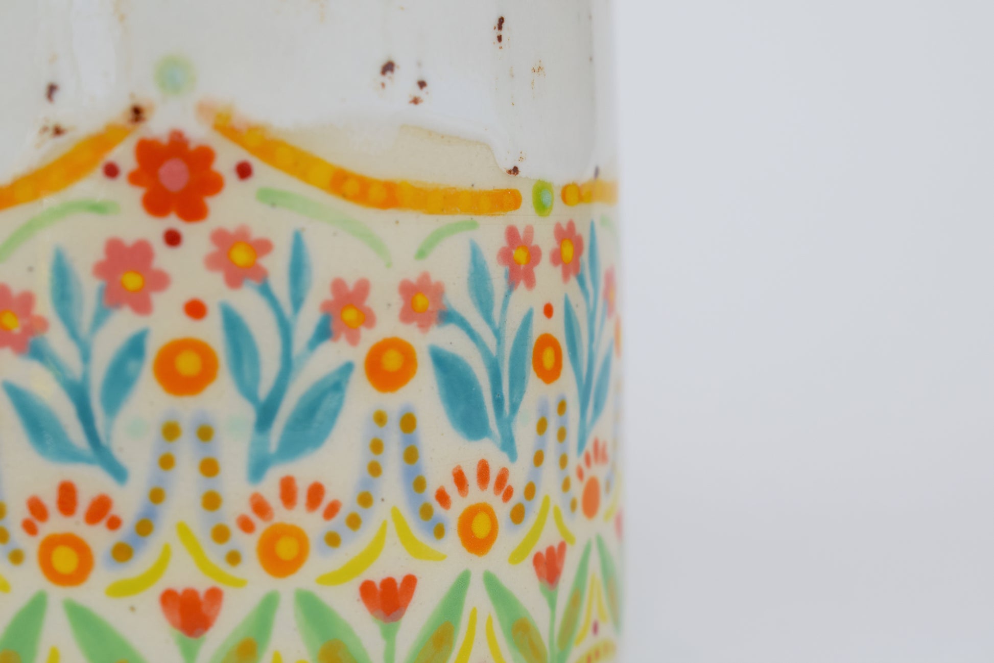 Each vase is a unique stoneware creation, carefully shaped on the potter’s wheel in a cosy home studio. Some are hand-painted, while others are carved with patterns inspired by nature—leaves, textures, and organic forms—creating a subtle, nature-inspired balance between detail and simplicity. The interior is fully sealed with a glossy transparent glaze, making it suitable for fresh or dried stems, or simply as a statement piece on its own.