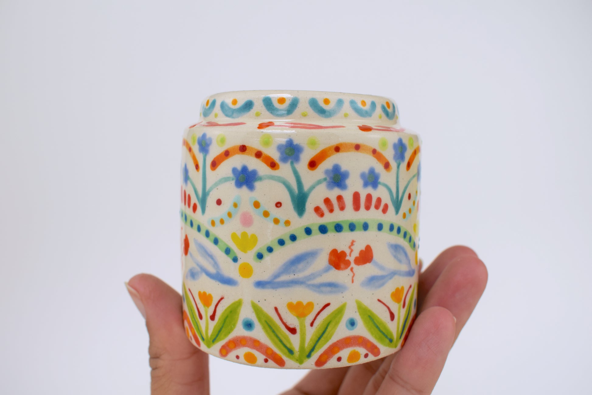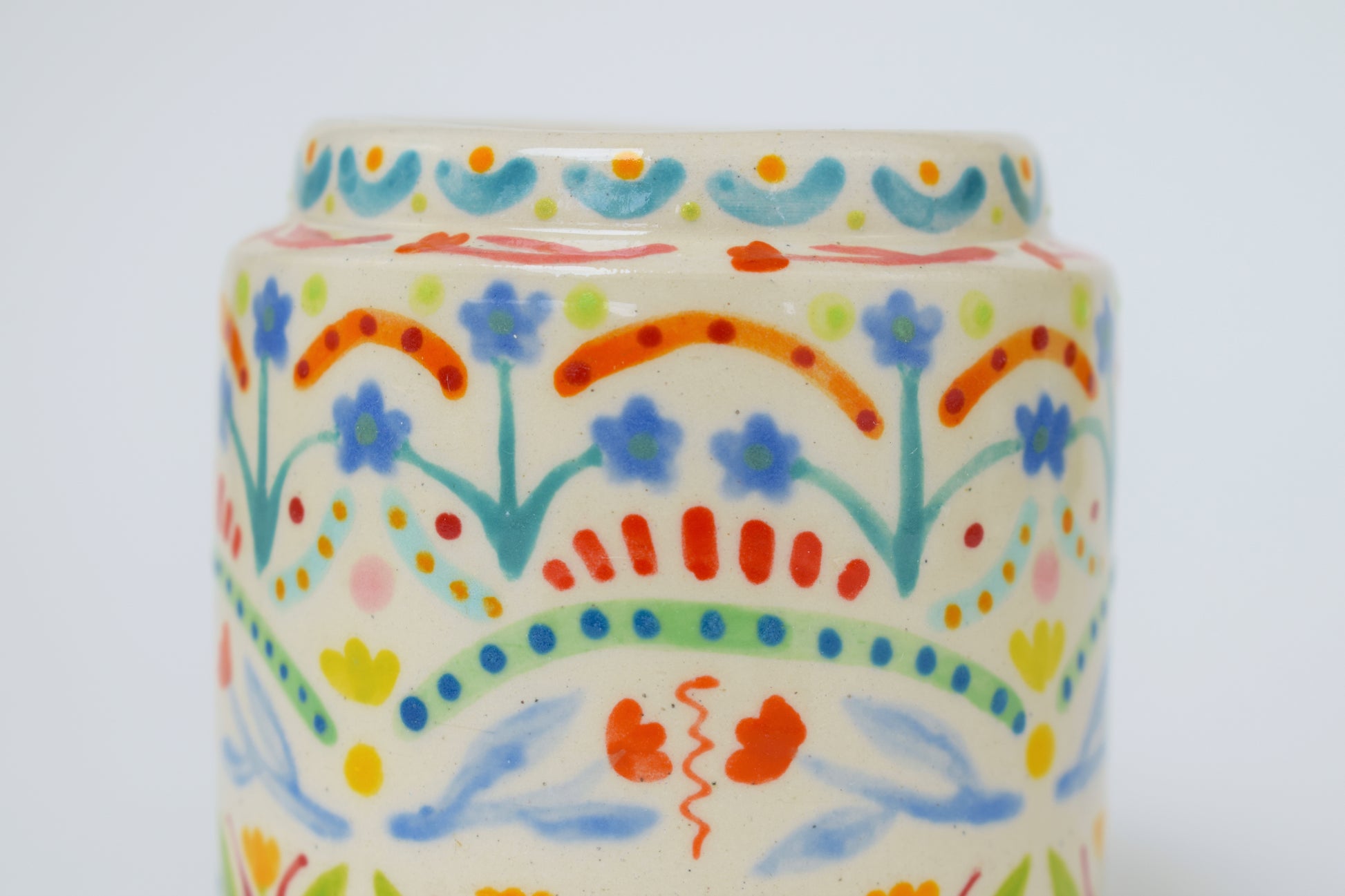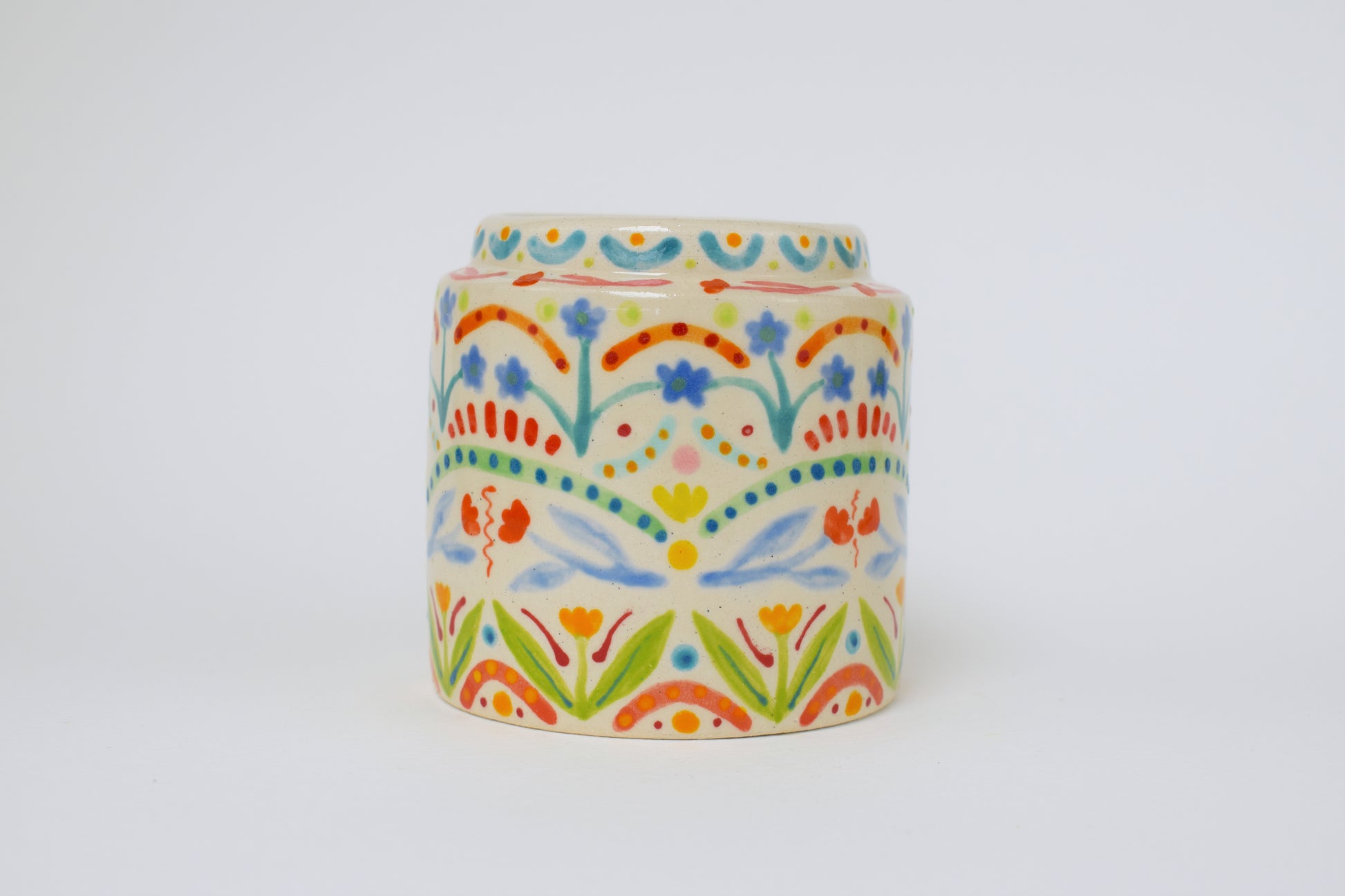 The Floral Harmony Mini Vase is a hand-thrown stoneware ceramic, carefully crafted in my cosy home studio and fired to over 1200°C. Its surface is adorned with repeating flowers and delicate patterns that flow in layered bands around the vase, creating a harmonious rhythm of colour and form. The gentle repetition and layering invite the eye to travel around the piece, revealing new joyful details with every glance.