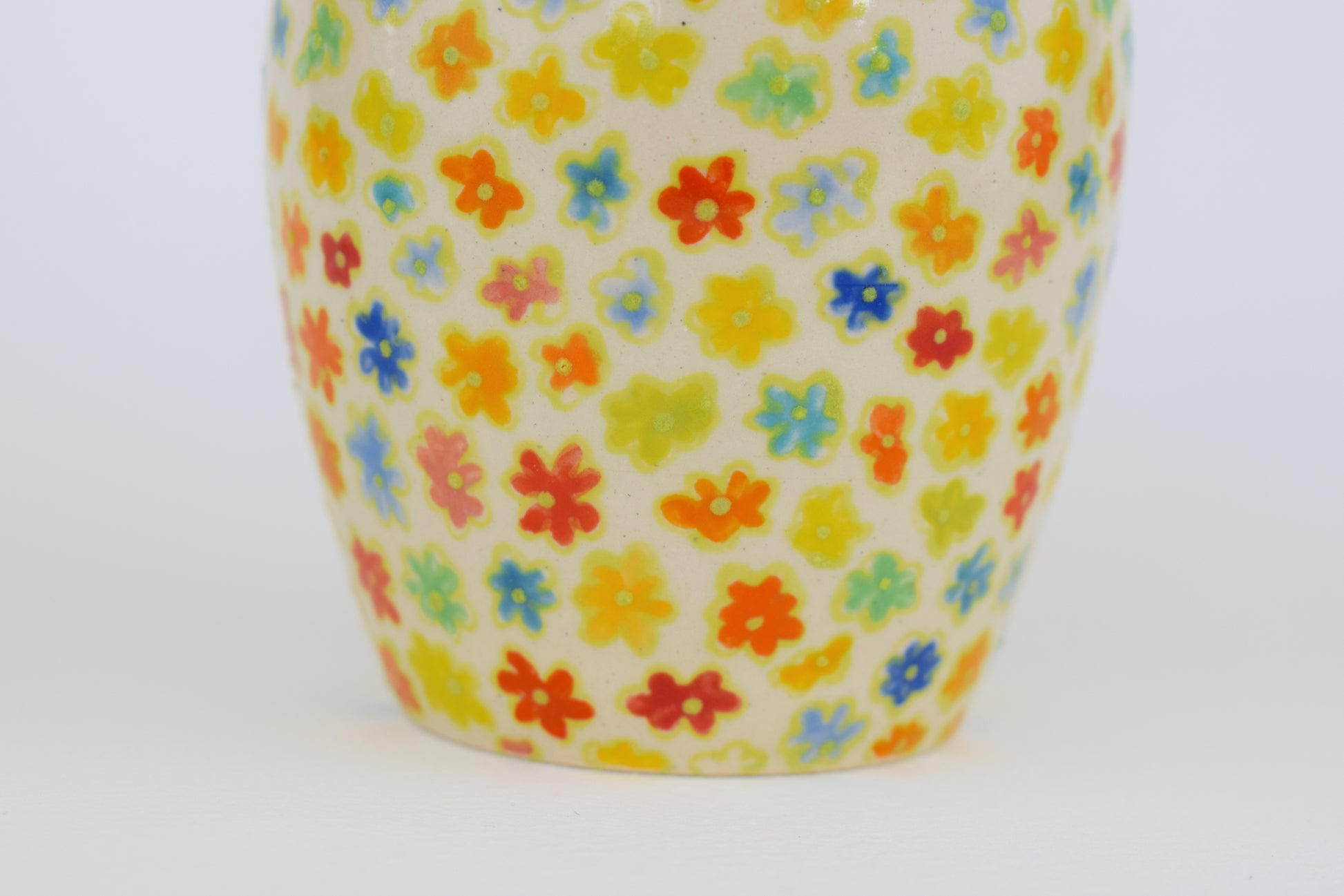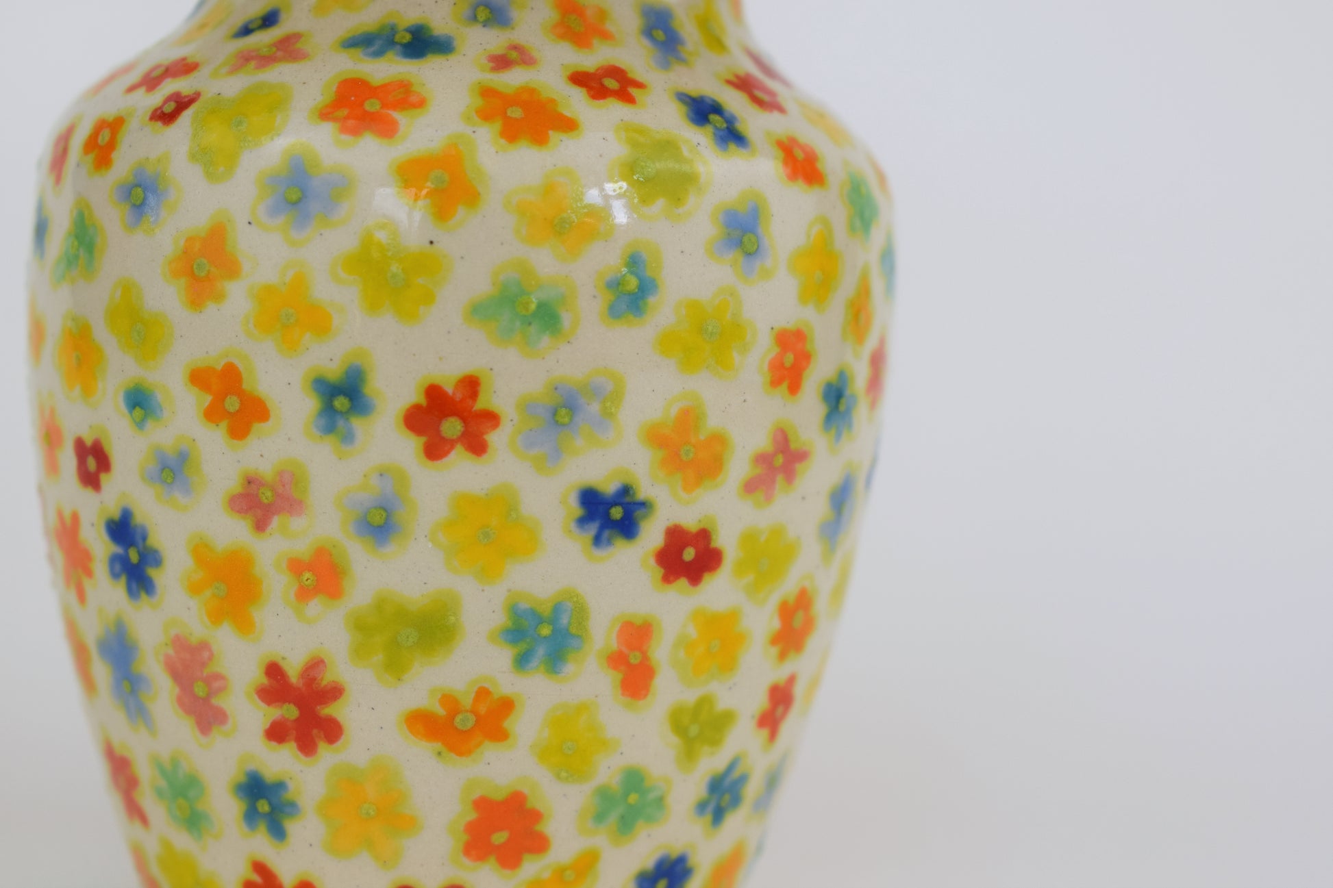 The mini vase is a highly decorative stoneware ceramic. Hand-thrown on the potters wheel and fired to over 1000 degrees, each ceramic is made in my cosy home studio! The vase is a one of a kind, with the unique pattern created through hand-painting layers of colourful glazes. Glazed on the inside with a transparent glossy glaze, each vase is sealed!