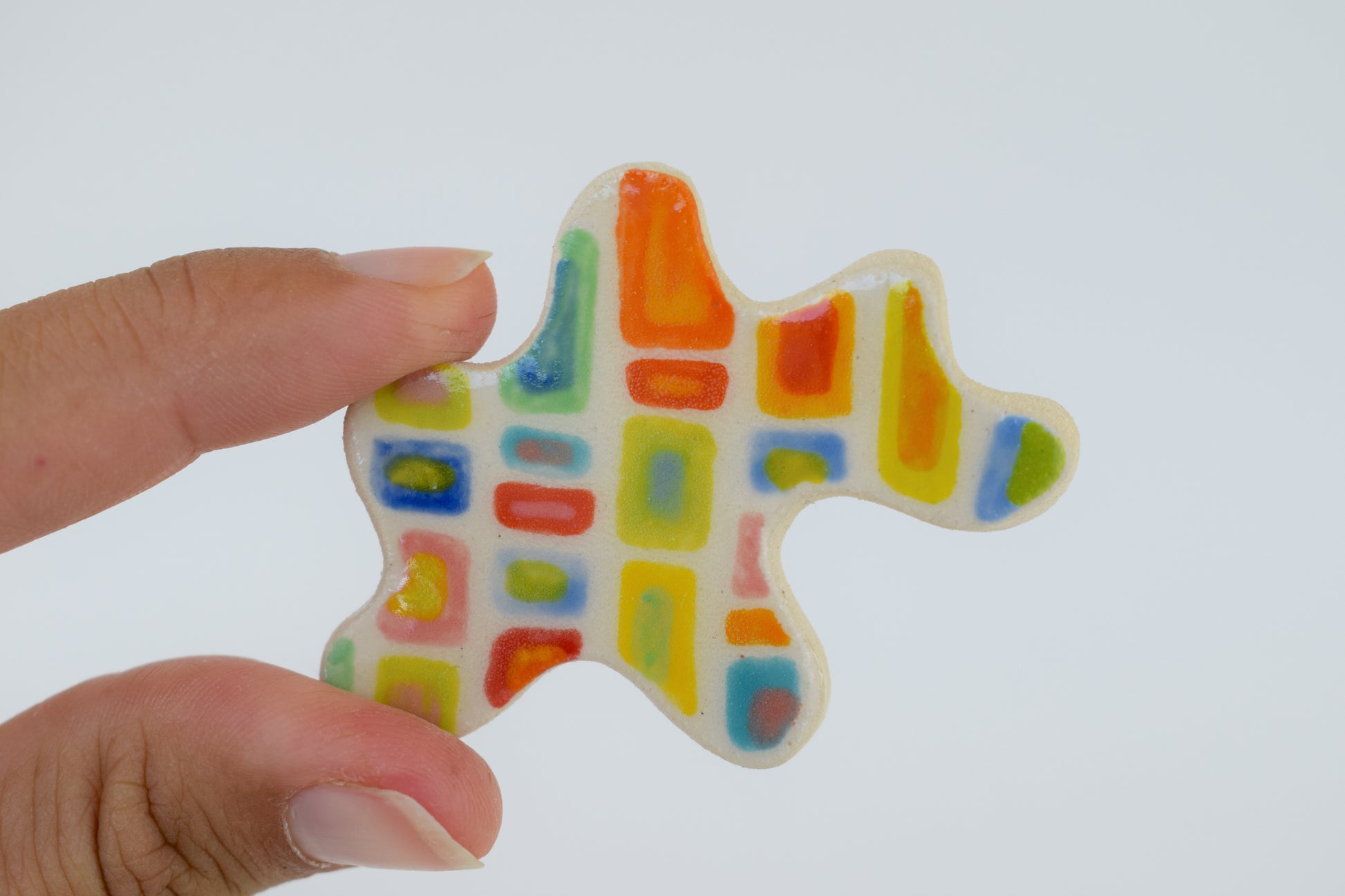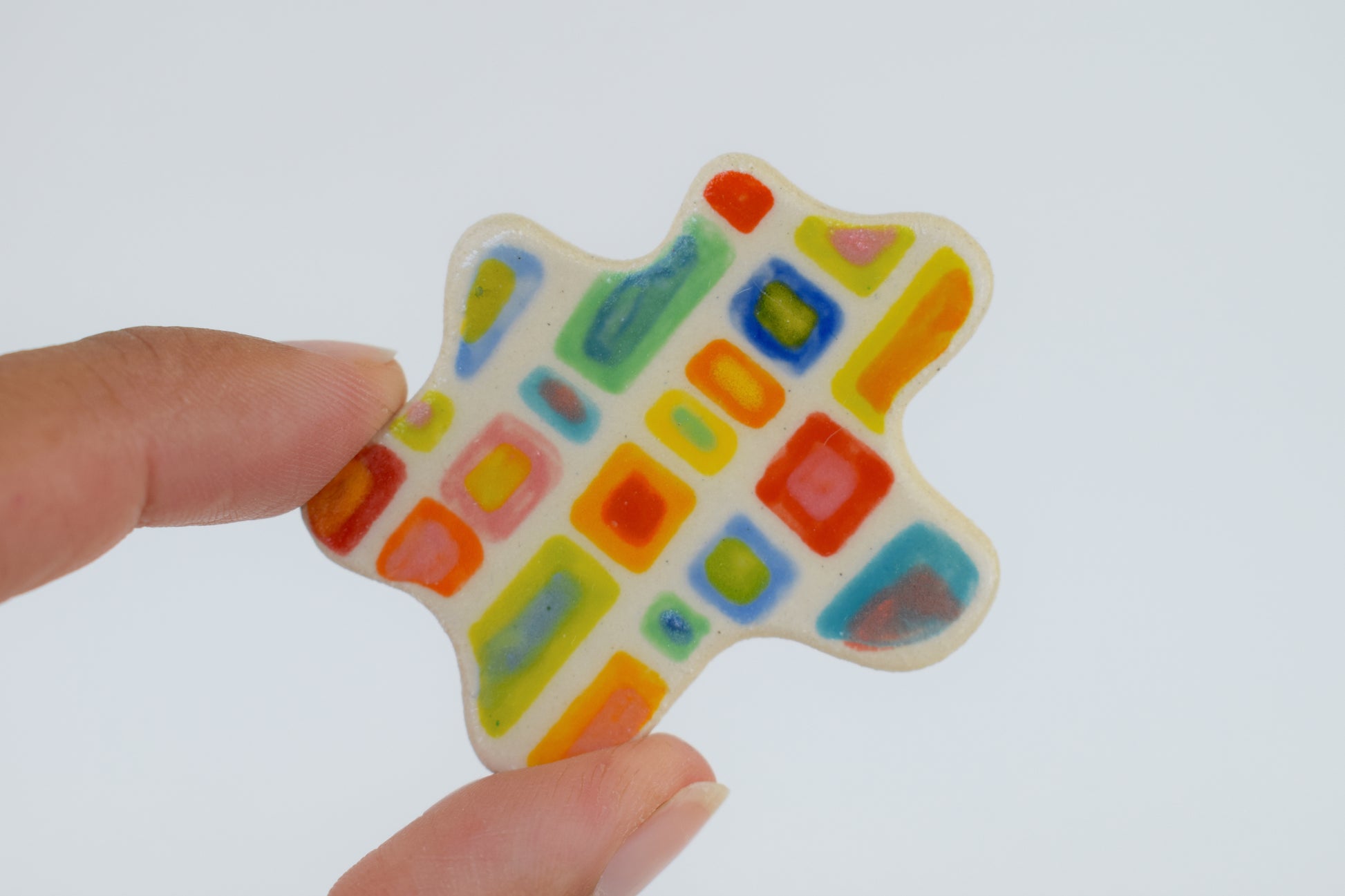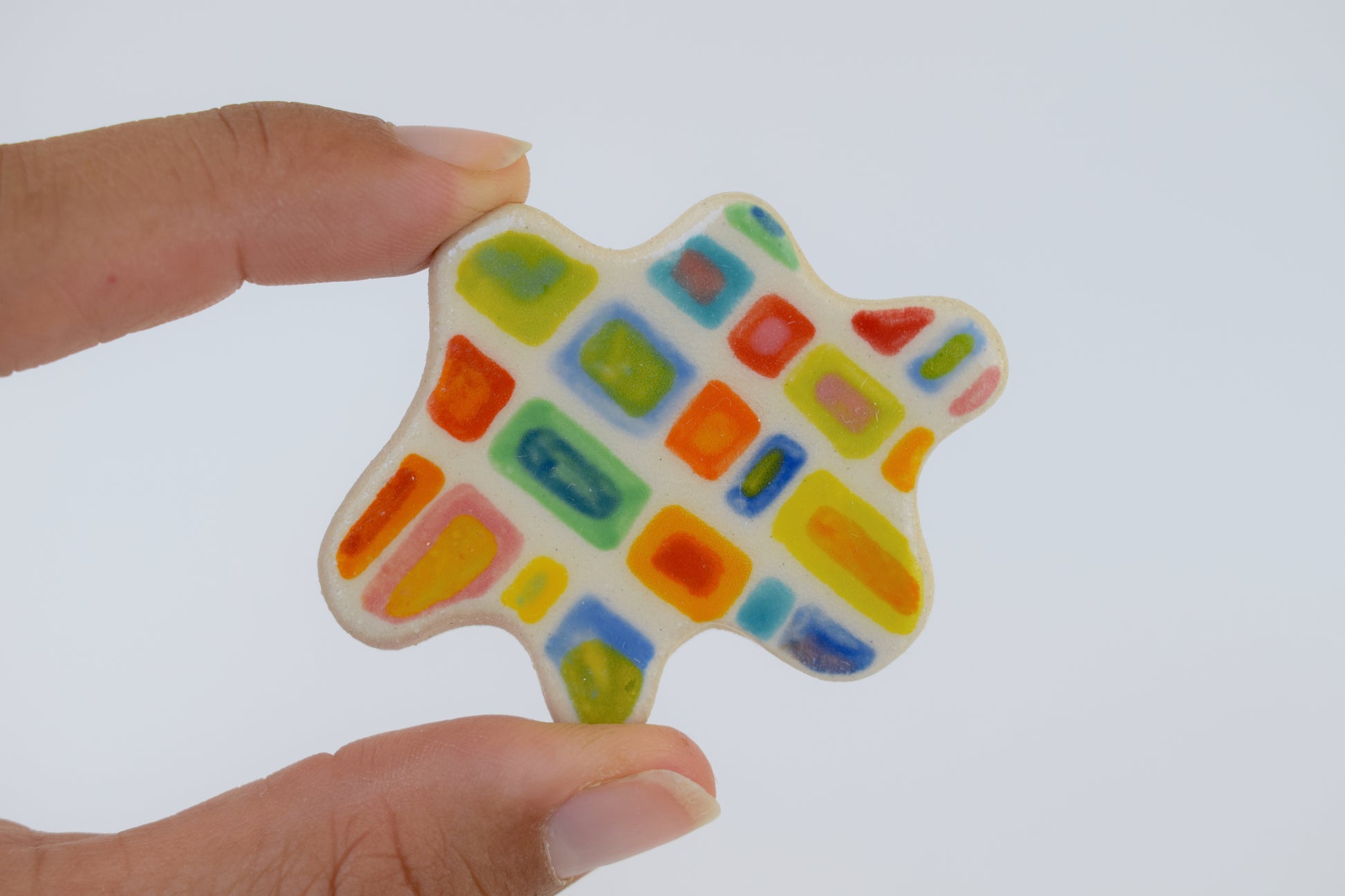 These multicoloured magnets are small bursts of joy — each one hand-cut, glazed, and individually fired to over 1200°C in my home studio. Inspired by both nature and architecture, they feature playful shapes and vibrant colours that bring life to any fridge, pinboard or magnetic surface. Every magnet is unique, with slight variations that reflect their handmade nature.
