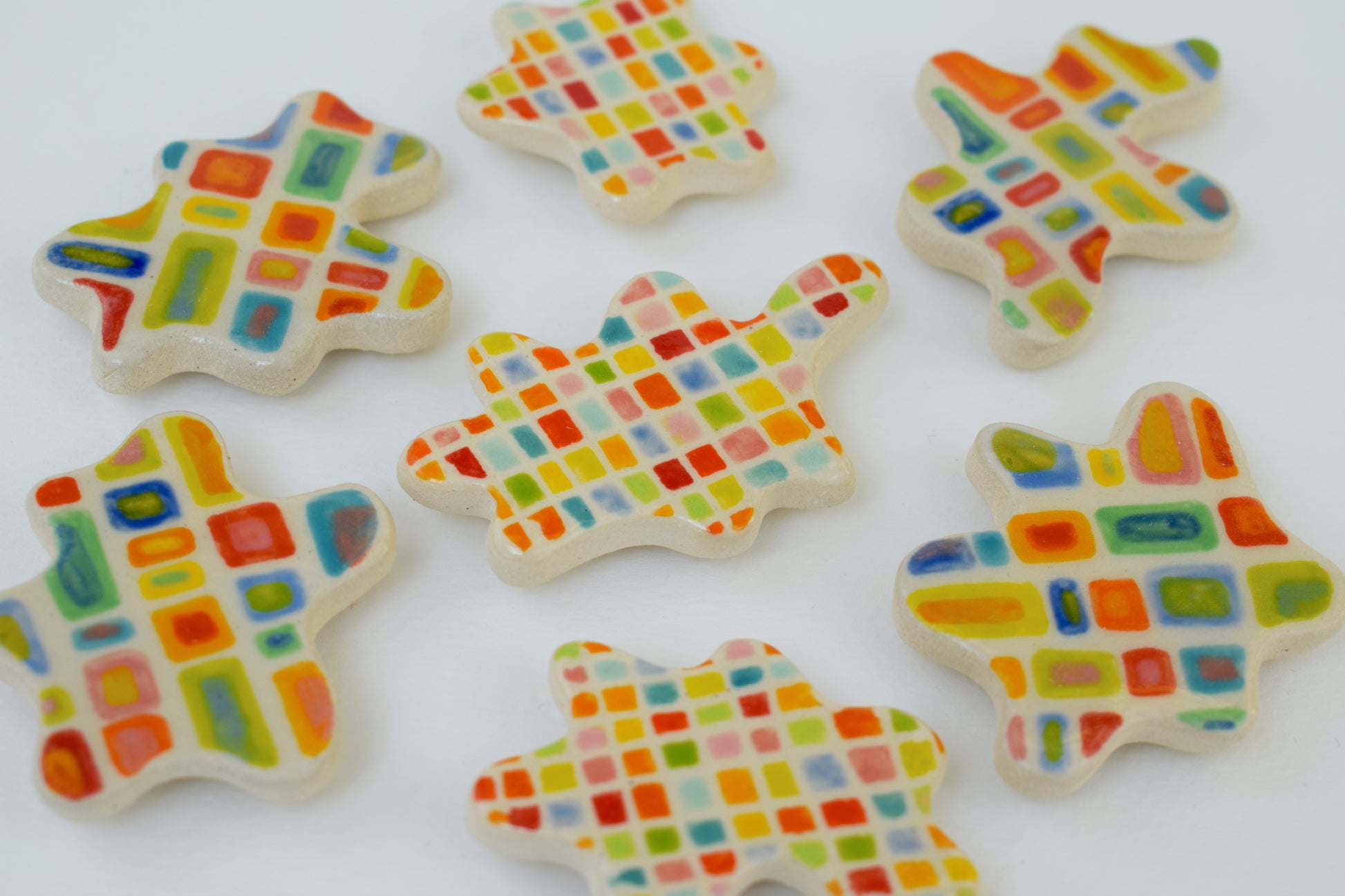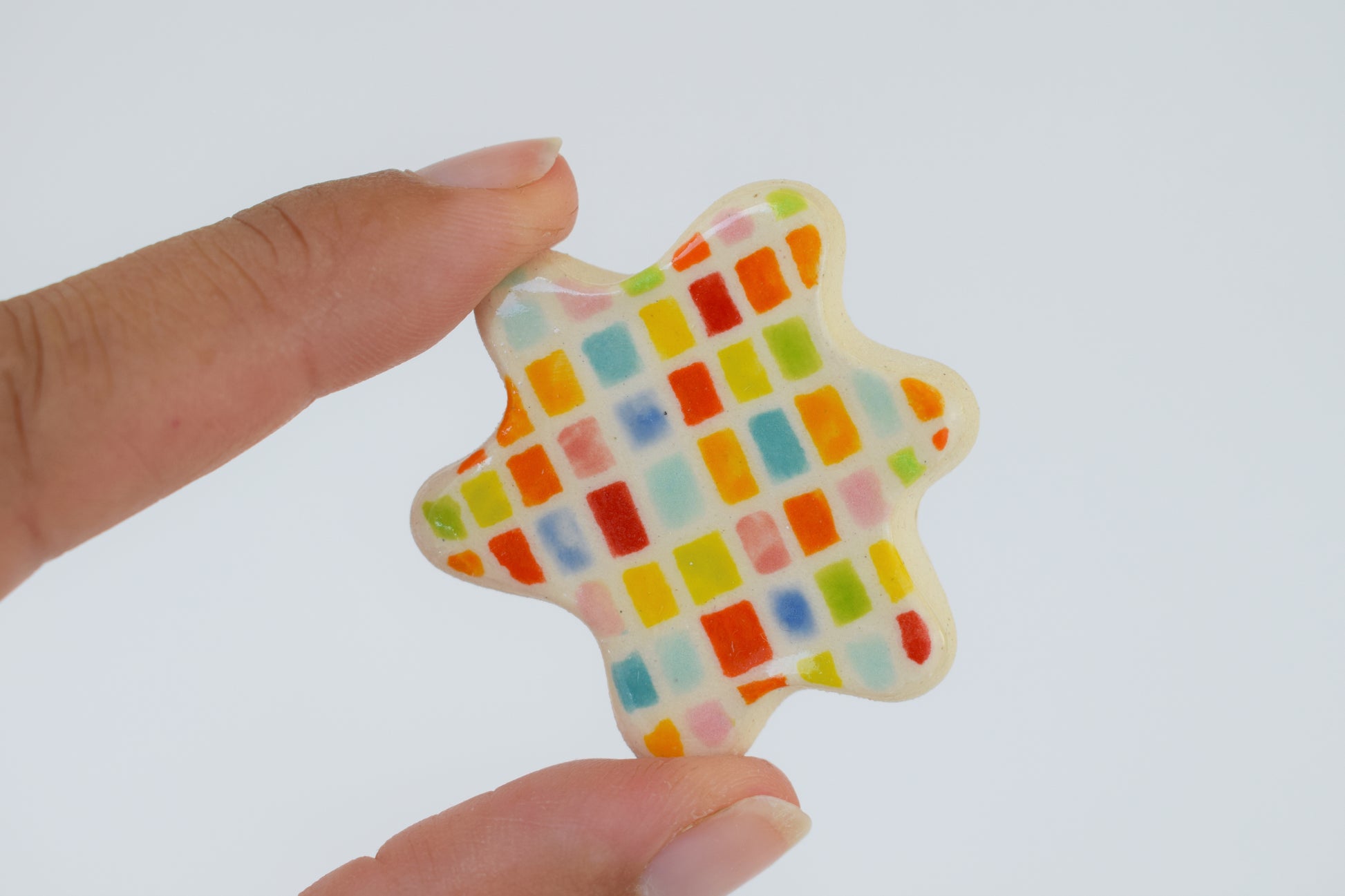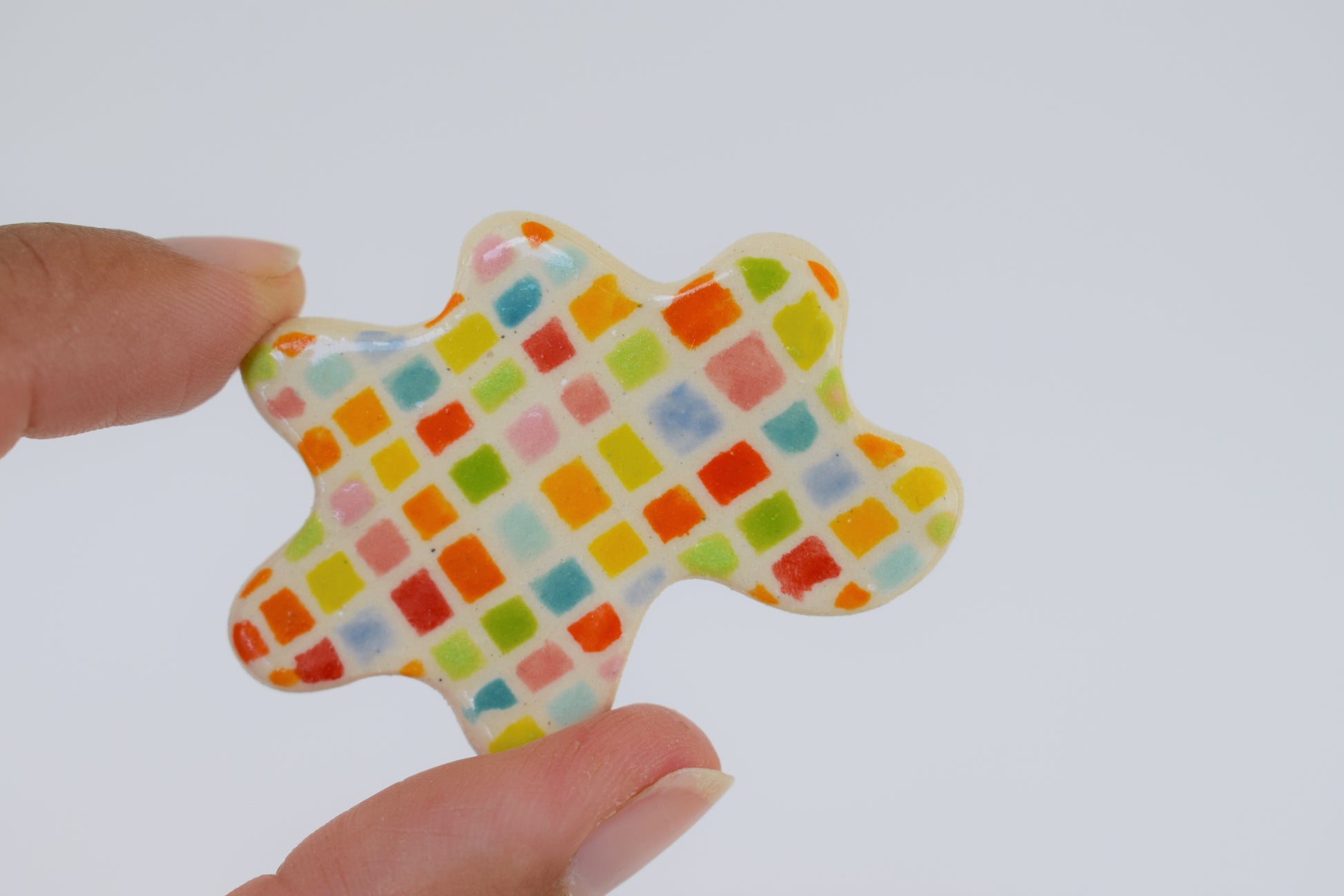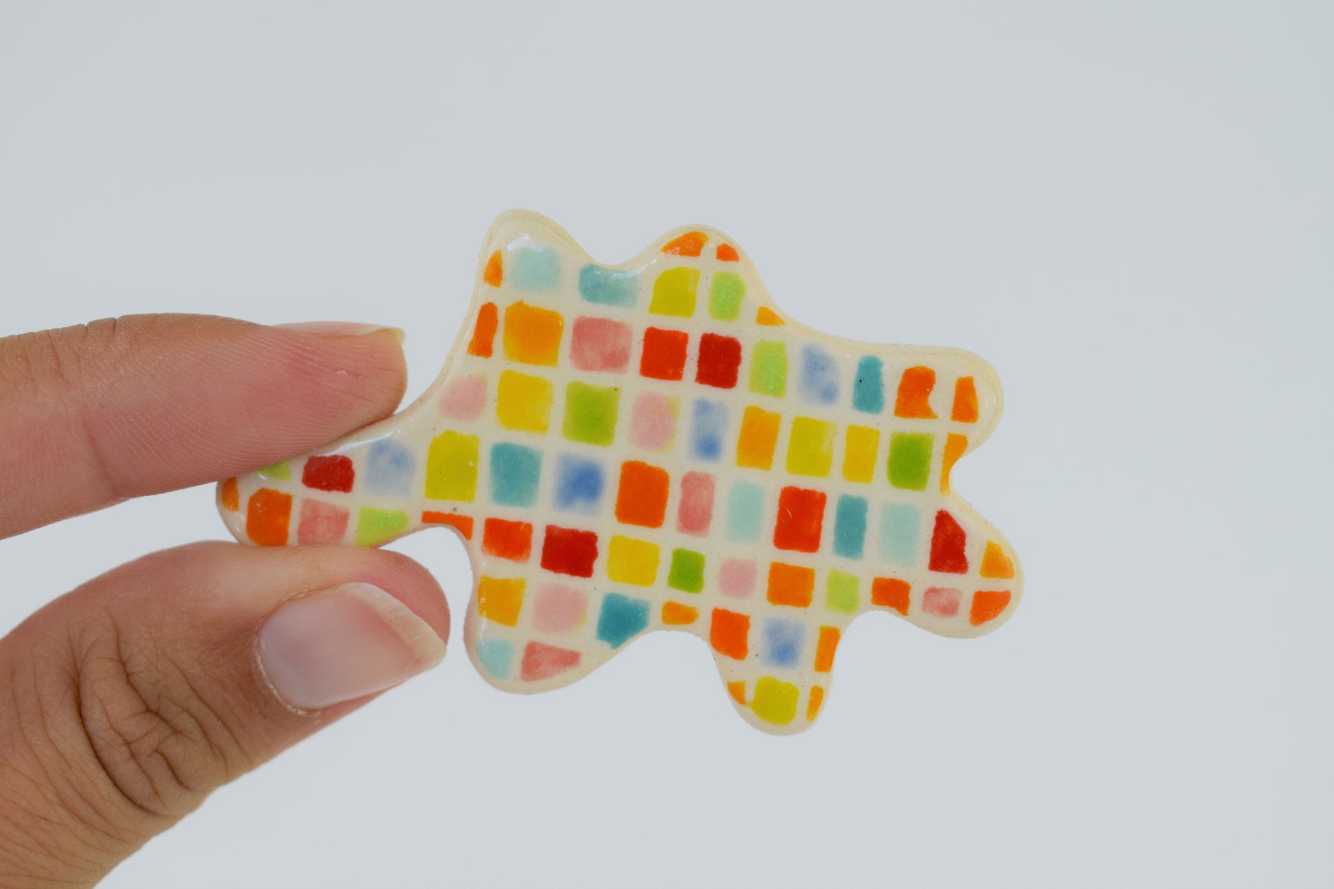 These multicoloured magnets are small bursts of joy — each one hand-cut, glazed, and individually fired to over 1200°C in my home studio. Inspired by both nature and architecture, they feature playful shapes and vibrant colours that bring life to any fridge, pinboard or magnetic surface. Every magnet is unique, with slight variations that reflect their handmade nature.