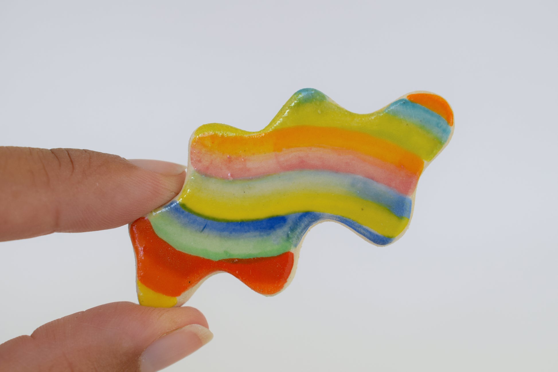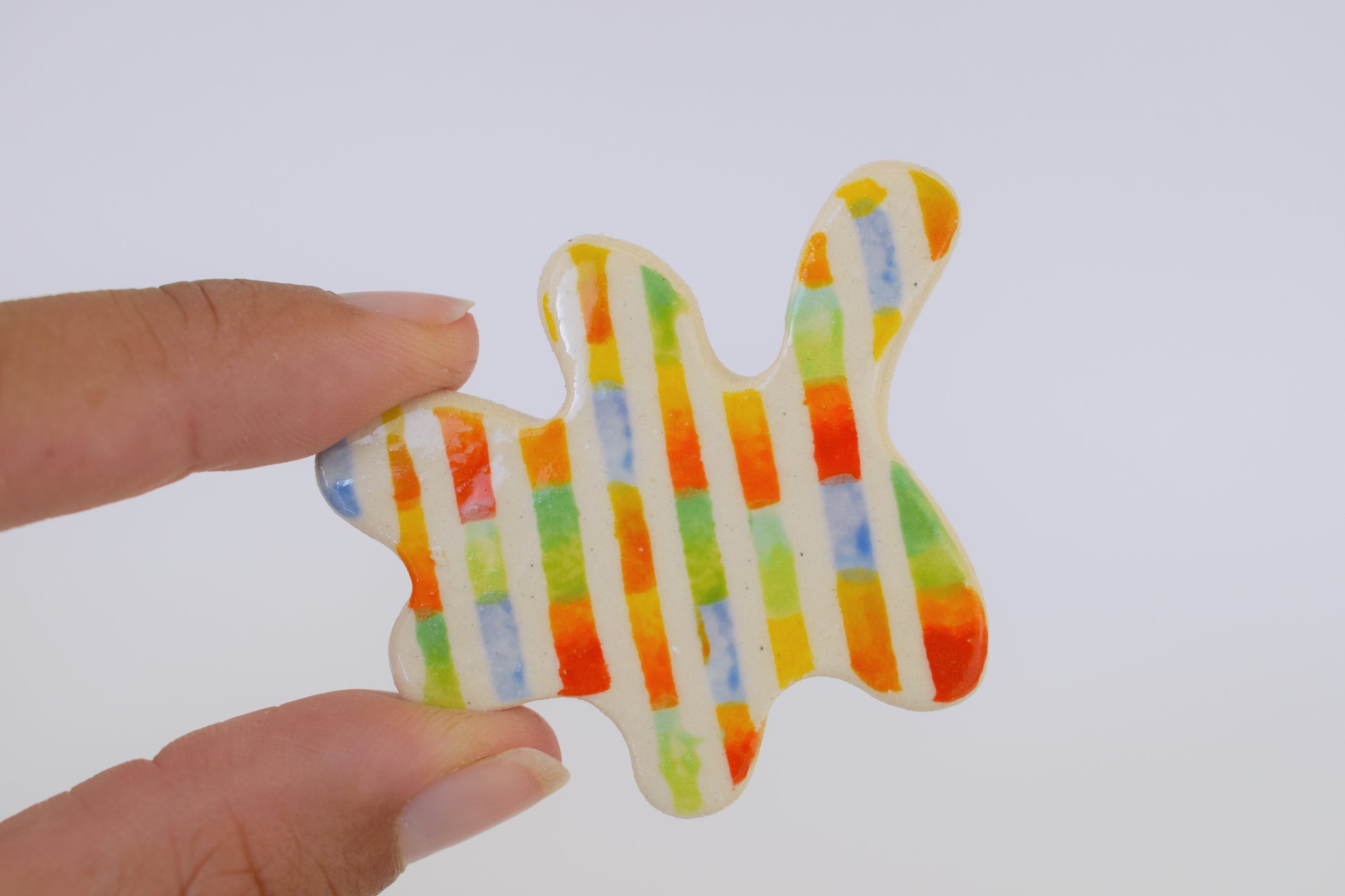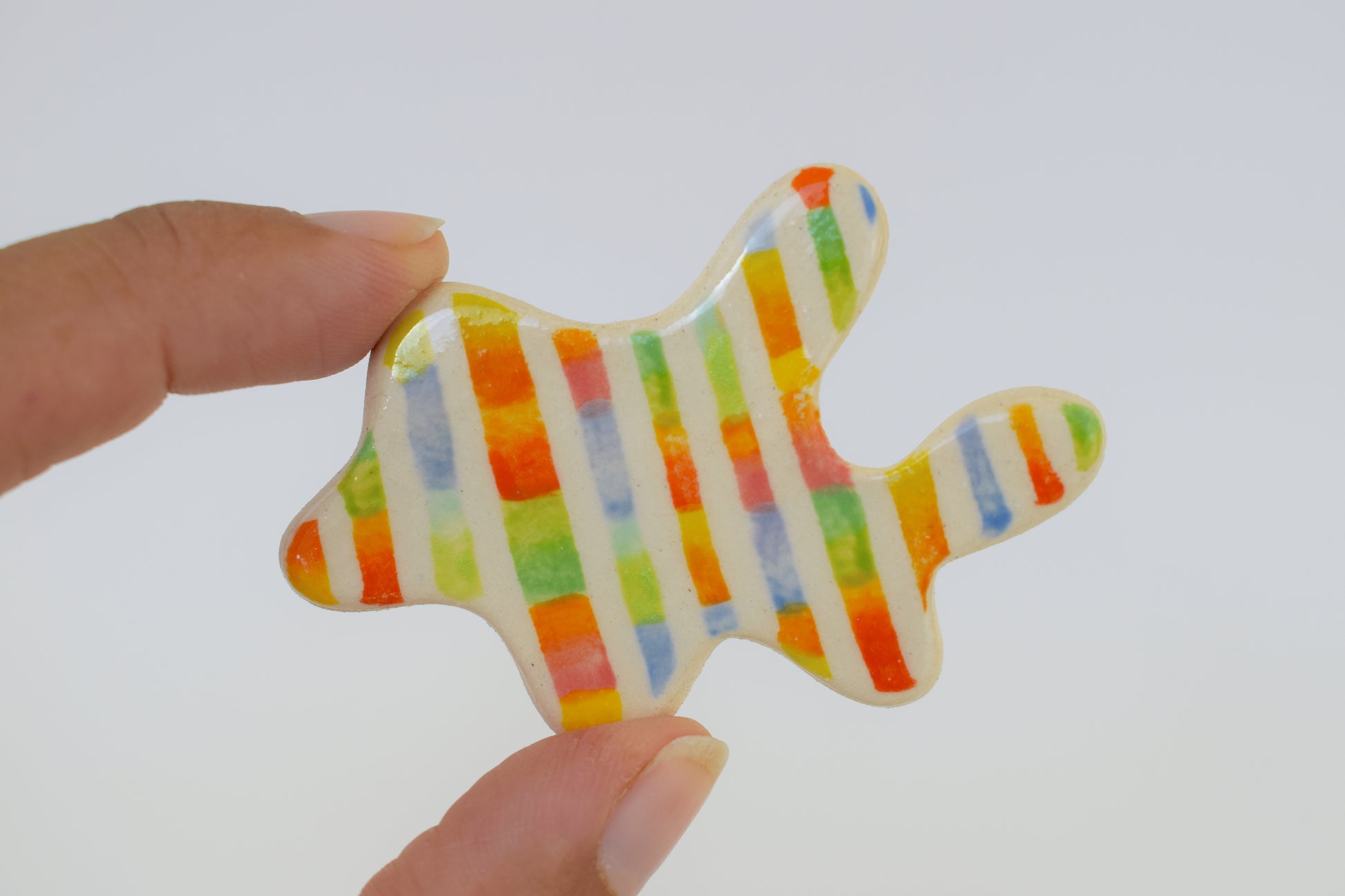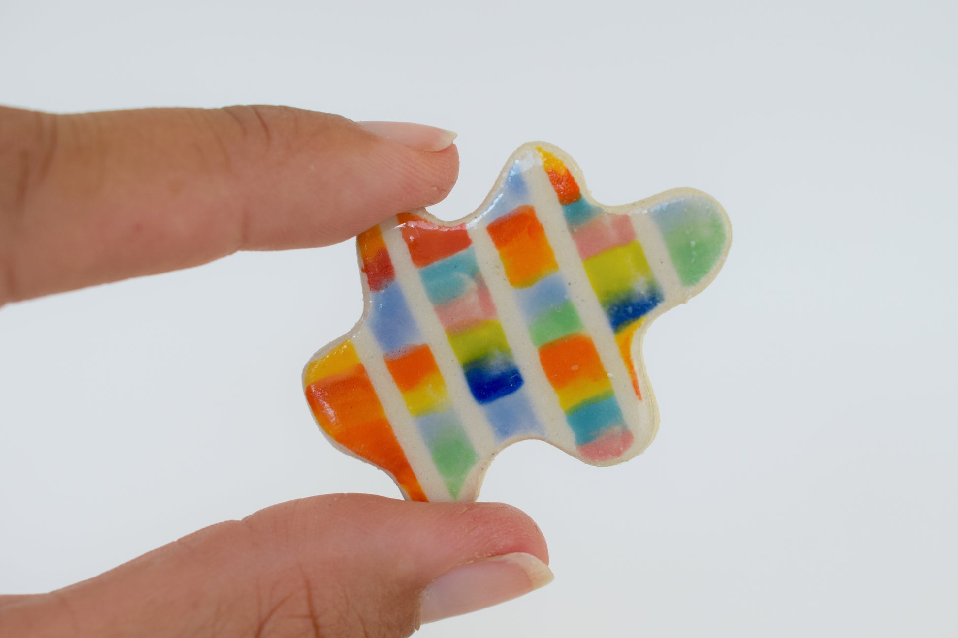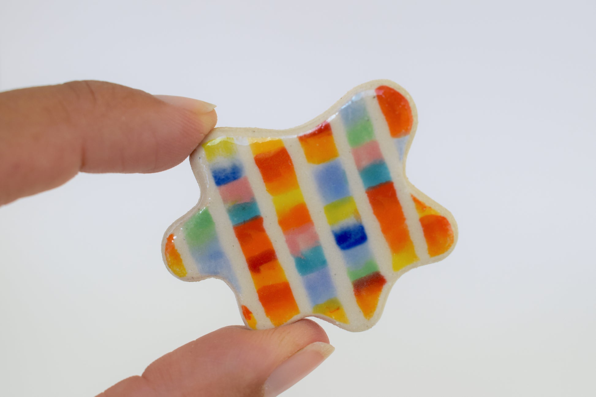 These multicoloured magnets are small bursts of joy — each one hand-cut, glazed, and individually fired to over 1200°C in my home studio. Inspired by both nature and architecture, they feature playful shapes and vibrant colours that bring life to any fridge, pinboard or magnetic surface. Every magnet is unique, with slight variations that reflect their handmade nature.