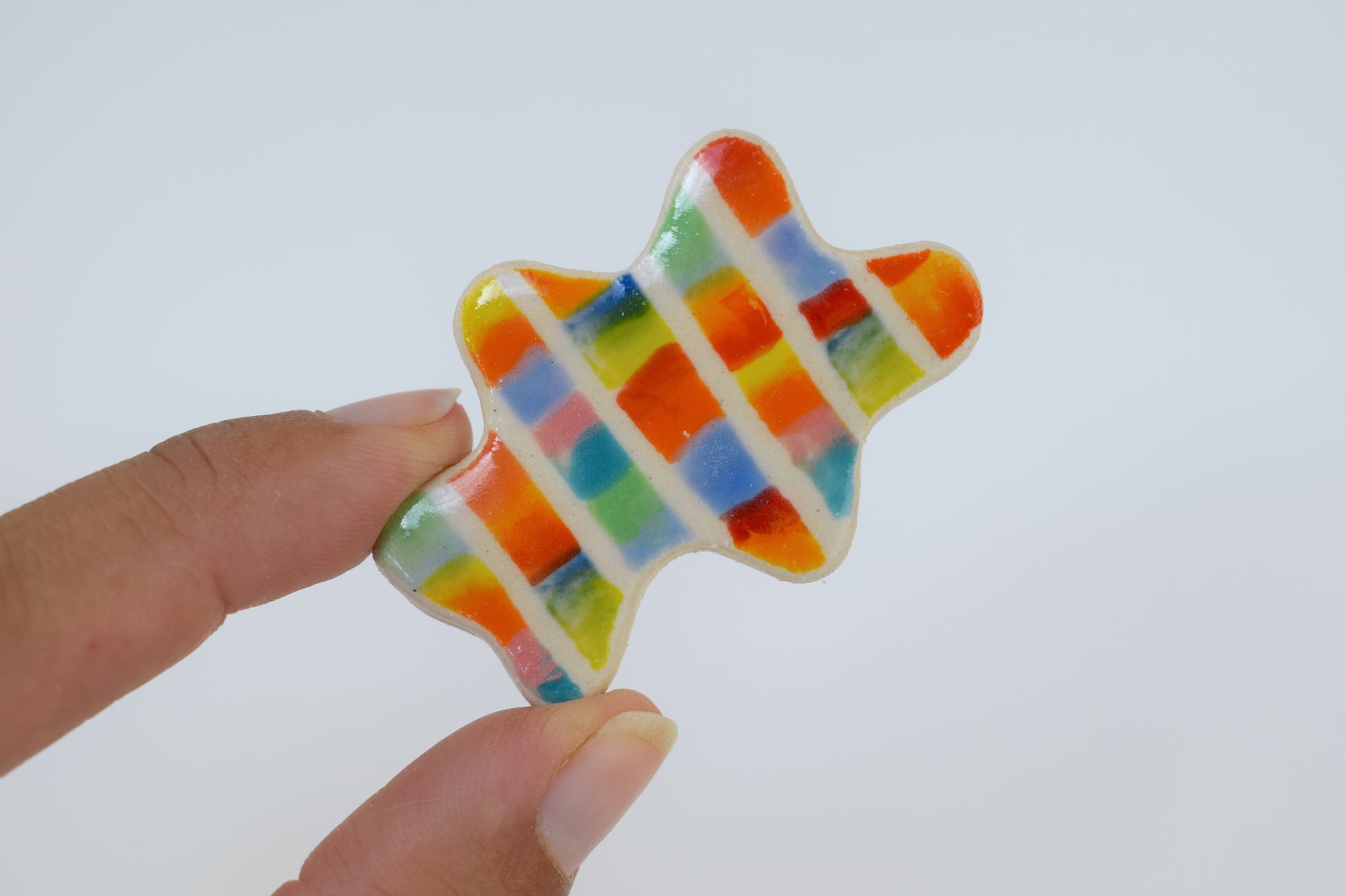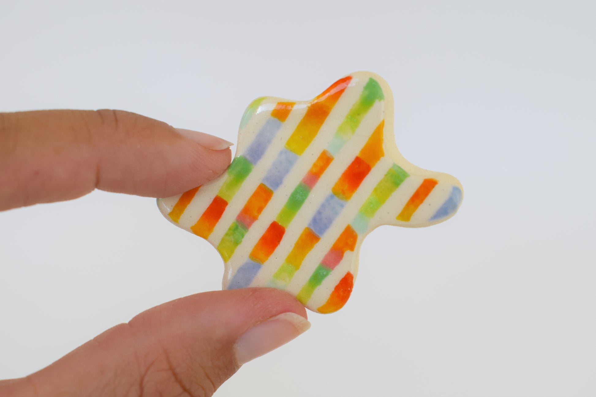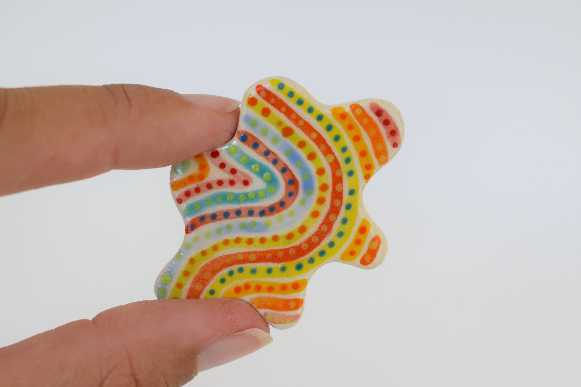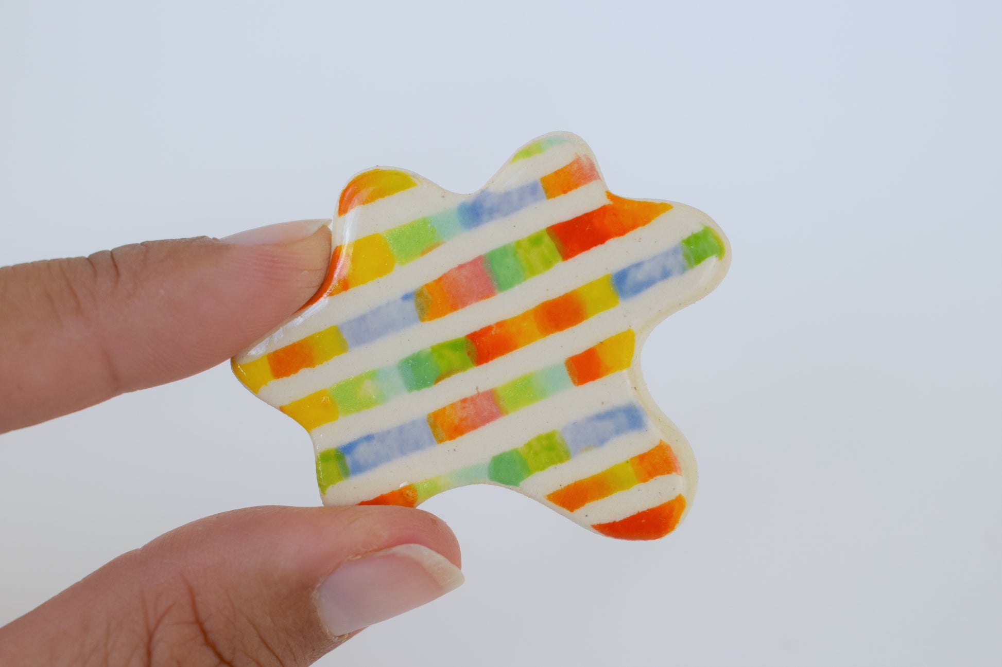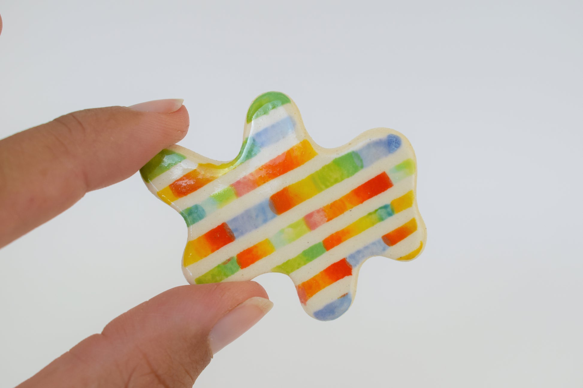 These multicoloured magnets are small bursts of joy — each one hand-cut, glazed, and individually fired to over 1200°C in my home studio. Inspired by both nature and architecture, they feature playful shapes and vibrant colours that bring life to any fridge, pinboard or magnetic surface. Every magnet is unique, with slight variations that reflect their handmade nature.