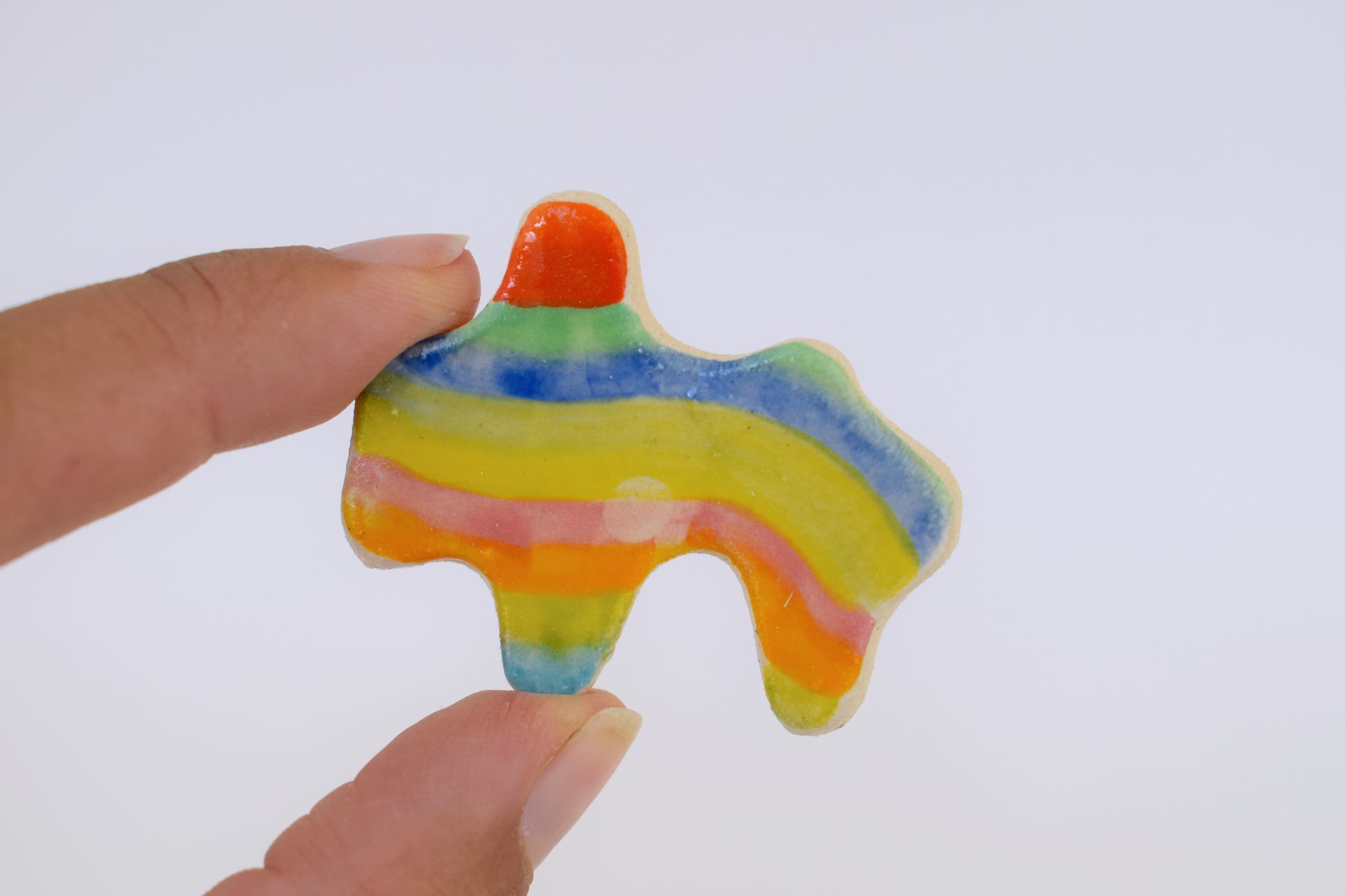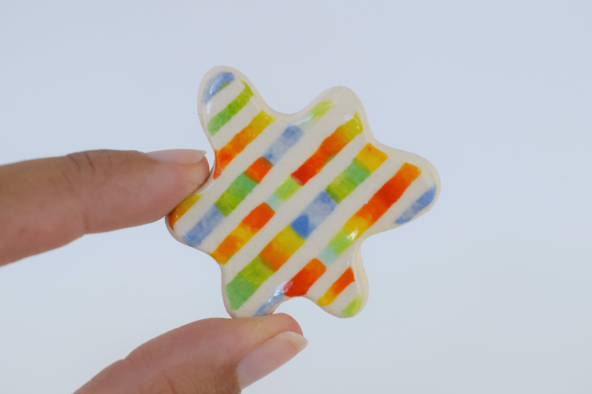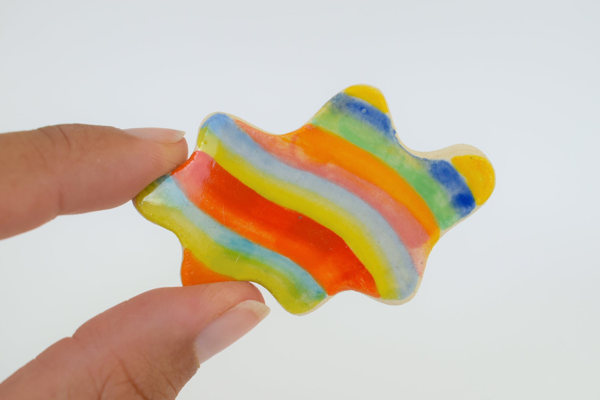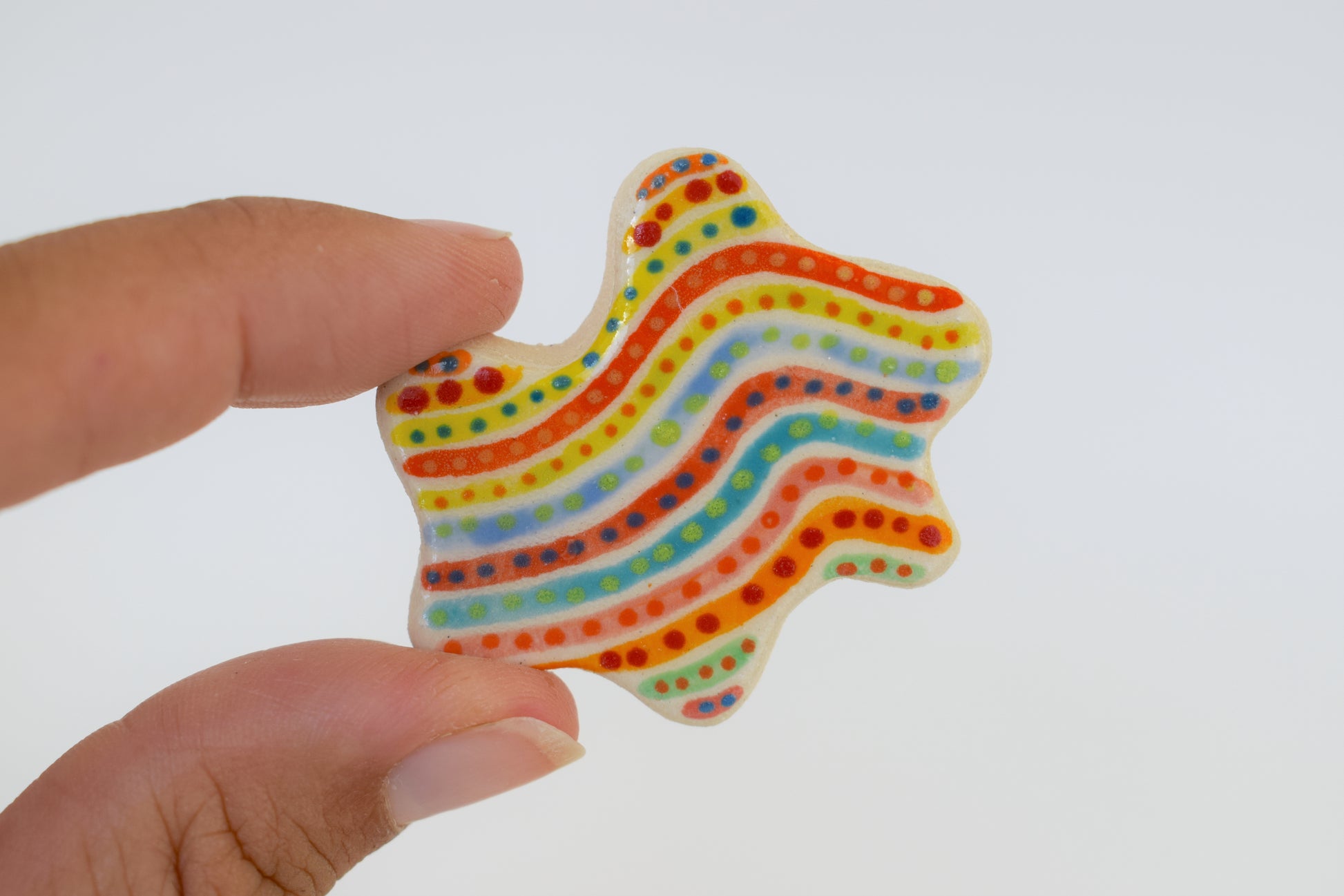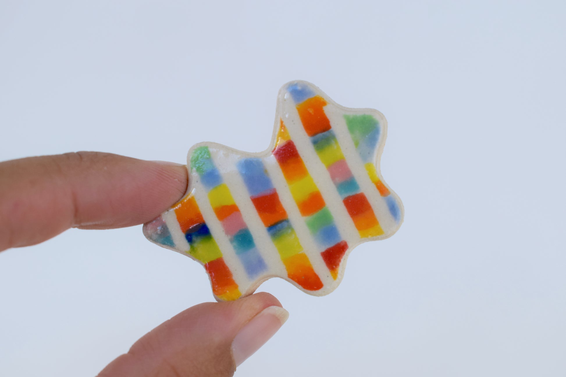These multicoloured magnets are small bursts of joy — each one hand-cut, glazed, and individually fired to over 1200°C in my home studio. Inspired by both nature and architecture, they feature playful shapes and vibrant colours that bring life to any fridge, pinboard or magnetic surface. Every magnet is unique, with slight variations that reflect their handmade nature.