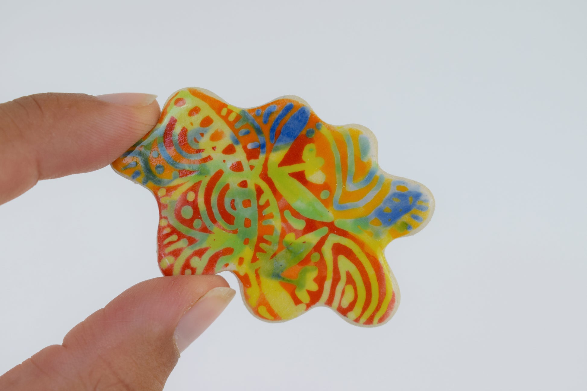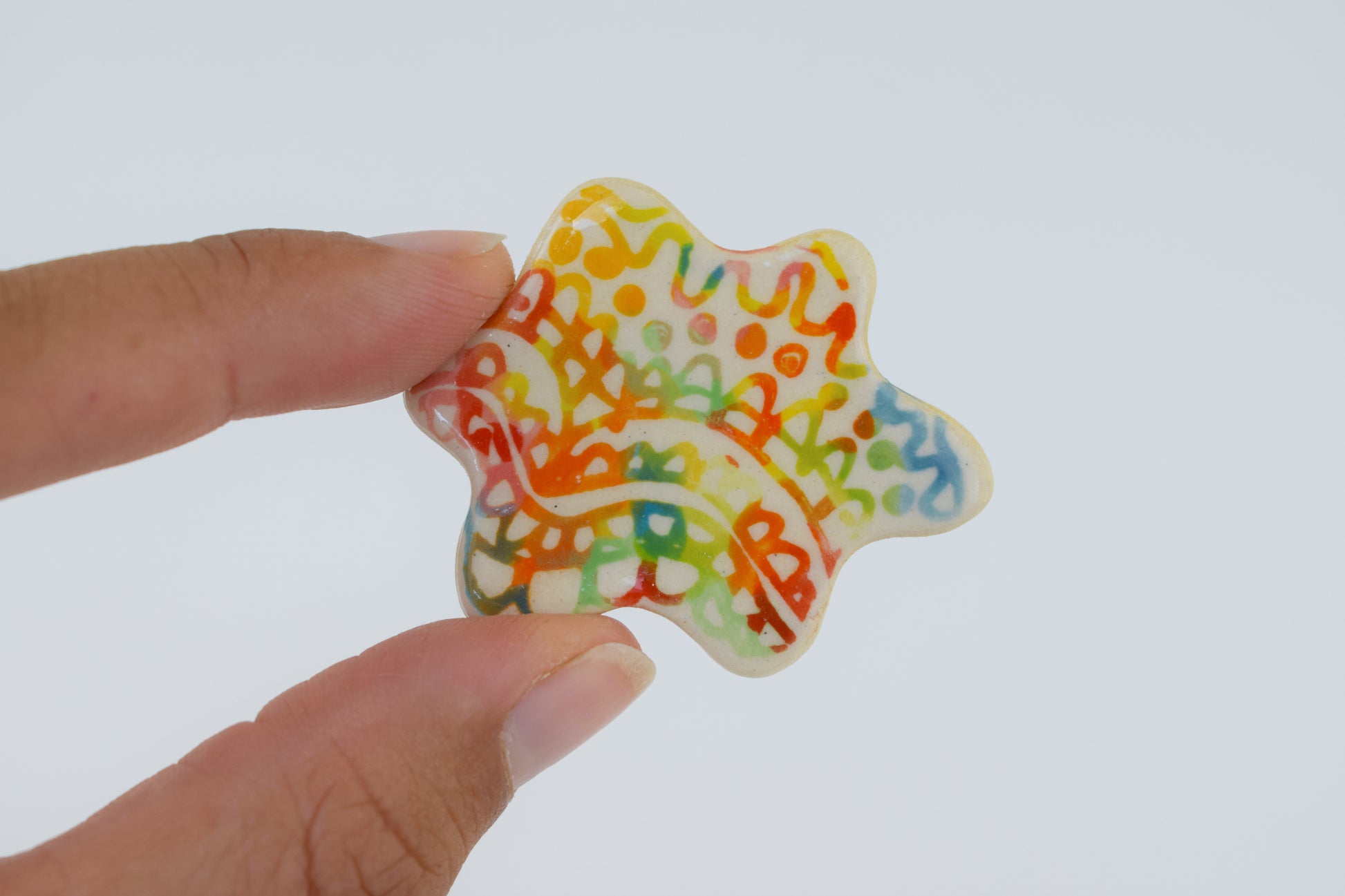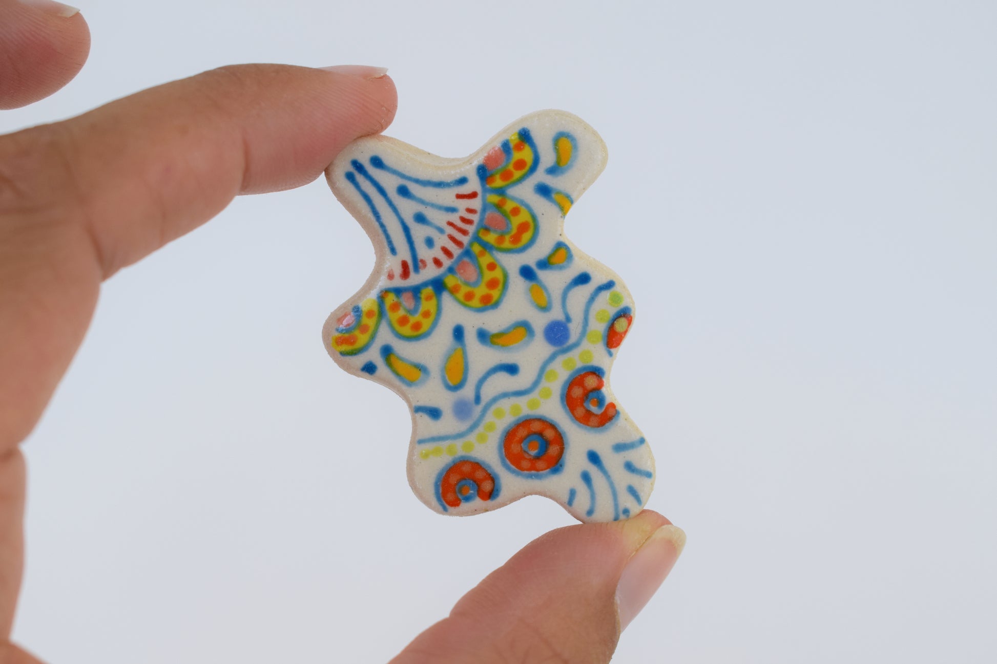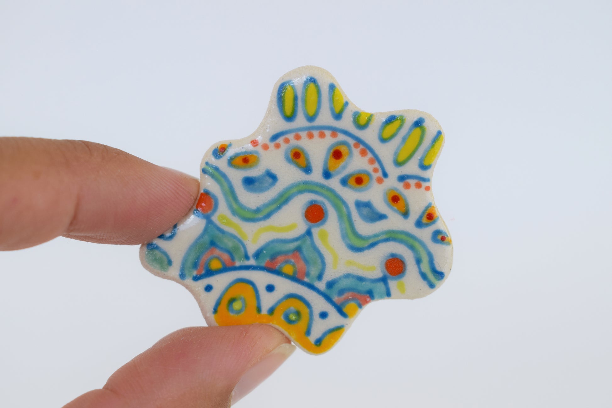 These multicoloured magnets are small bursts of joy — each one hand-cut, glazed, and individually fired to over 1200°C in my home studio. Inspired by both nature and architecture, they feature playful shapes and vibrant colours that bring life to any fridge, pinboard or magnetic surface. Every magnet is unique, with slight variations that reflect their handmade nature.