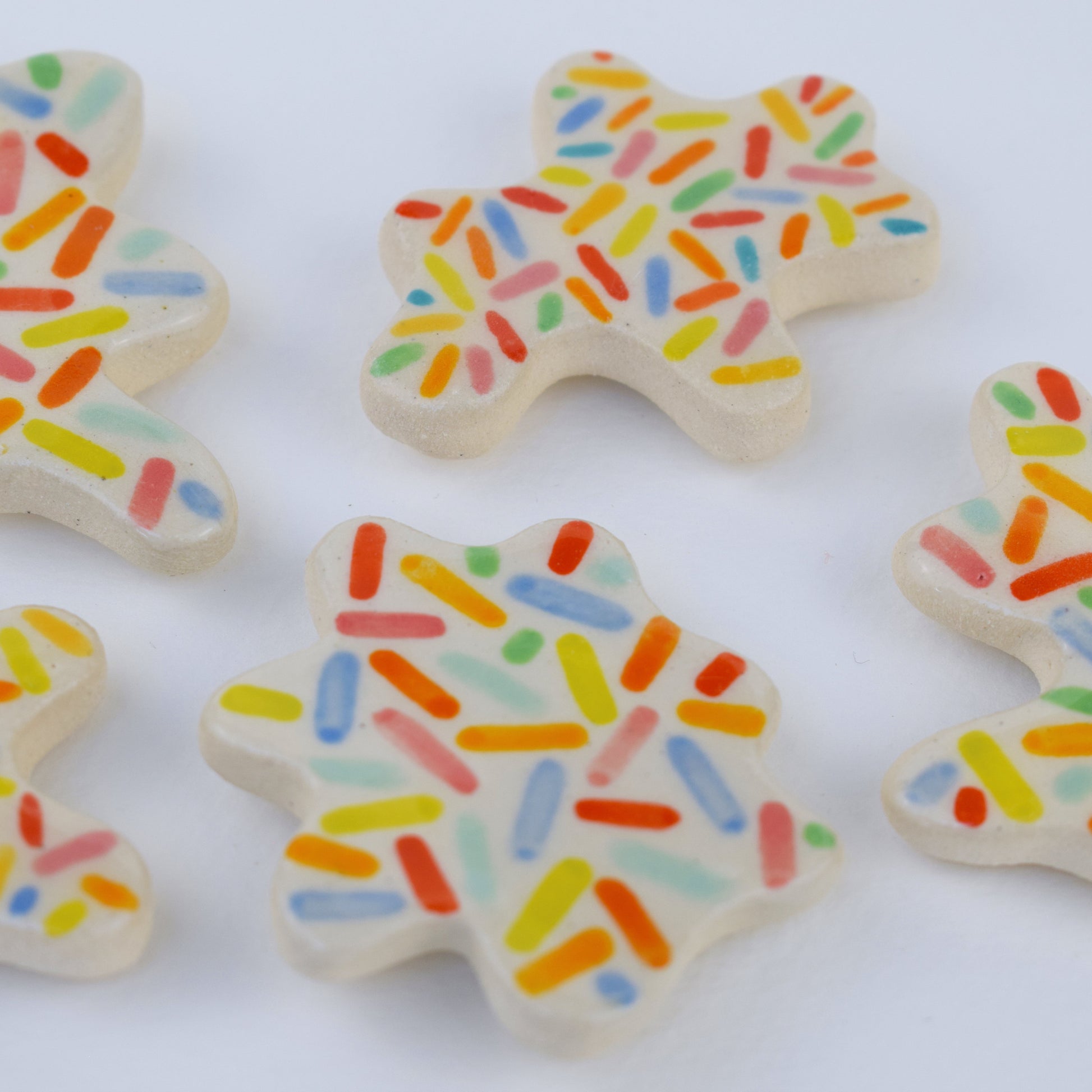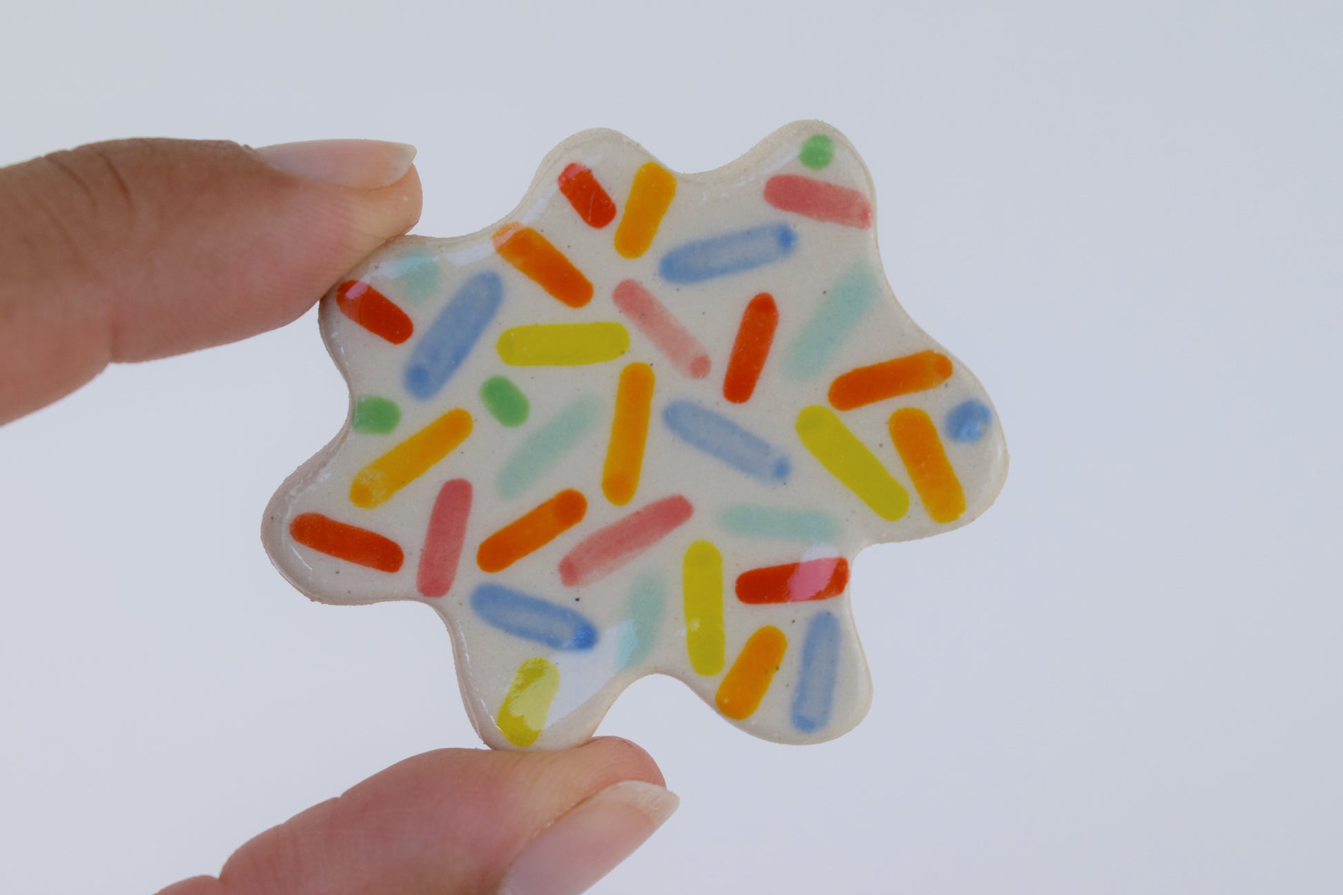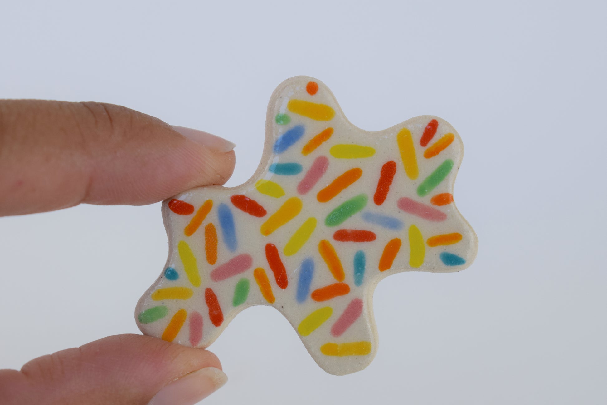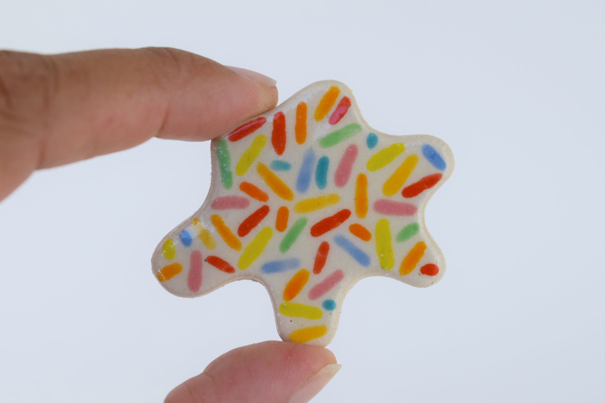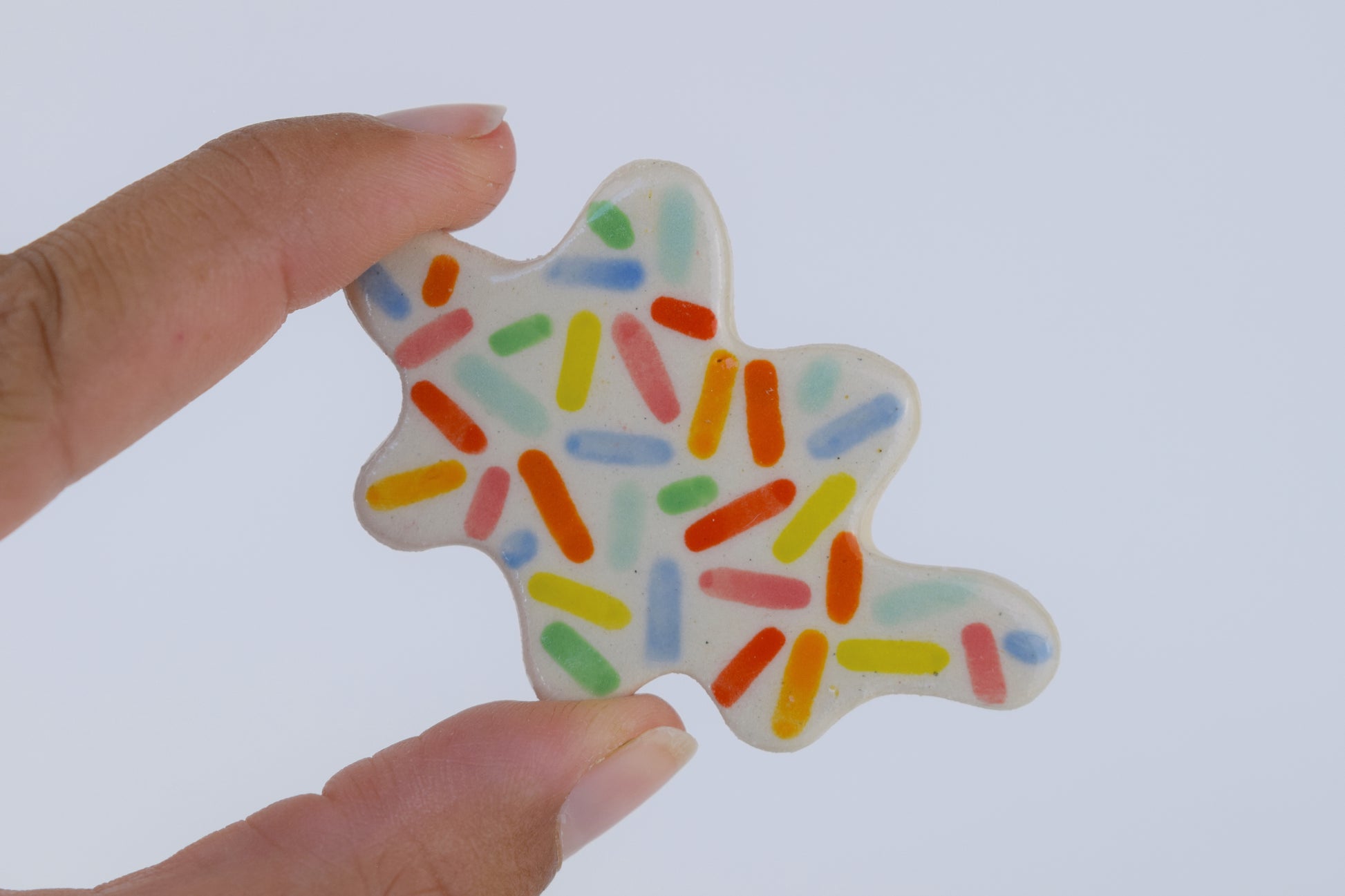 These multicoloured magnets are small bursts of joy — each one hand-cut, glazed, and individually fired to over 1200°C in my home studio. Inspired by both nature and architecture, they feature playful shapes and vibrant colours that bring life to any fridge, pinboard or magnetic surface. Every magnet is unique, with slight variations that reflect their handmade nature.