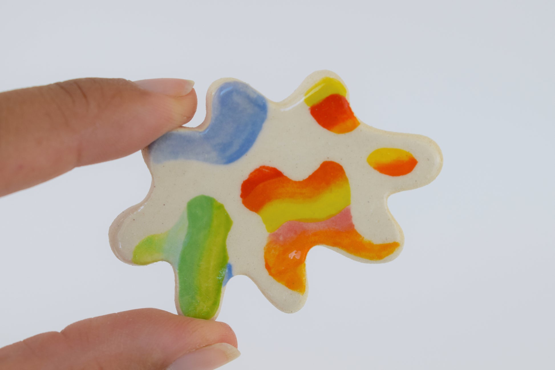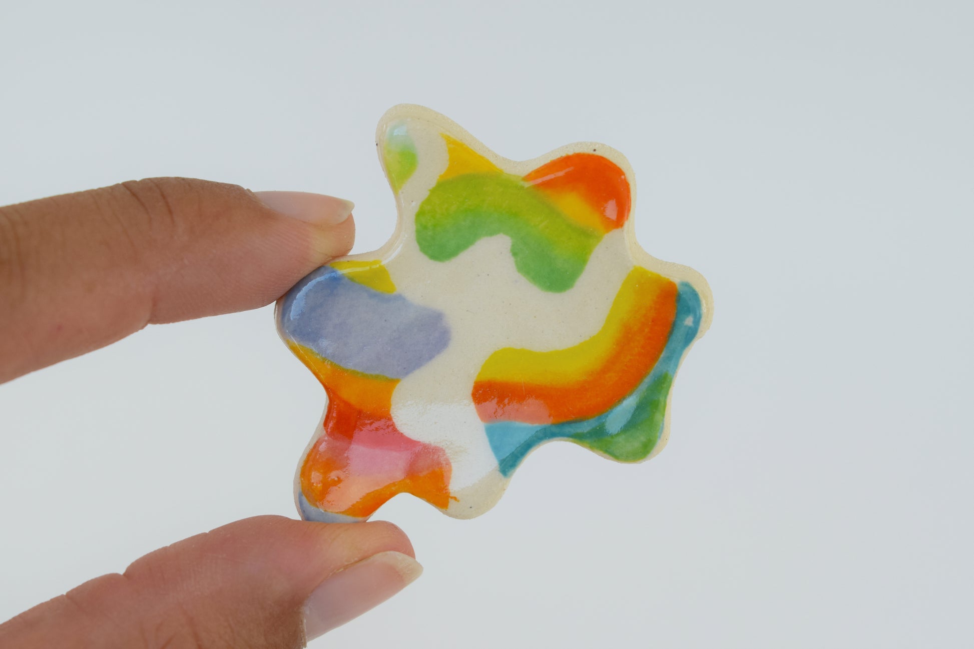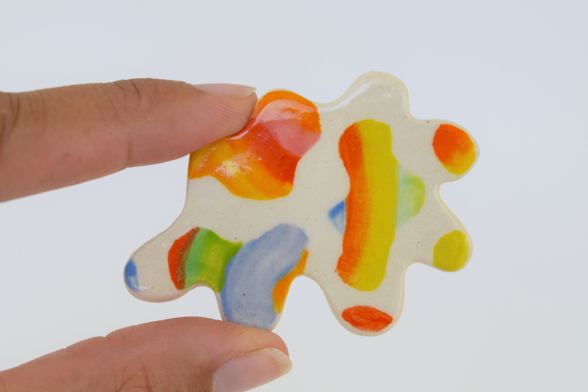 These multicoloured magnets are small bursts of joy — each one hand-cut, glazed, and individually fired to over 1200°C in my home studio. Inspired by both nature and architecture, they feature playful shapes and vibrant colours that bring life to any fridge, pinboard or magnetic surface. Every magnet is unique, with slight variations that reflect their handmade nature.