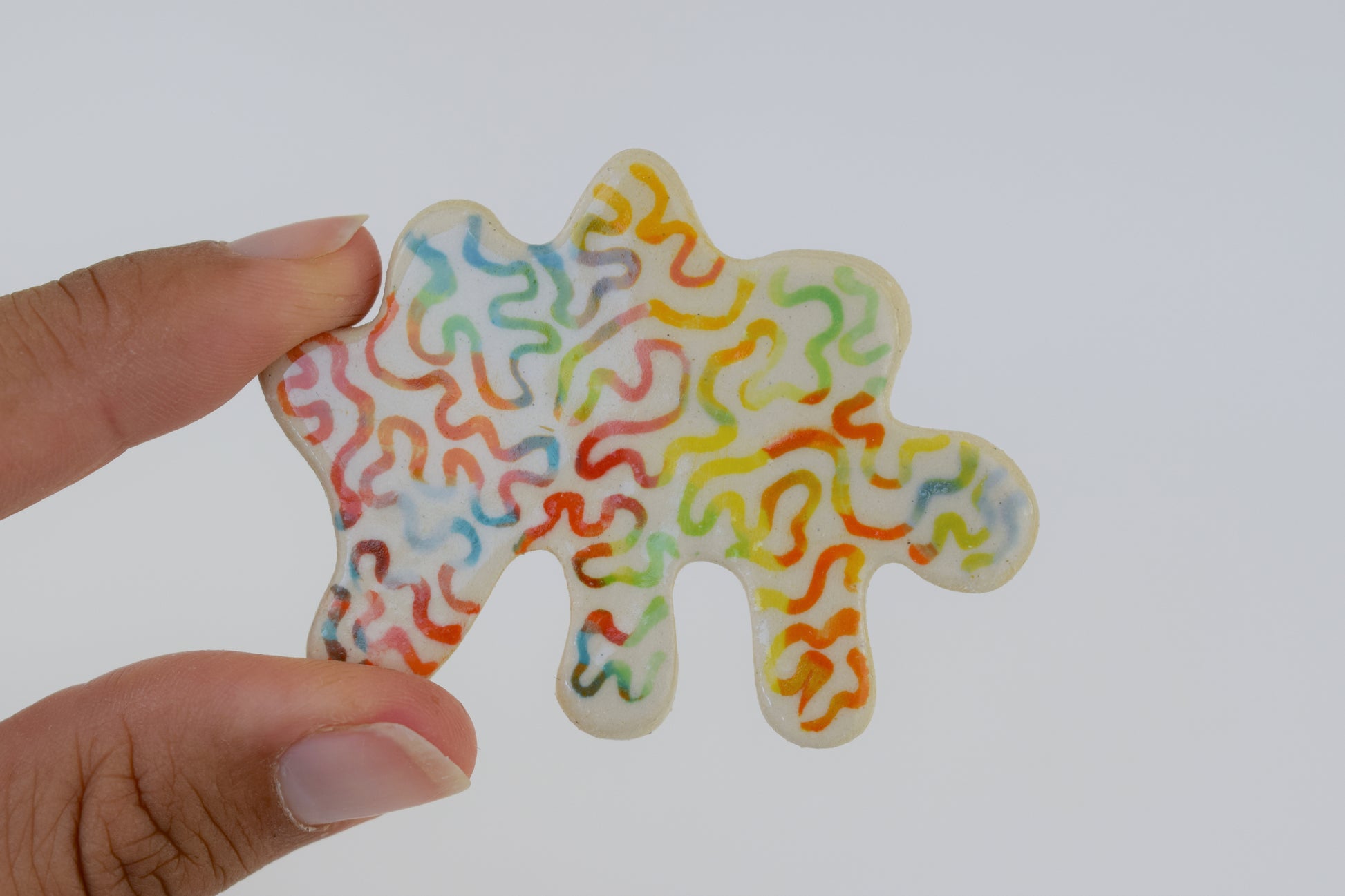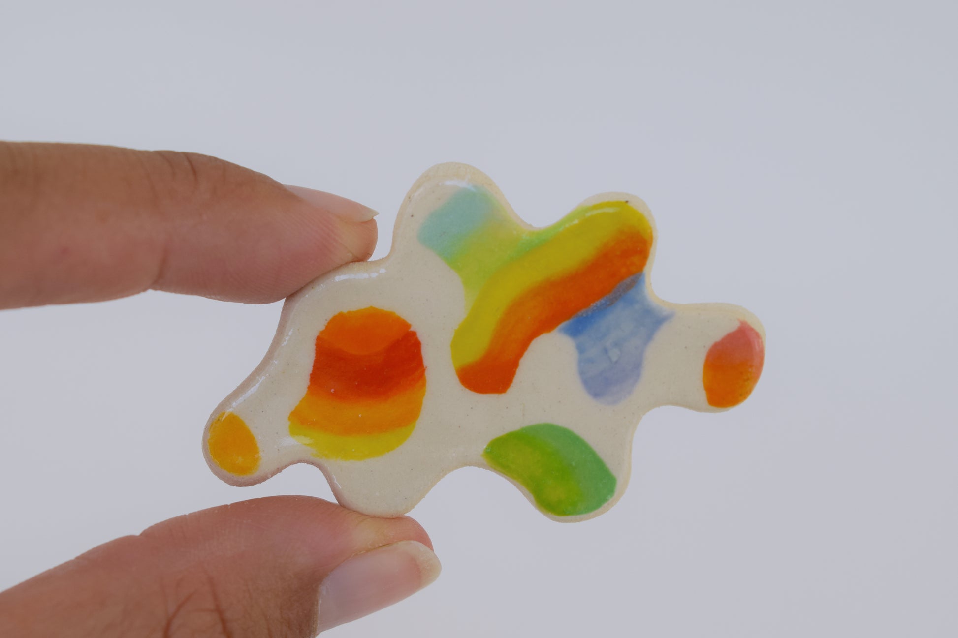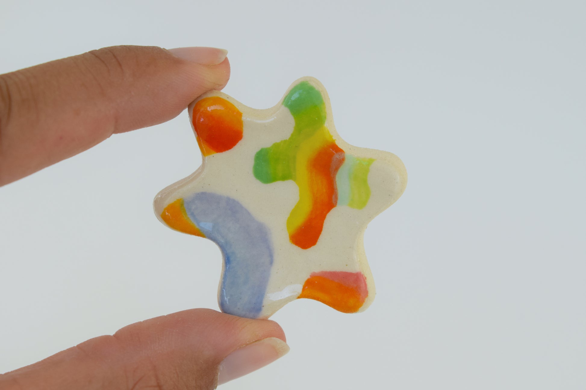 These multicoloured magnets are small bursts of joy — each one hand-cut, glazed, and individually fired to over 1200°C in my home studio. Inspired by both nature and architecture, they feature playful shapes and vibrant colours that bring life to any fridge, pinboard or magnetic surface. Every magnet is unique, with slight variations that reflect their handmade nature.