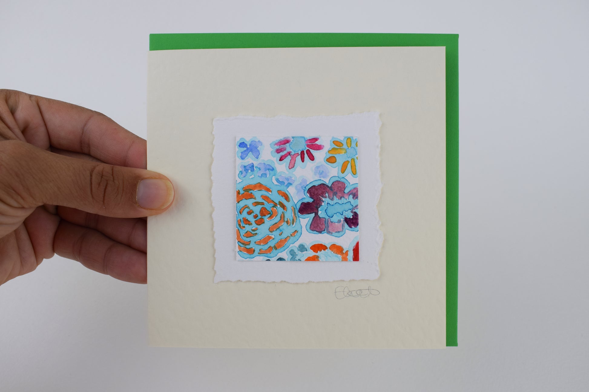 Every piece is created on high-quality 360gsm watercolour paper, then carefully mounted onto a luxurious 300gsm ivory hammered card. The result is a beautiful blend of texture, colour, and craftsmanship — perfect for sending a heartfelt message or keeping as a unique piece of art.