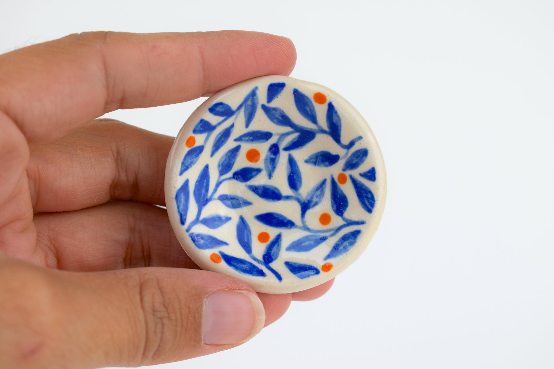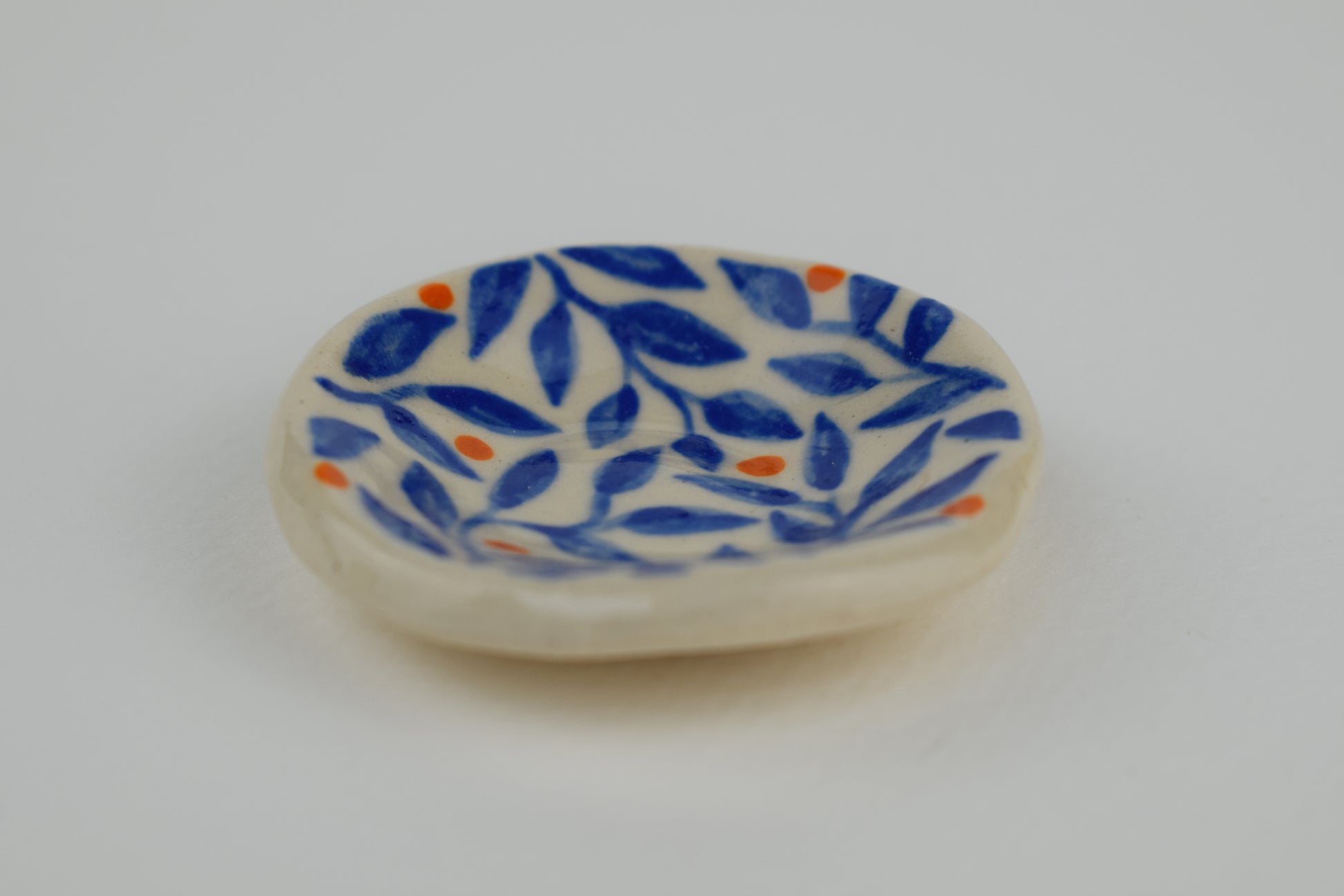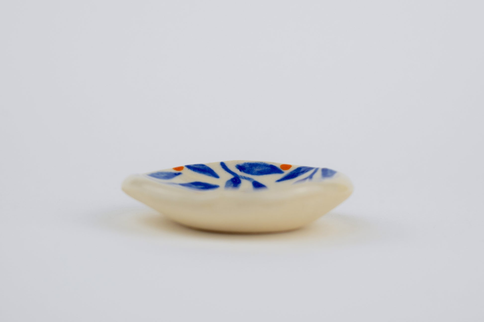 The Little Blue Leaf is a delicate, hand-formed ceramic made in my cosy home studio. This mini version features a gently ruffled edge and is twice-fired at over 1200°C for durability and a smooth finish. Its surface is decorated with a subtle, hand-painted pattern of blue leaves, evoking the calm beauty of a shaded woodland grove.
