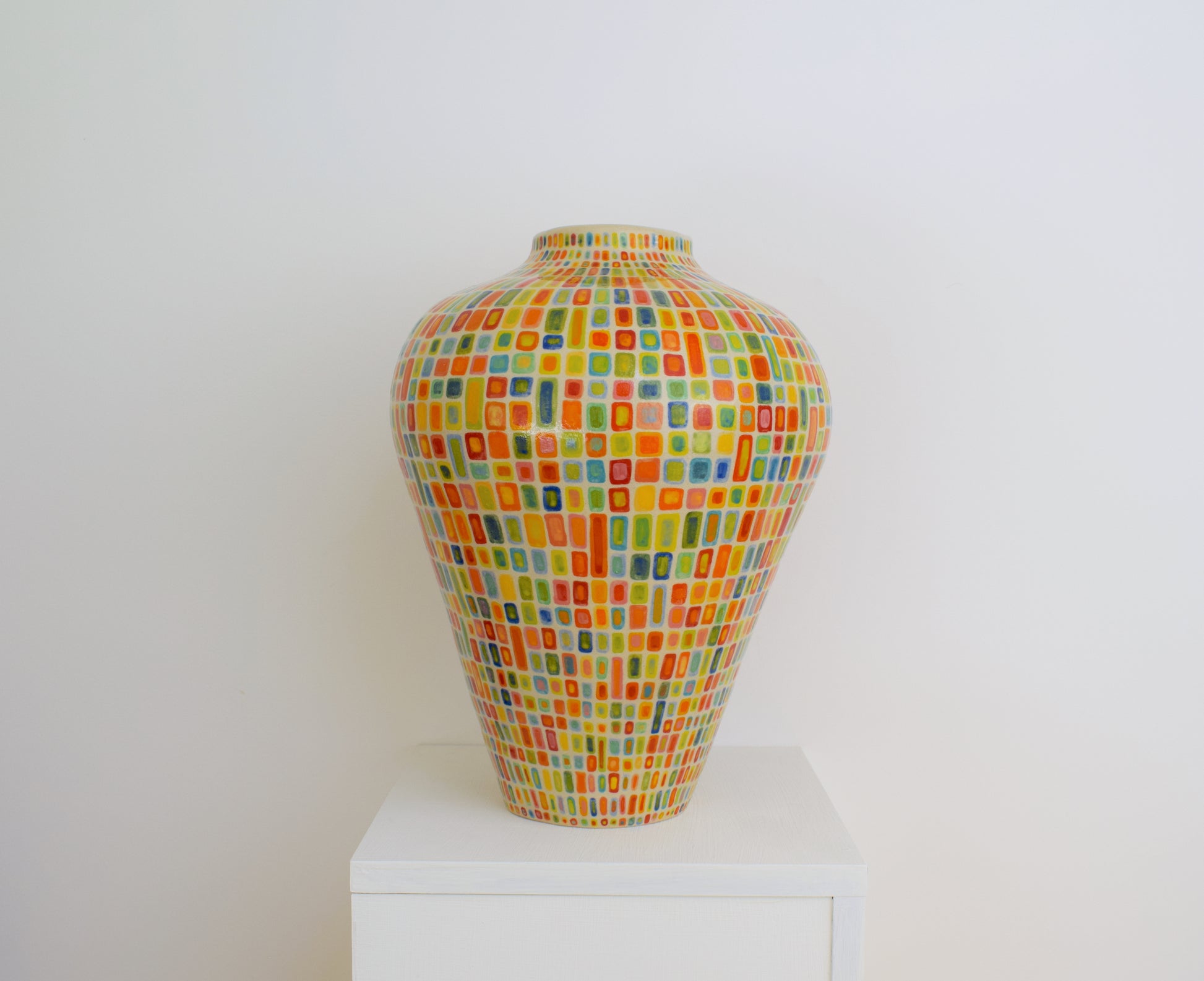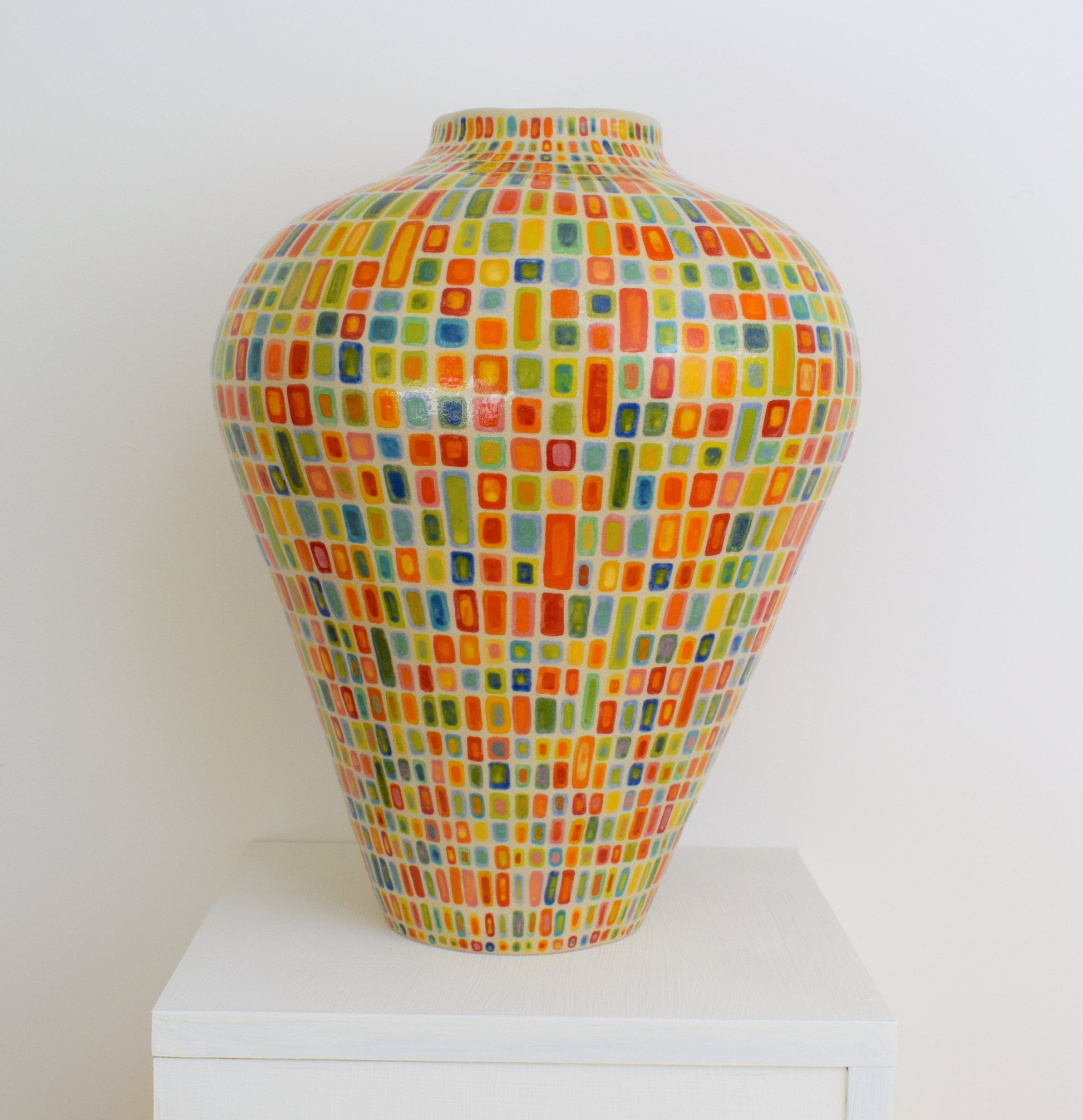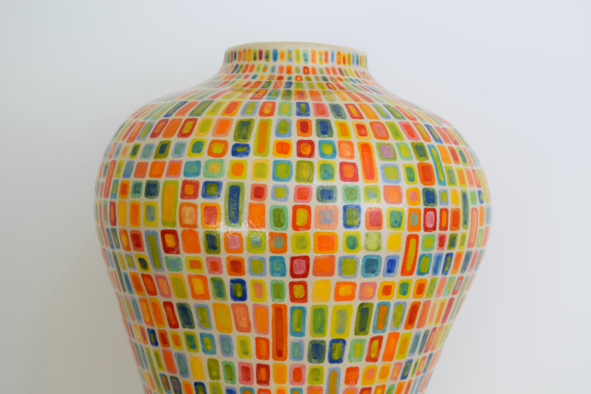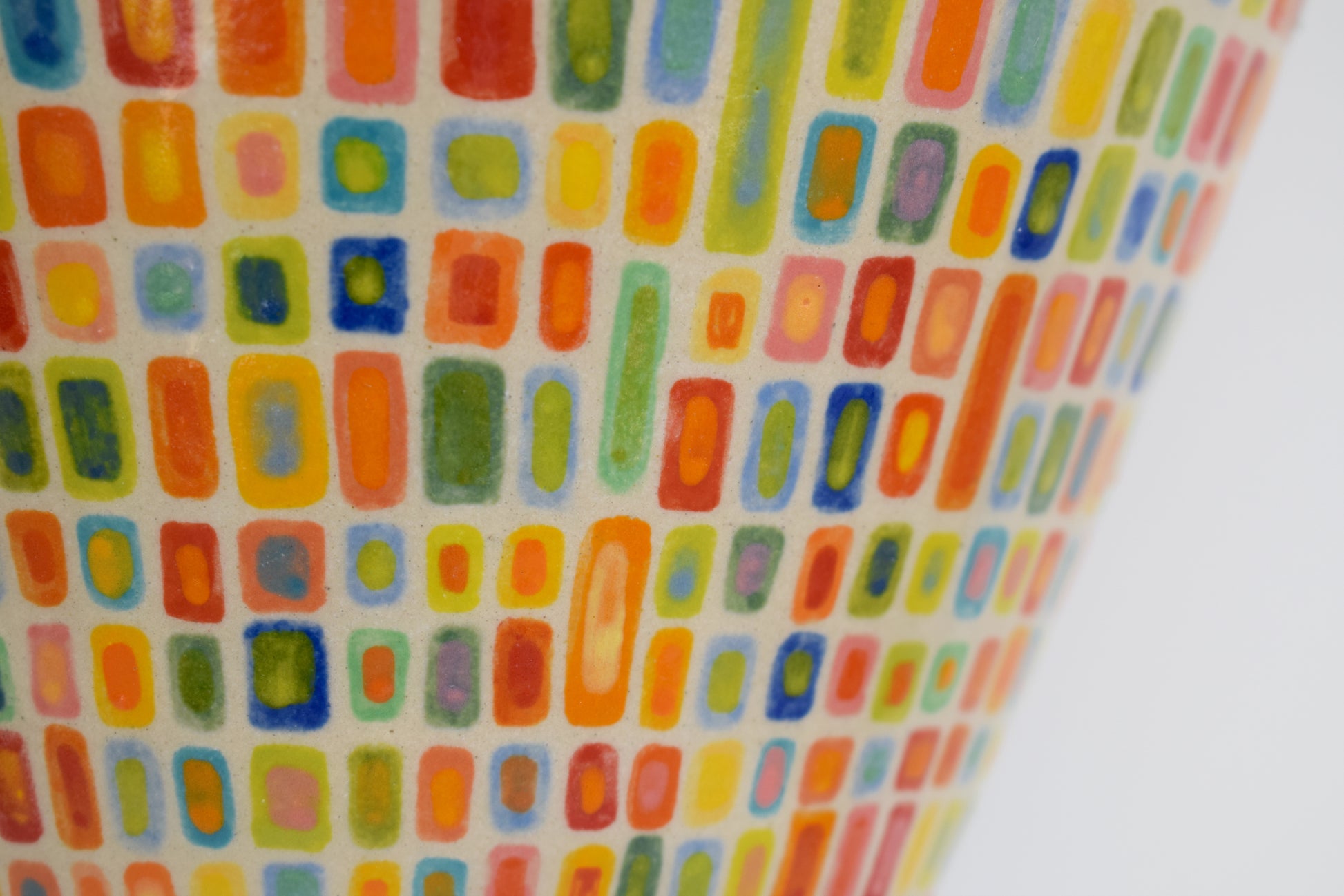 For the decoration, I started by drawing a grid over the entire surface. Within each square, I painted a small, repeating pattern: a square within a square. It’s a simple structure, but it becomes quite meditative when repeated over the whole surface. There is approximately 3400 squares and each square has its own slight variation in color or spacing, which gives the pattern some quiet movement. I used a range of vibrant glazes, letting them shift slightly in tone and intensity from one section to the next.