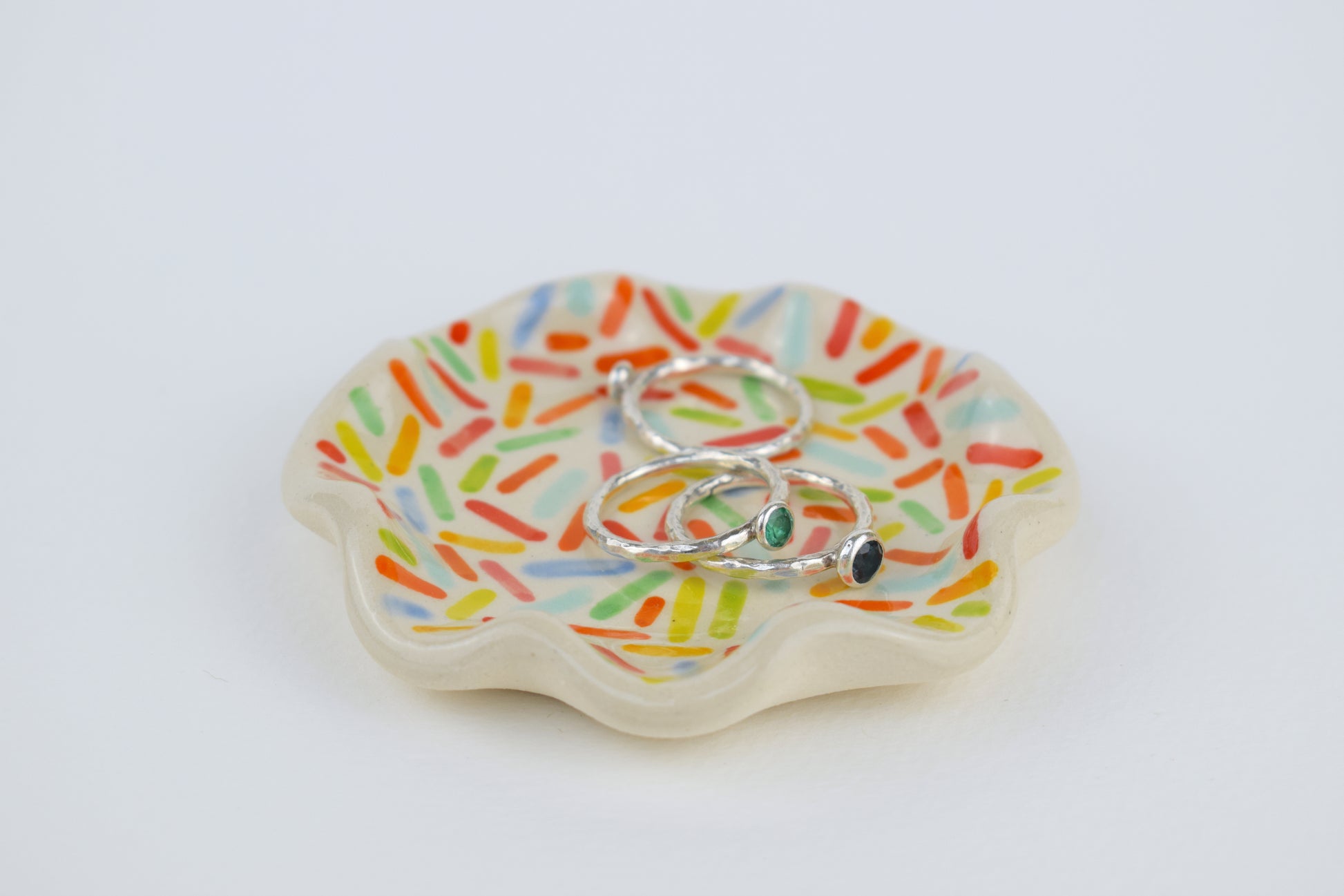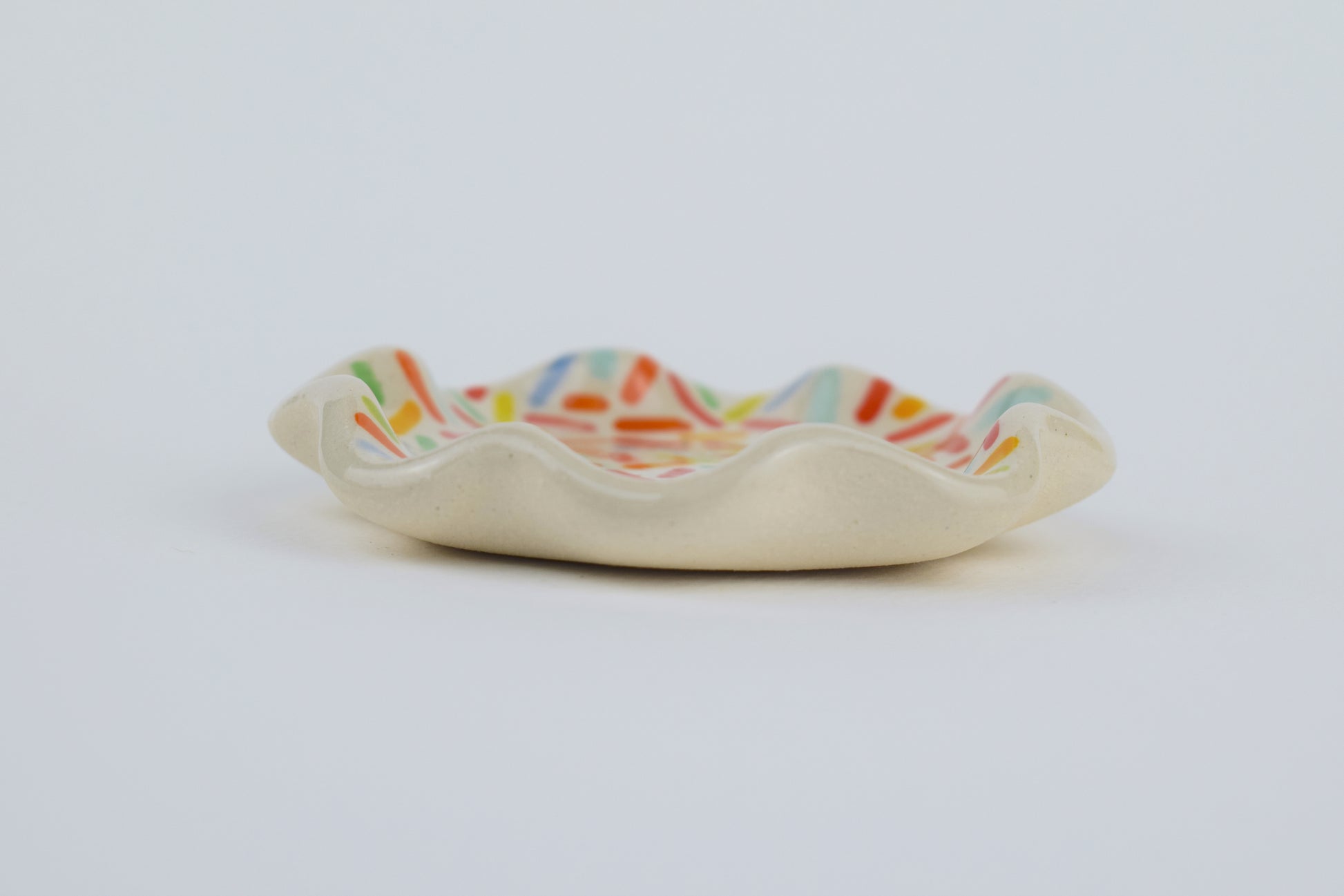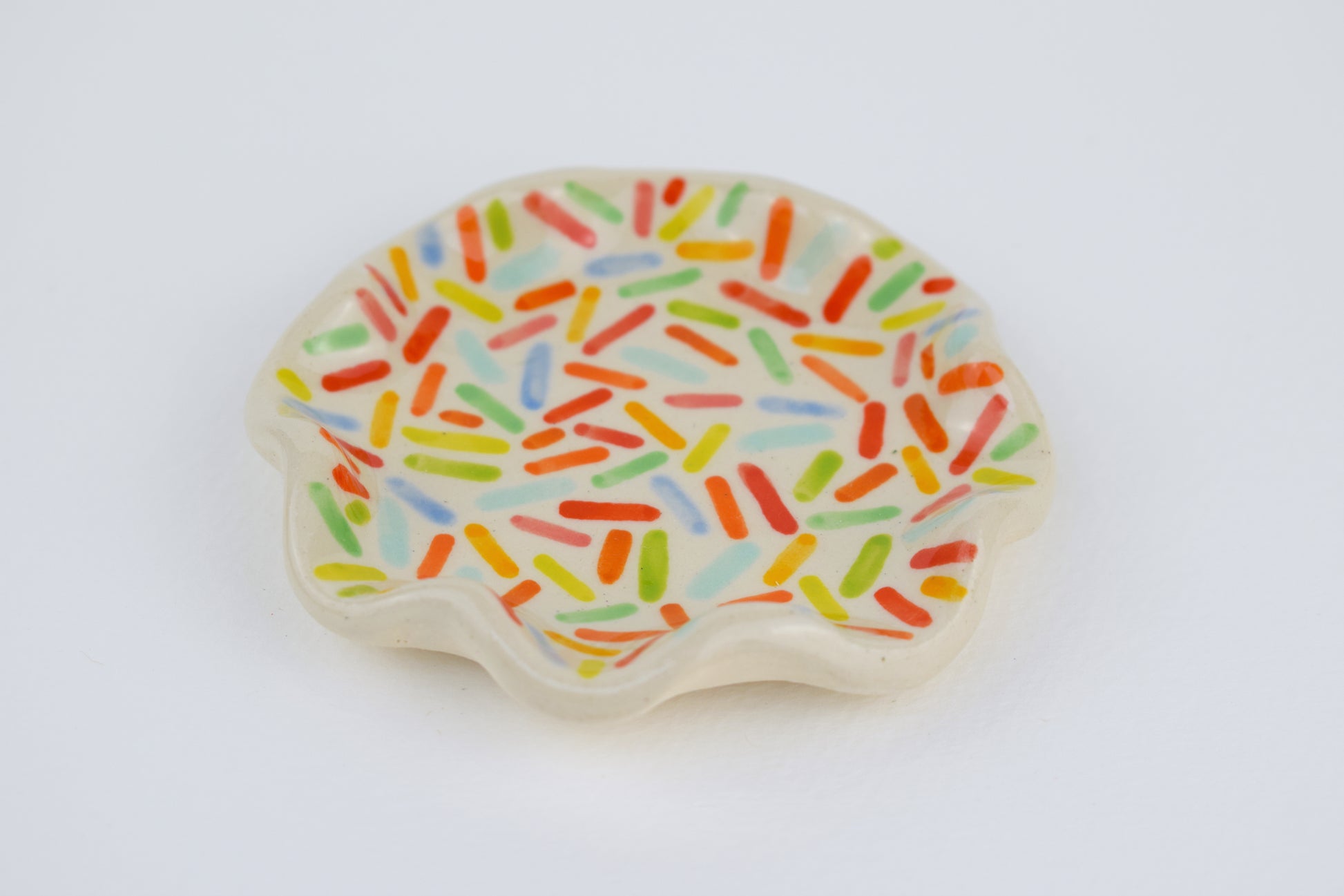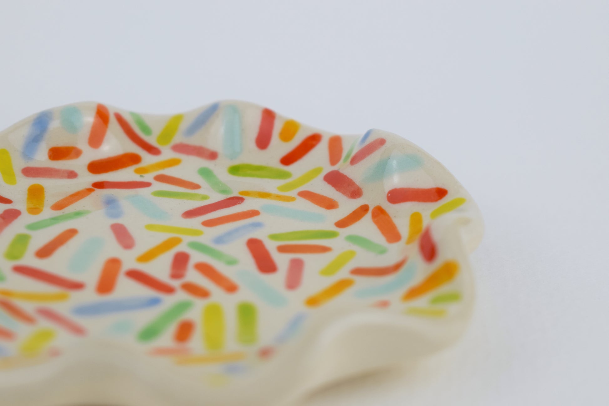 The Multicoloured Sprinkle Dish is a hand-formed ceramic piece made in my home studio, shaped with a softly scolloped edge and kiln-fired twice to over 1200°C. Its surface is decorated with a scattered pattern of hand-painted sprinkles in a range of bright, cheerful glazes.