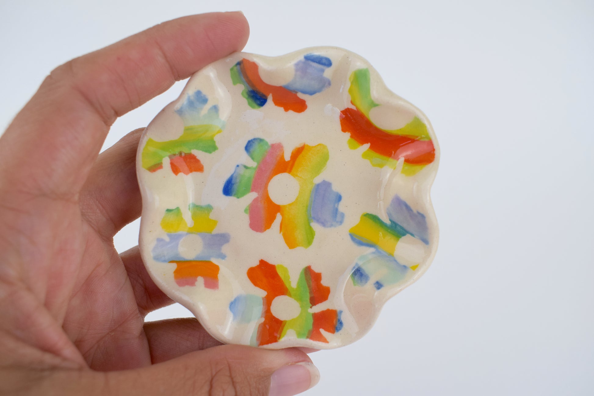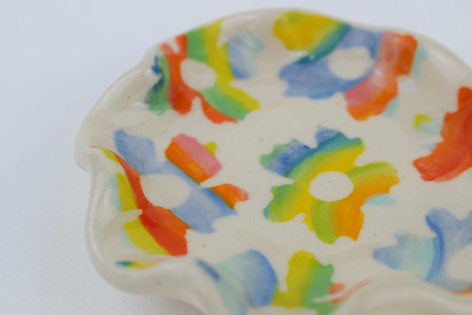 The Multicoloured Meadow Dish is a joyful, hand-formed ceramic made in my cosy home studio. Shaped with a soft, ruffled edge and fired twice to over 1200°C, this one-of-a-kind piece is decorated with tiny hand-painted flowers in a rainbow of glazes.