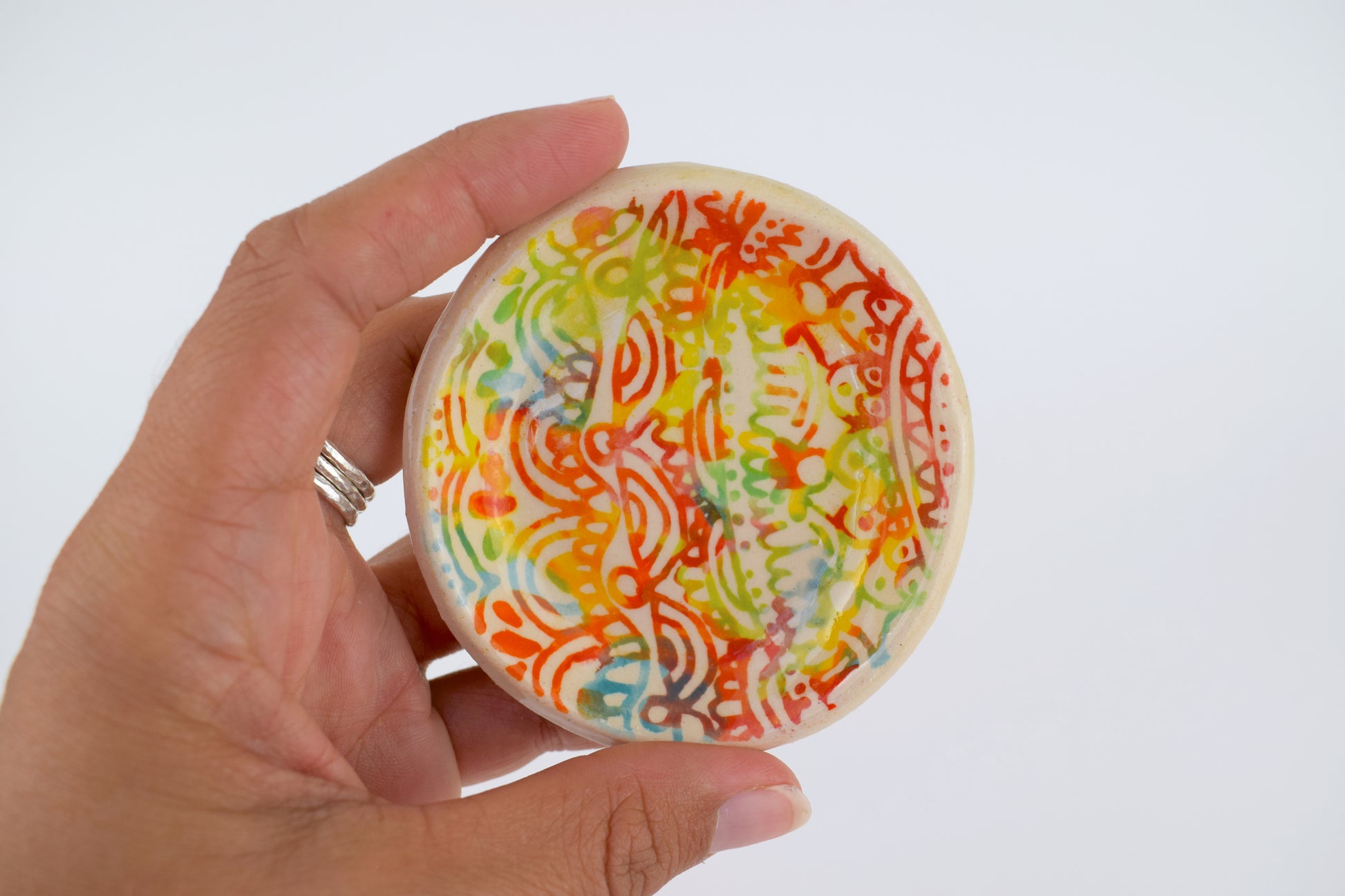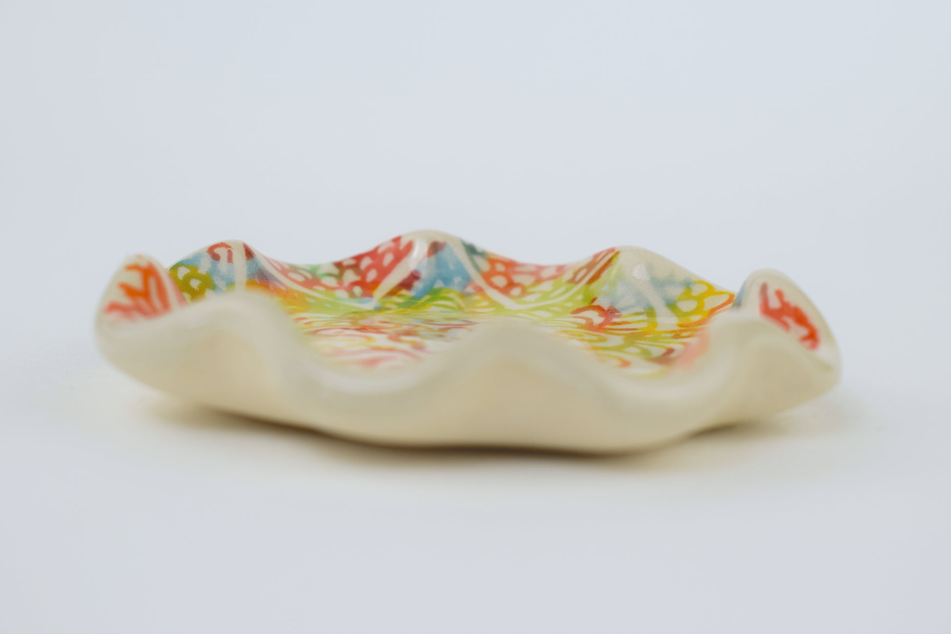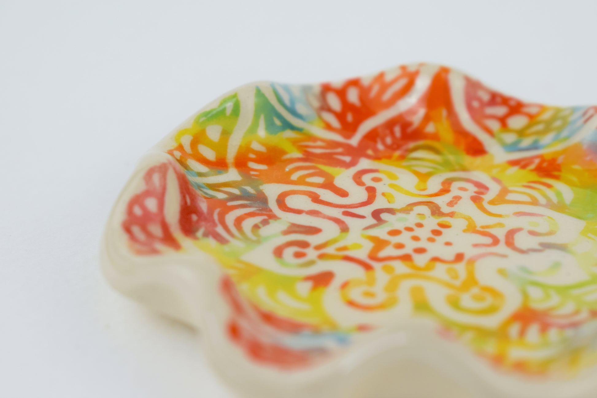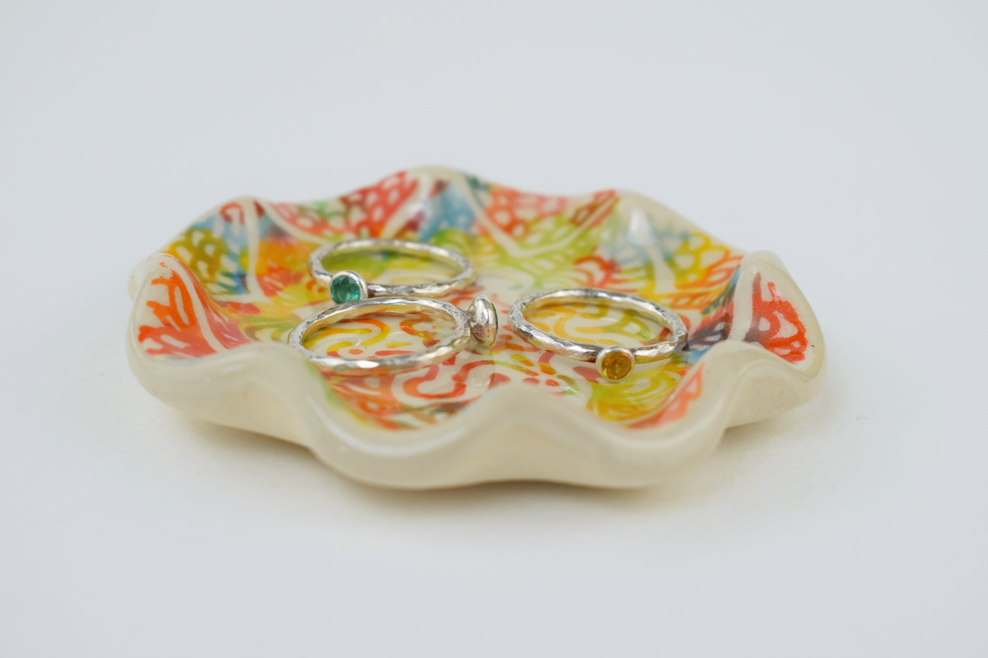 The joyful patterned trinket dish is a hand-thrown, one-of-a-kind ceramic, crafted in my cosy home studio. Fired twice to over 1200°C, it’s both durable and delightfully decorative. Each piece features a unique, hand-painted design in vibrant, layered glazes — a tiny celebration of colour and joy!