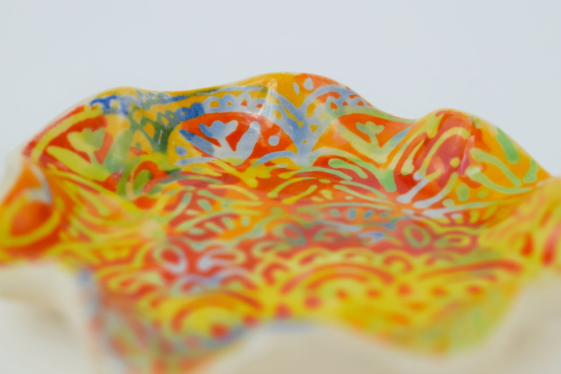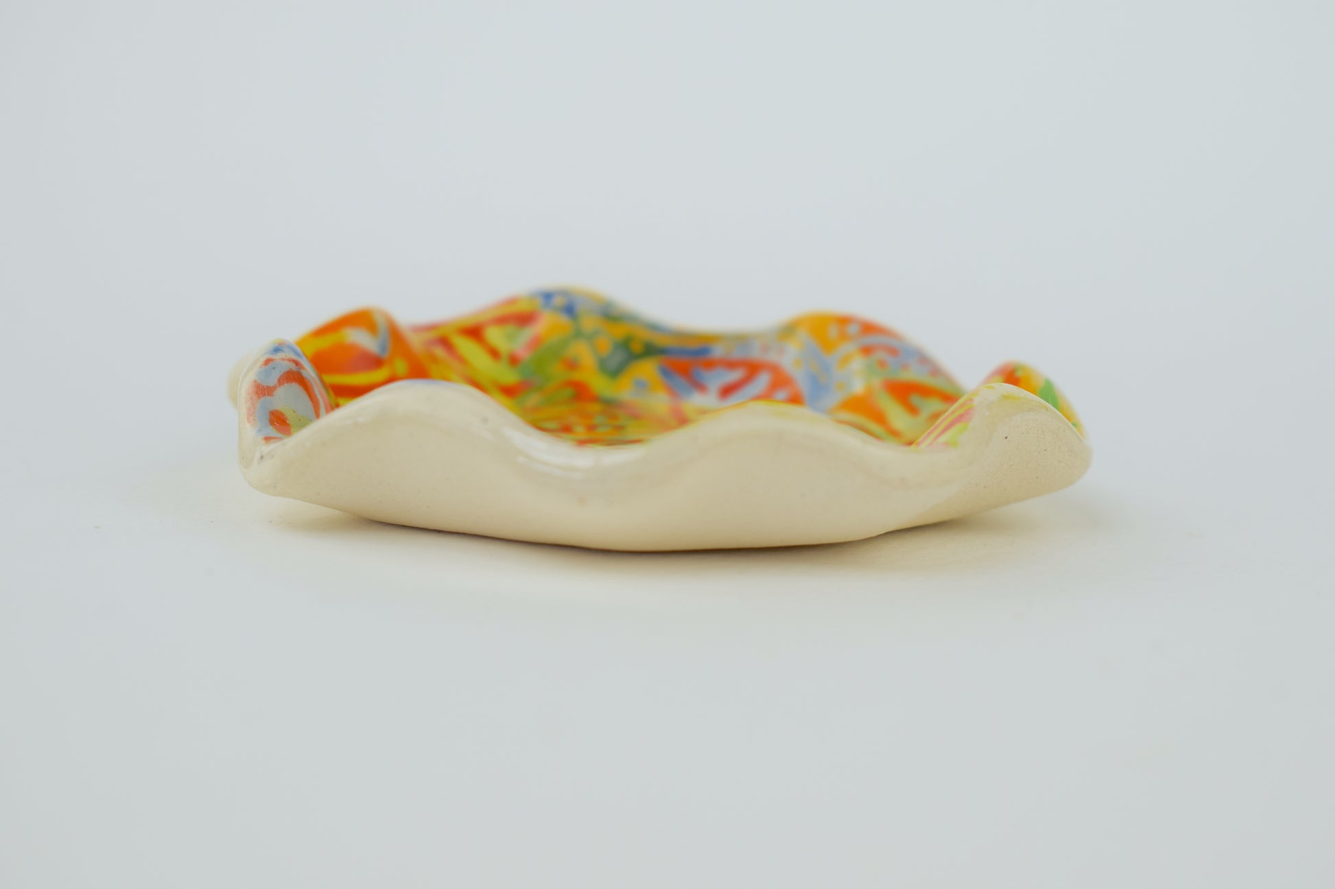 The joyful patterned trinket dish is a hand-thrown, one-of-a-kind ceramic, crafted in my cosy home studio. Fired twice to over 1200°C, it’s both durable and delightfully decorative. Each piece features a unique, hand-painted design in vibrant, layered glazes — a tiny celebration of colour and joy!
