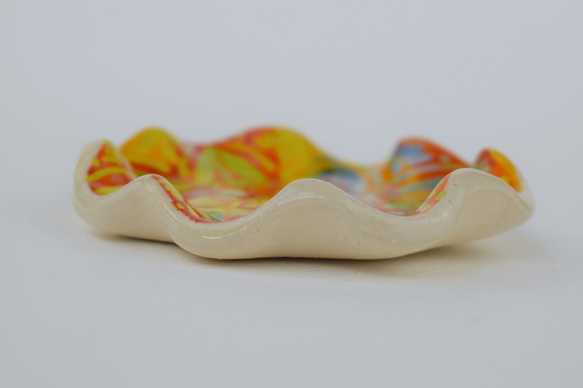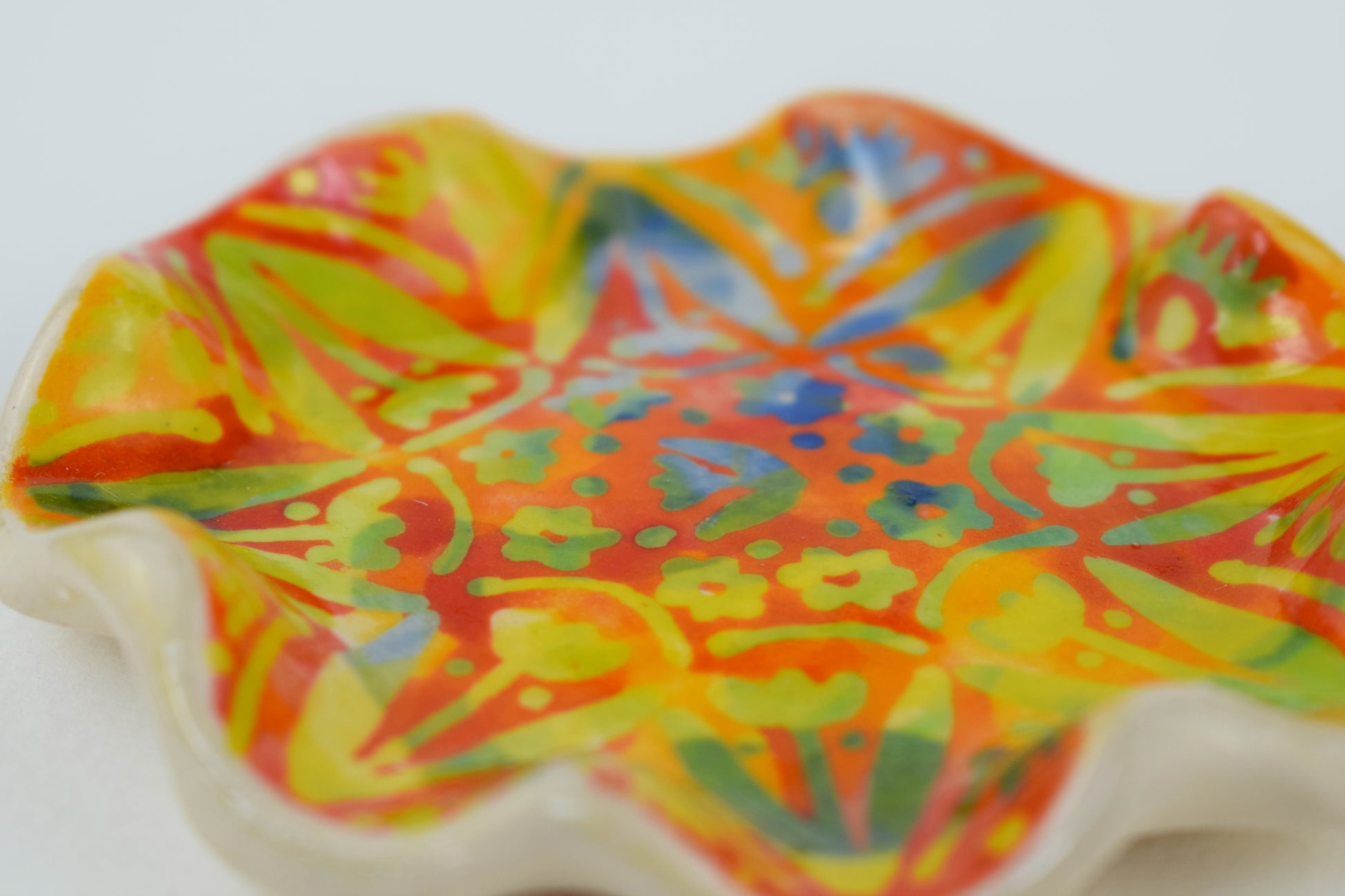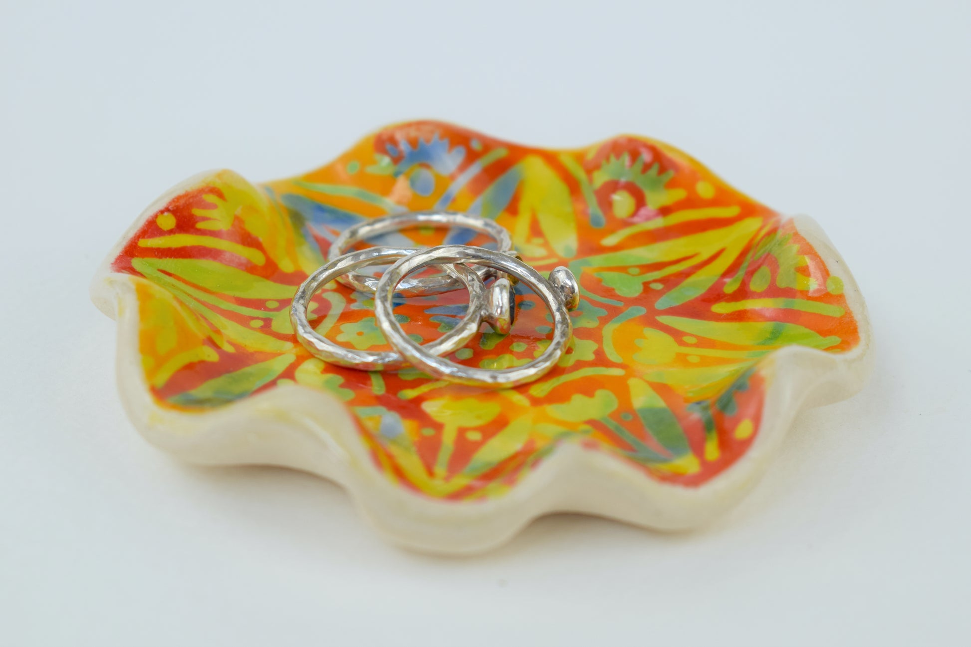 The joyful patterned trinket dish is a hand-thrown, one-of-a-kind ceramic, crafted in my cosy home studio. Fired twice to over 1200°C, it’s both durable and delightfully decorative. Each piece features a unique, hand-painted design in vibrant, layered glazes — a tiny celebration of colour and joy!