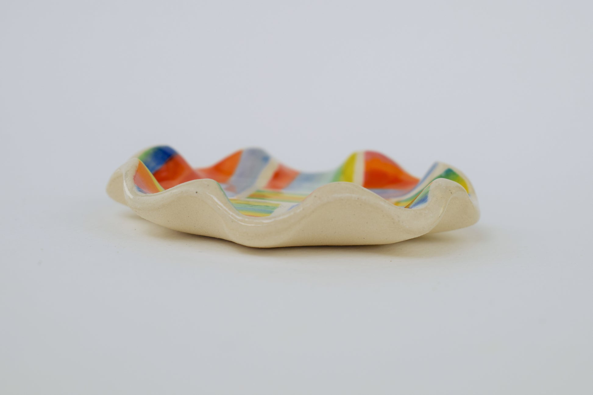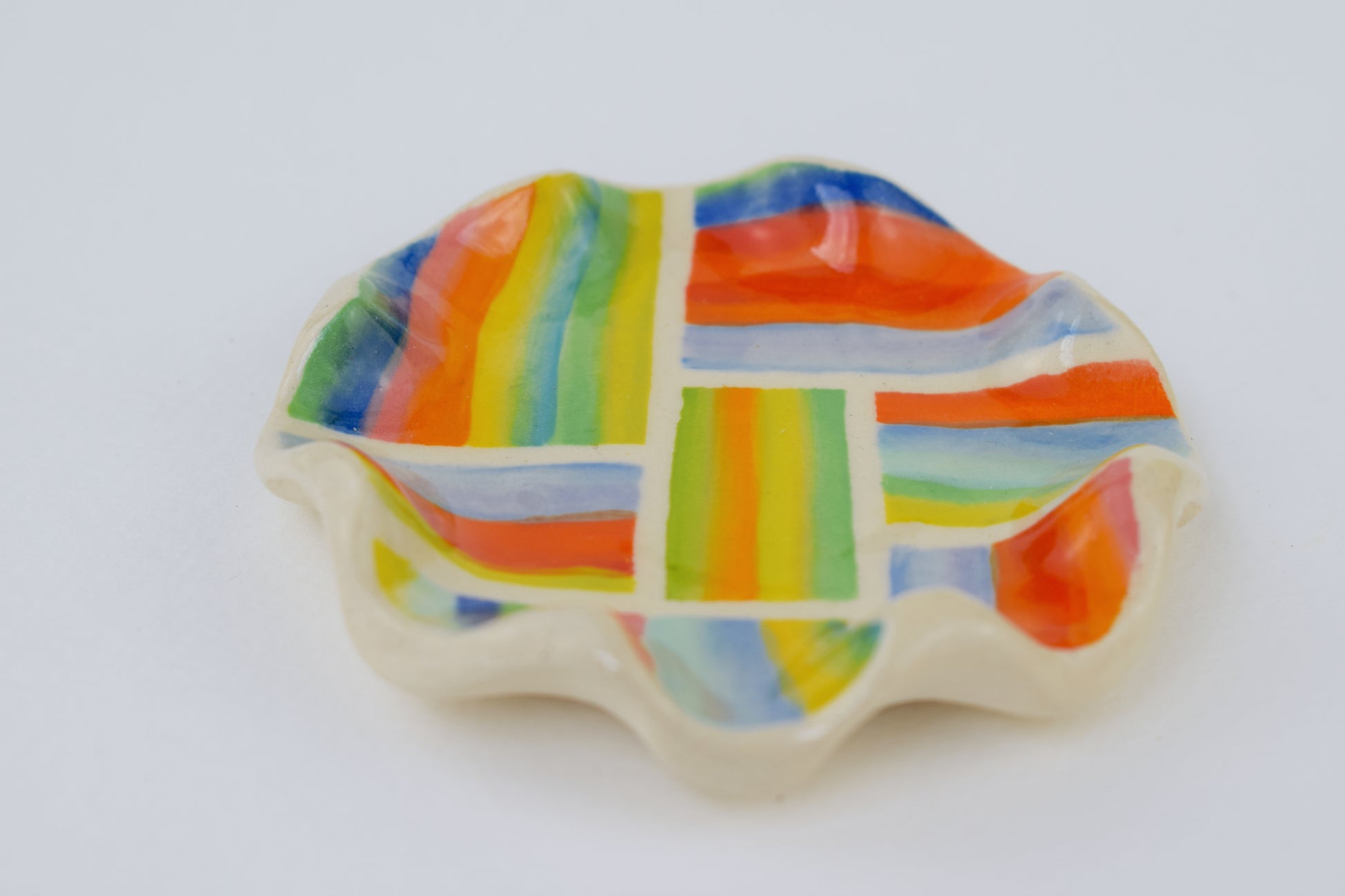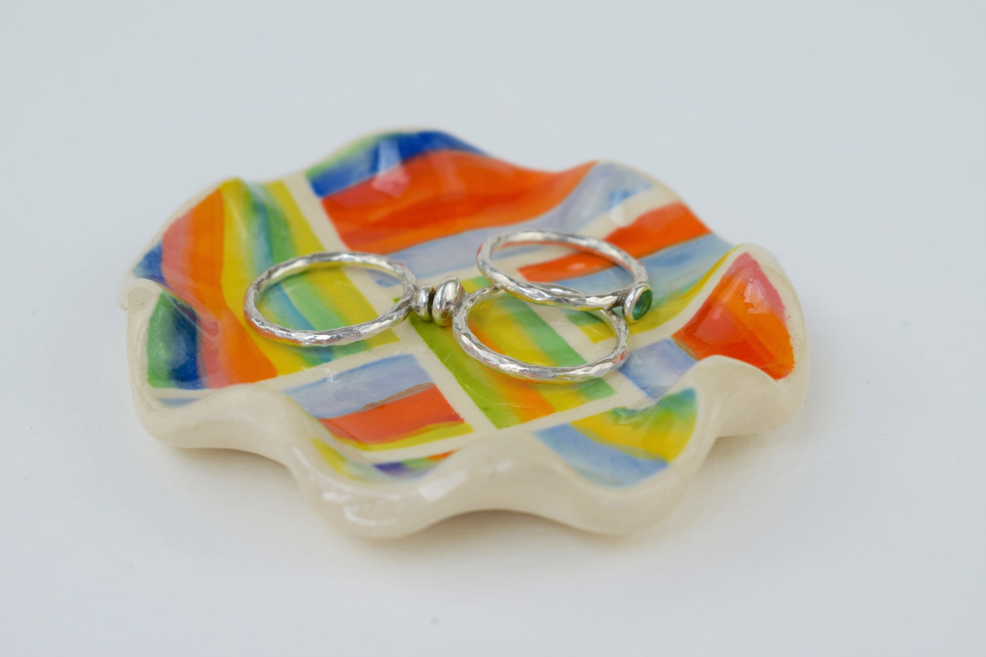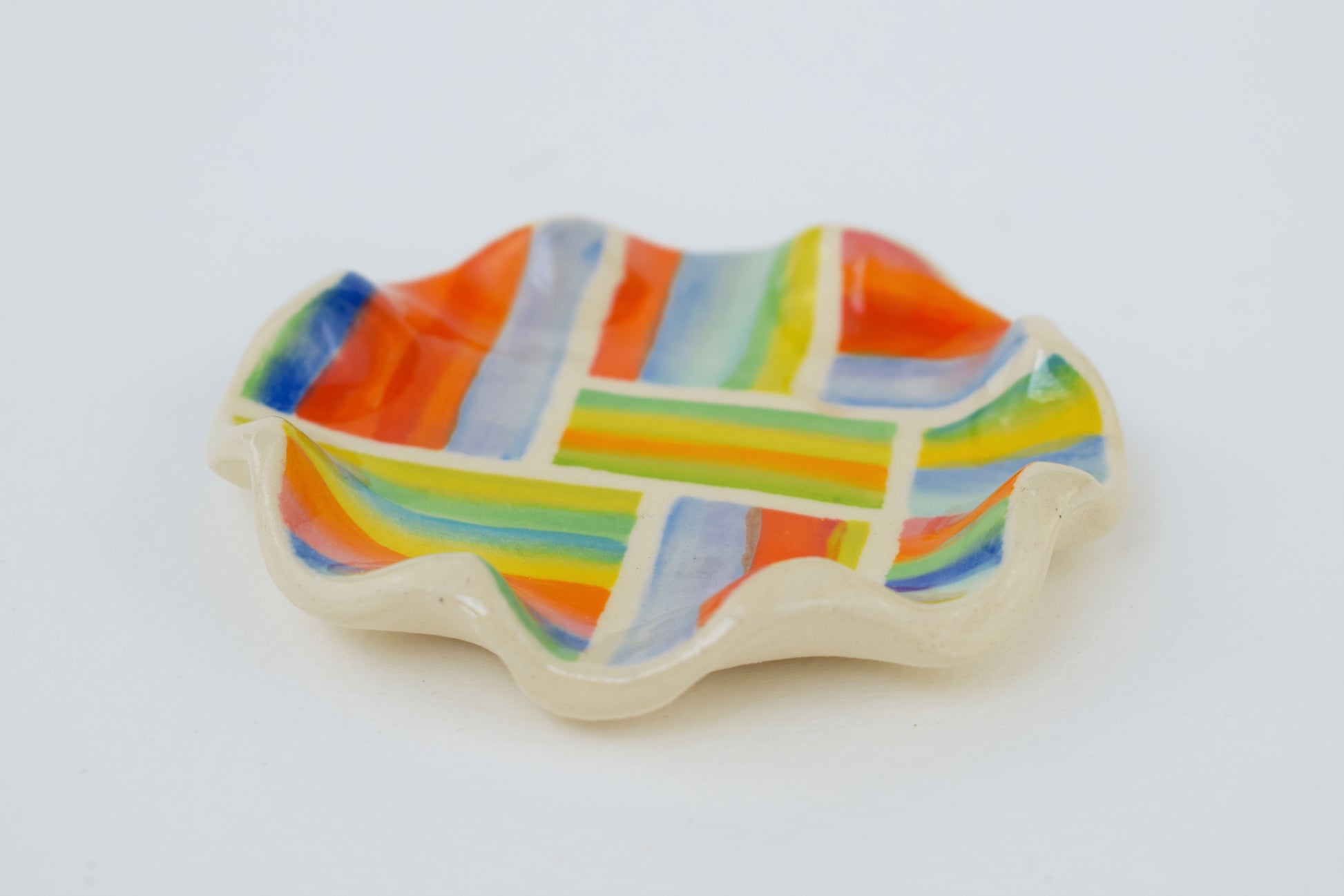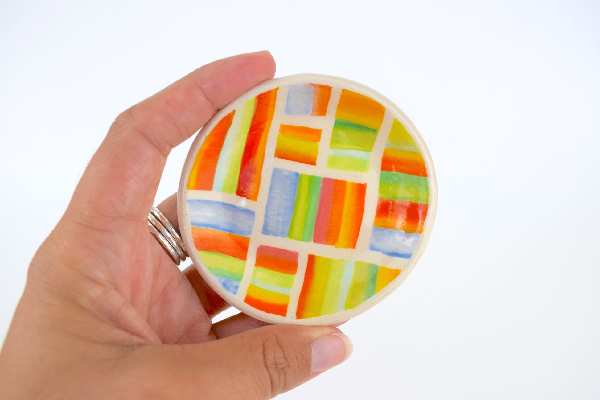 The joyful patterned trinket dish is a hand-thrown, one-of-a-kind ceramic, crafted in my cosy home studio. Fired twice to over 1200°C, it’s both durable and delightfully decorative. Each piece features a unique, hand-painted design in vibrant, layered glazes — a tiny celebration of colour and joy!