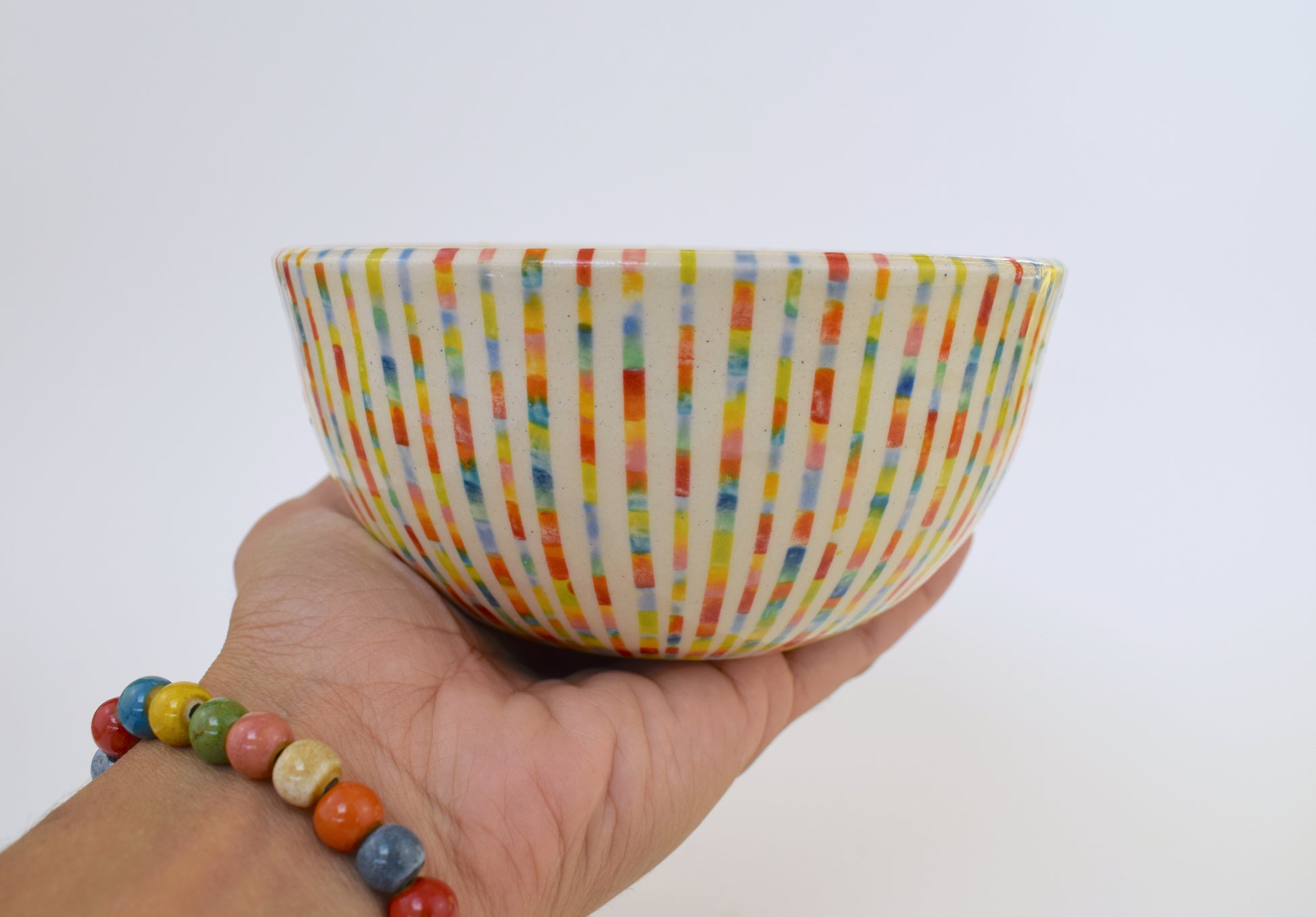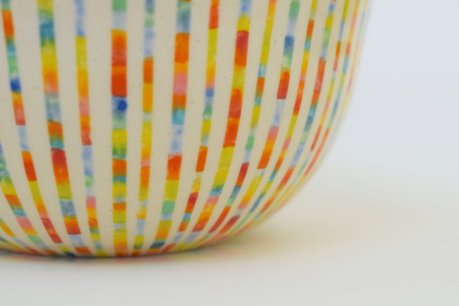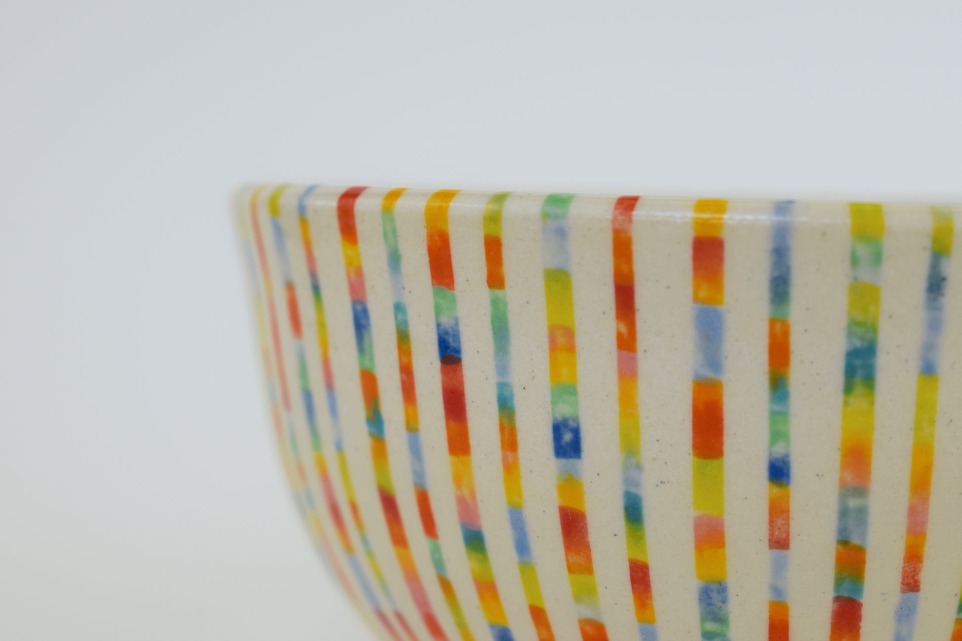 Each stripe is hand-painted, so no two bowls are ever the same. It's a cheerful everyday piece with a bright personality. Slightly discounted due to one small glaze defect on the outside of the bowl.