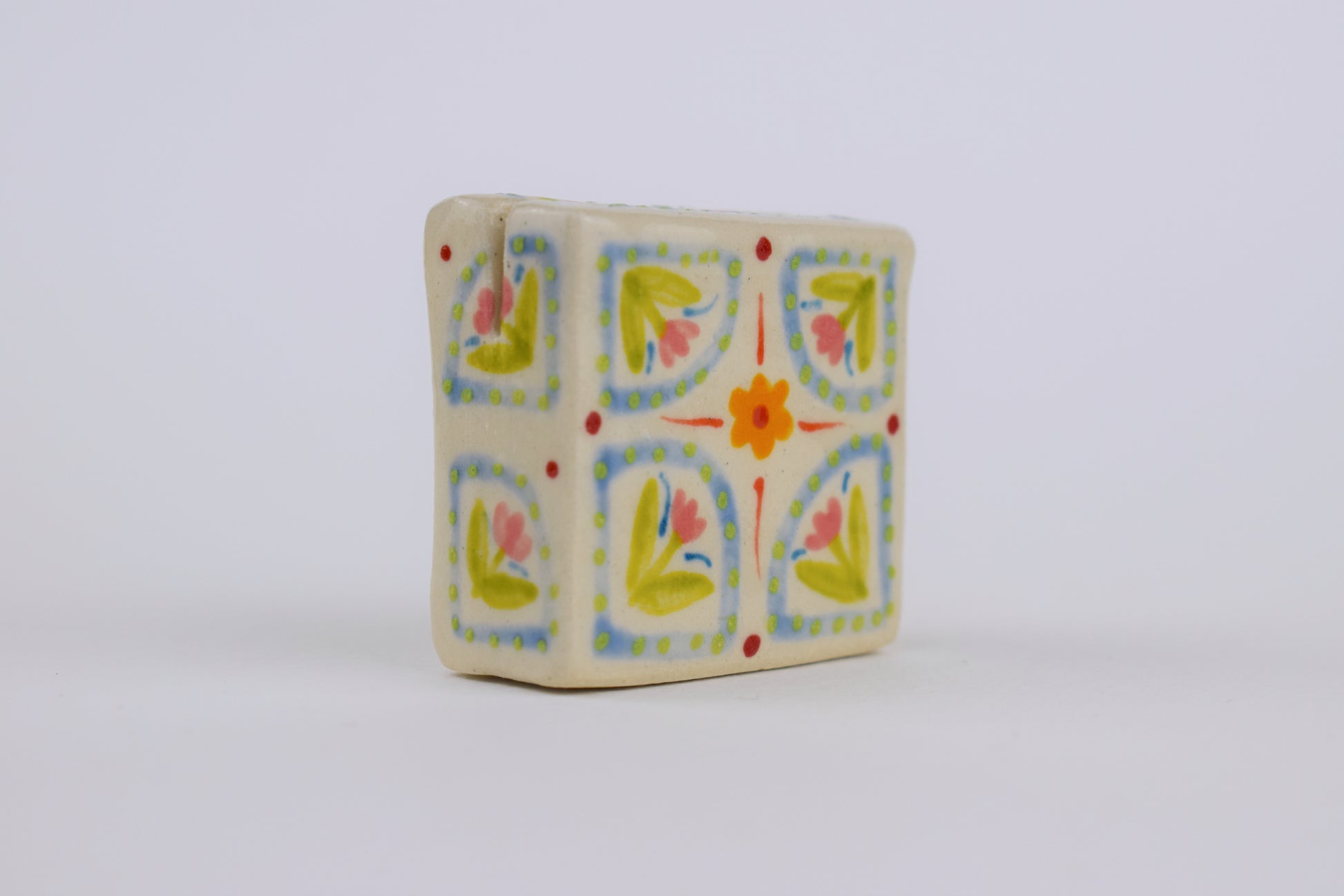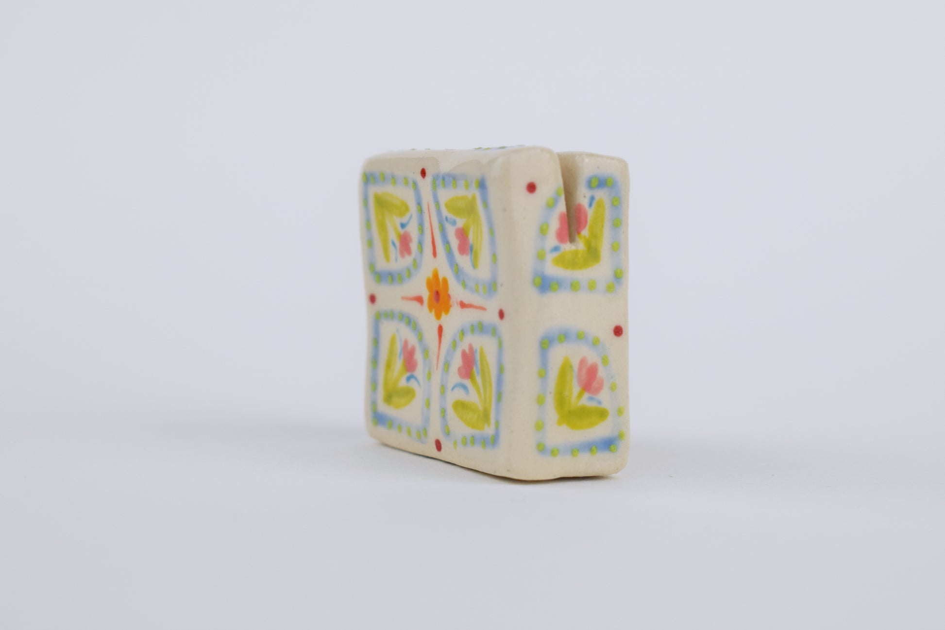 Elevate your favourite memories with this handcrafted stoneware photo holder, uniquely designed and hand-painted in my cosy home studio. Each piece is individually formed, glazed and fired twice to over 1200 degrees! The holder features a gentle angled slot that subtly tilts your photos, postcards or to do lists, for an elegant display, perfect for desks, shelves, or bedside tables.