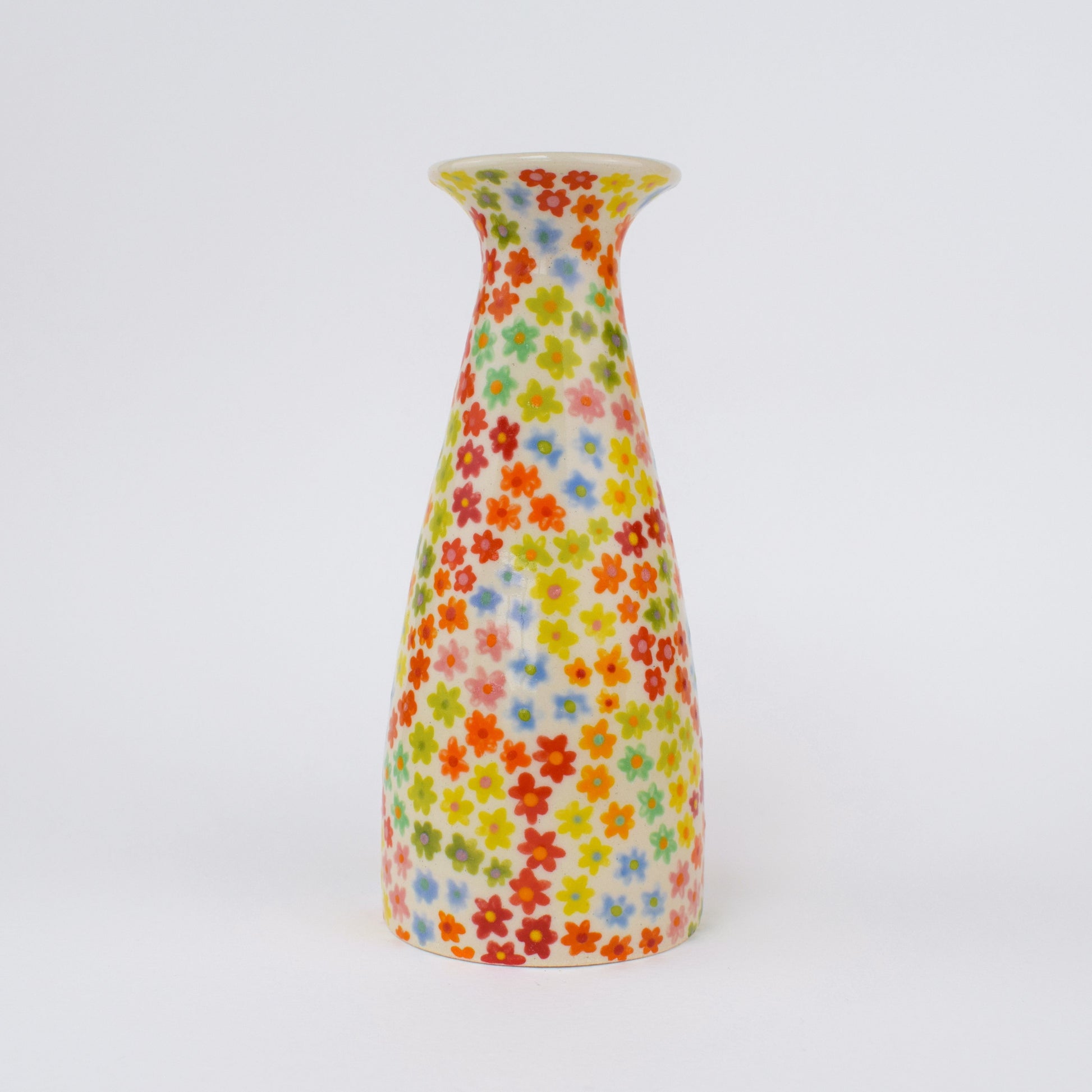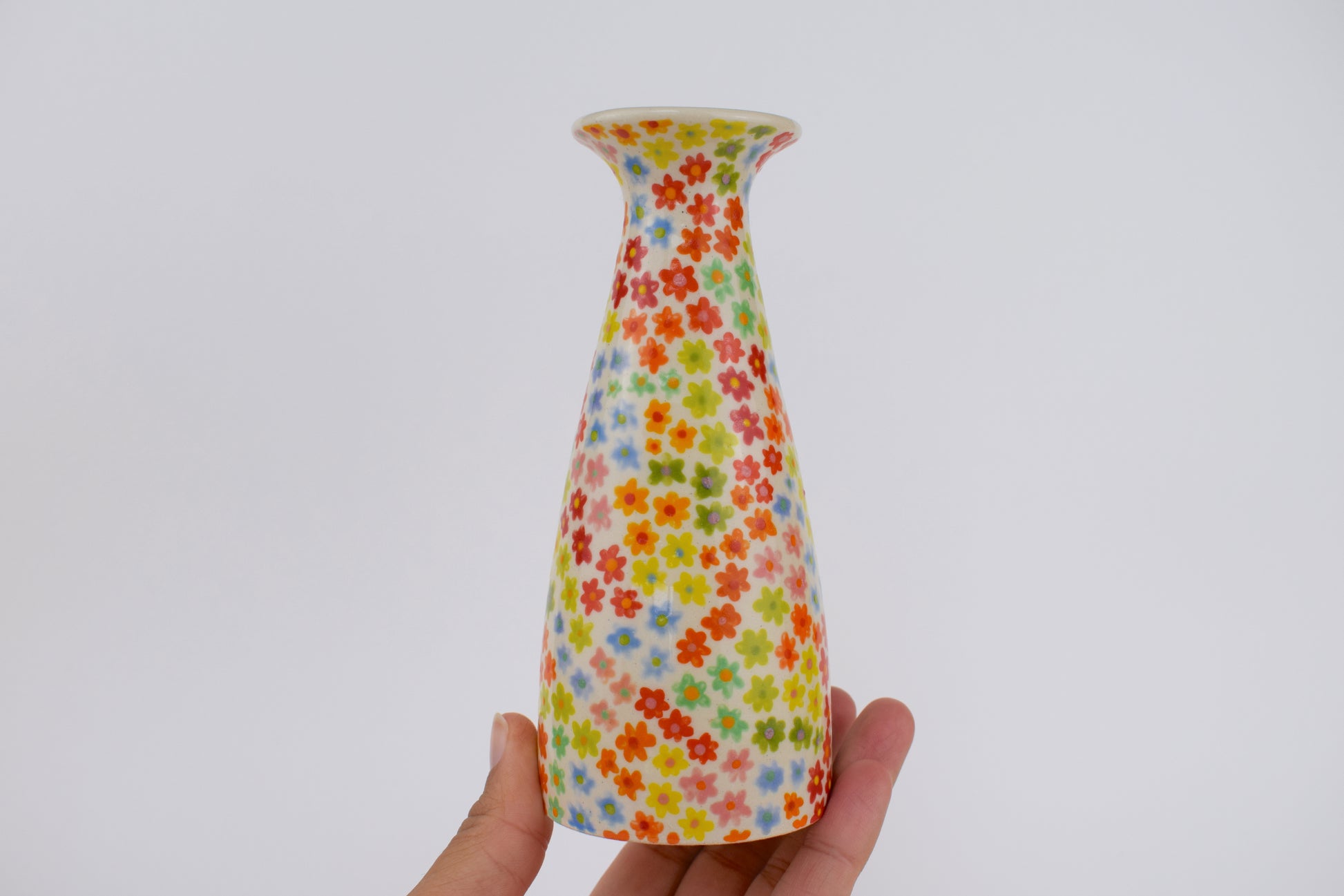The Petal Patch Vase is a hand-thrown stoneware ceramic, lovingly crafted in my cosy home studio and fired to over 1200°C. Each piece is completely unique, decorated with clusters vibrant hand-painted flowers — each cluster sharing a single colour, forming a joyful patchwork across the surface. This subtle repetition creates a gentle rhythm, like a small garden blossoming in carefully arranged bursts of colour.