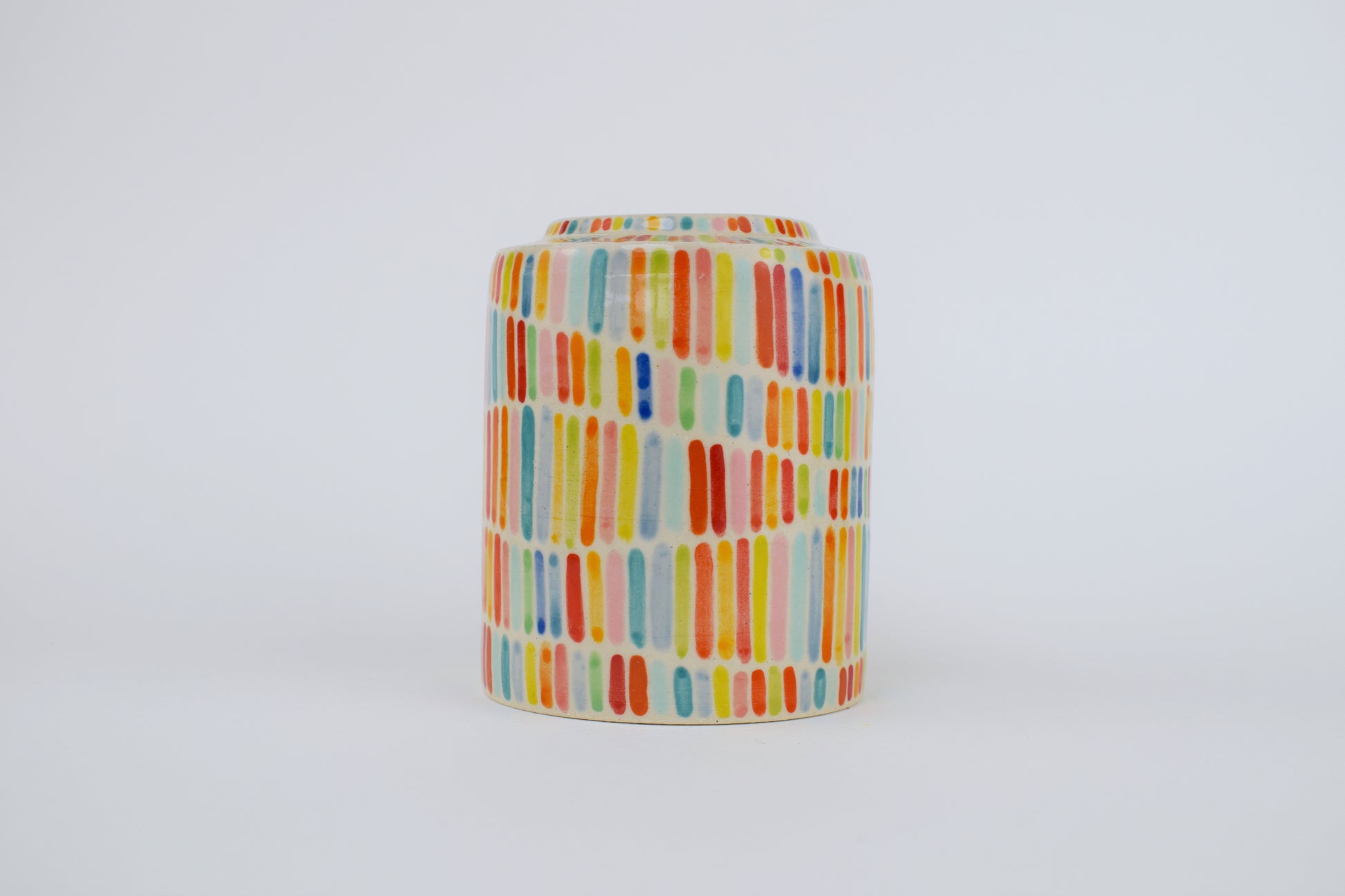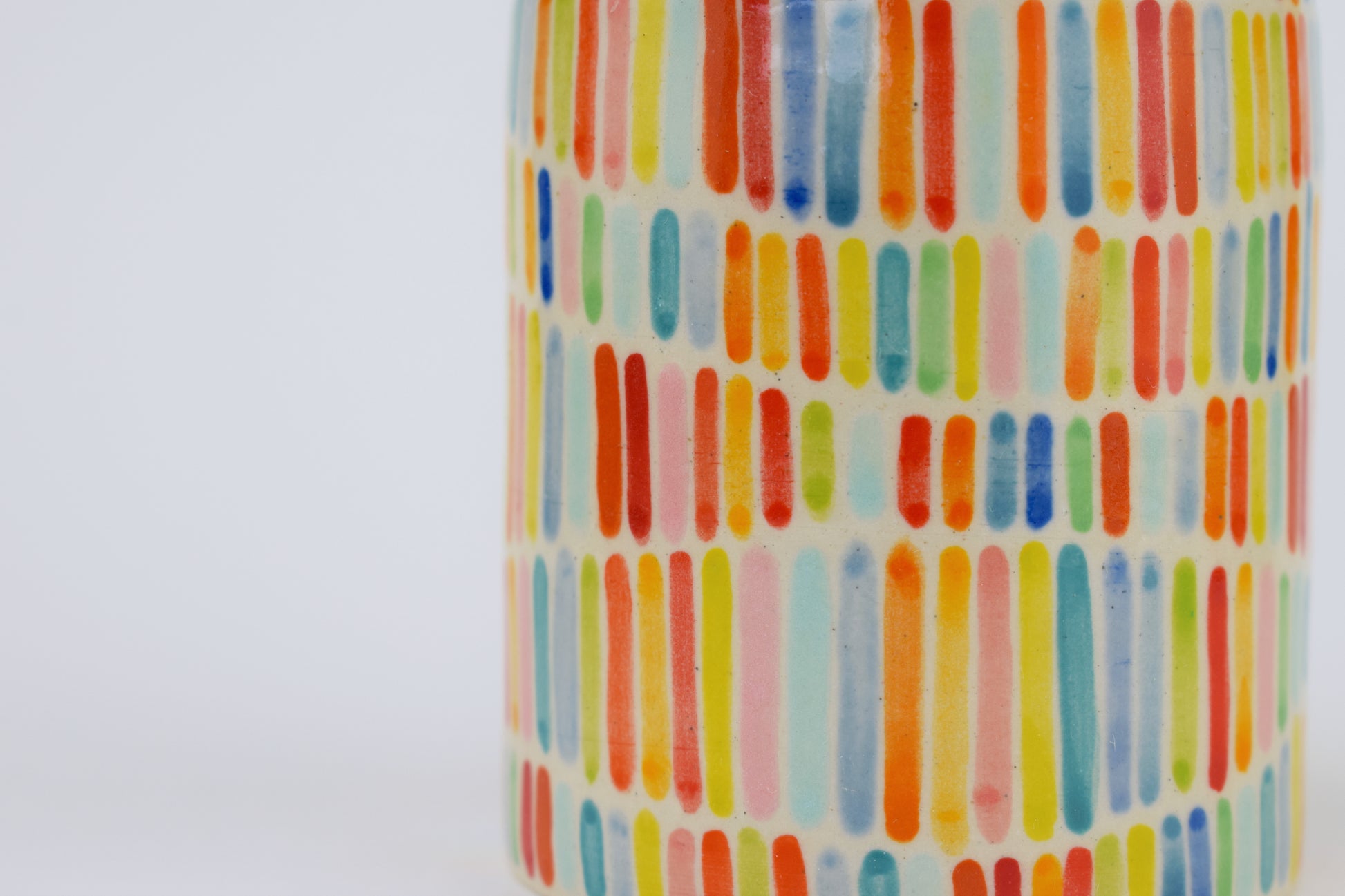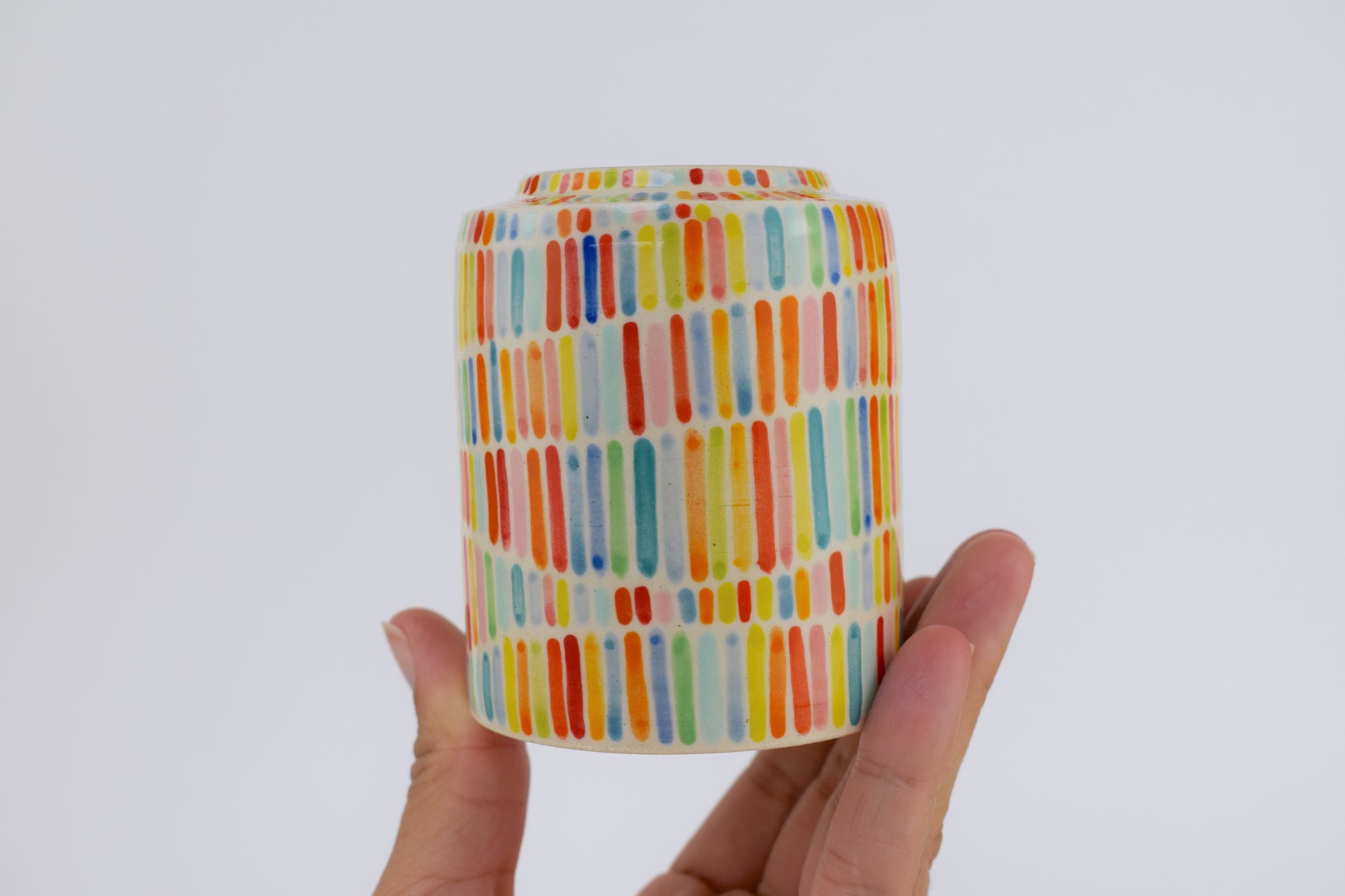 The Rainbow Ribbon Vase is a hand-thrown stoneware ceramic, made in my cosy home studio and fired to over 1200°C. Its surface features vertical stripes of horizontal undulating rainbows to create a balanced rhythm. The interplay of vibrant colours and clean lines brings a lively yet harmonious energy — like ribbons of colour gently flowing across the vase.