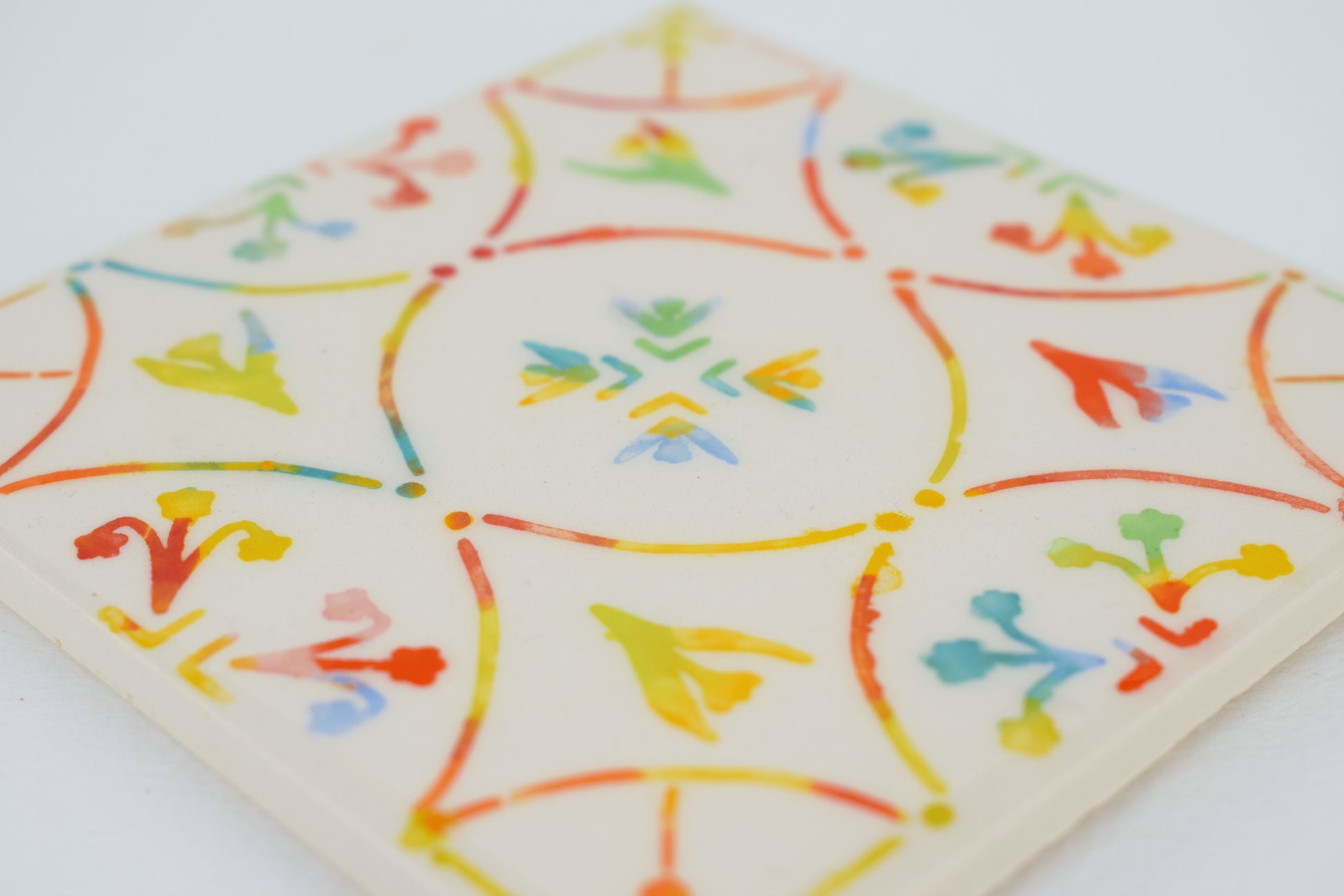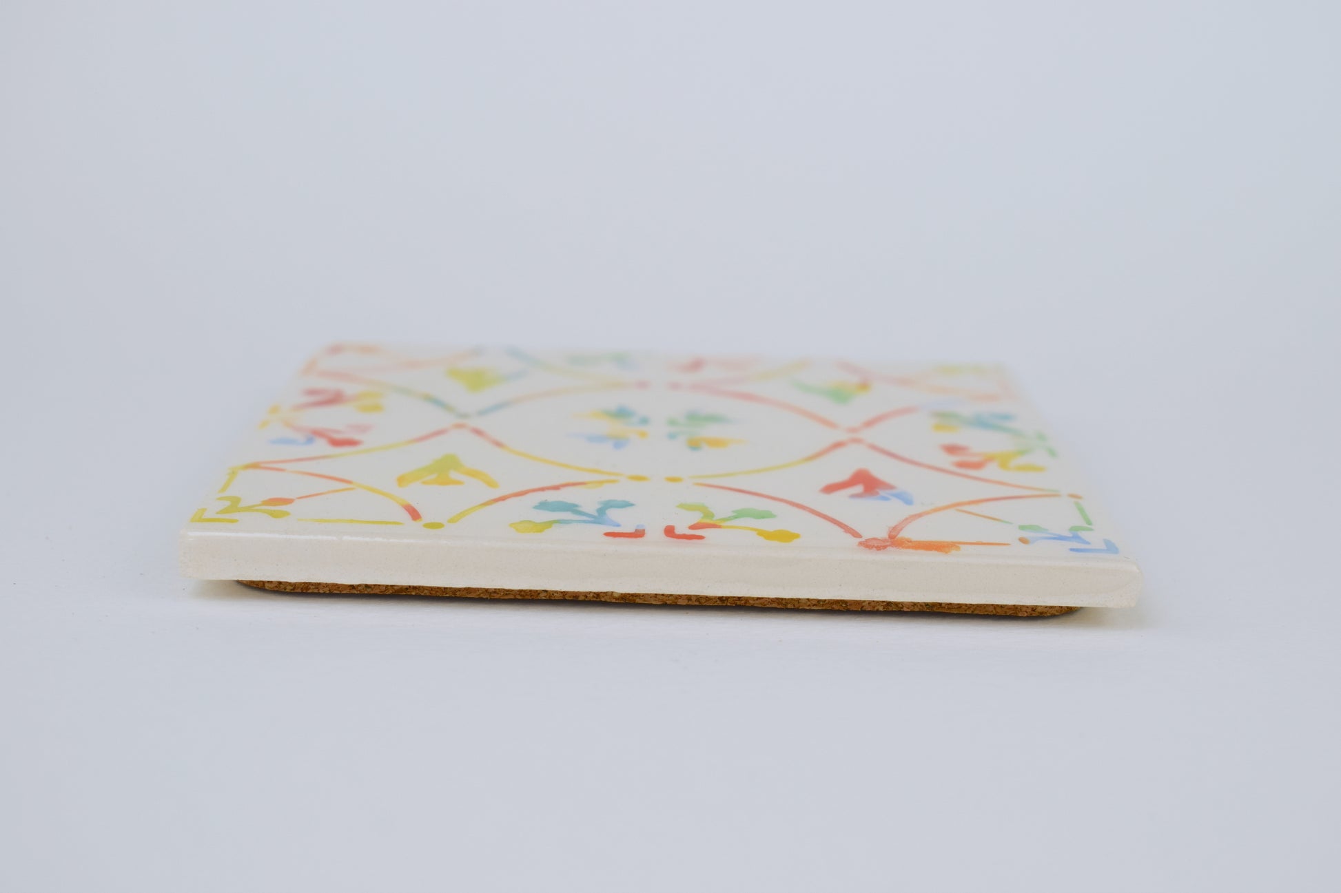 This earthenware coaster has been professionally made by a British company and hand-decorated in my cosy home studio. Twice fired to over 1000°C, each piece features a bright, joyful design — full of playful pattern and vibrant colour. No two are exactly alike, making each coaster a small, functional artwork in its own right. A cork base protects surfaces, making it both cheerful and practical.