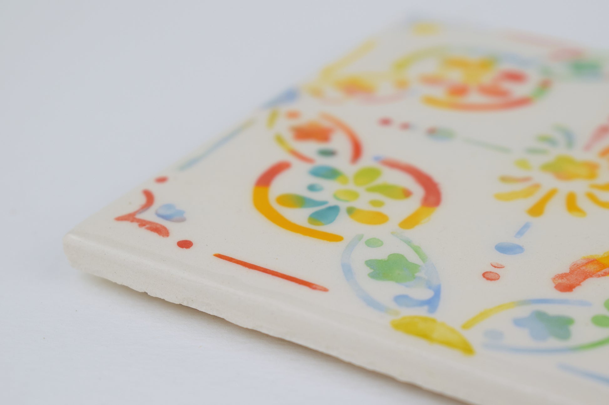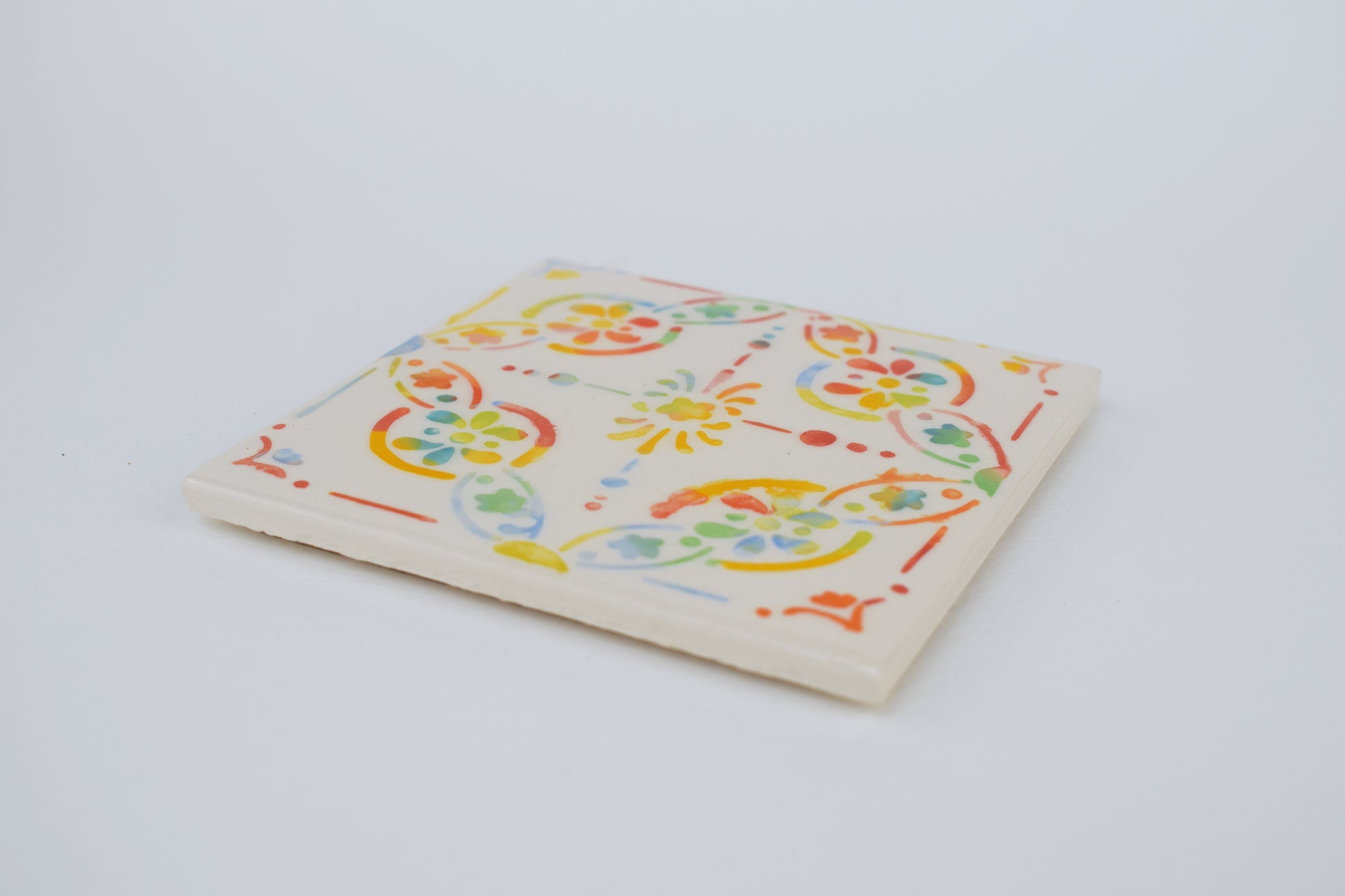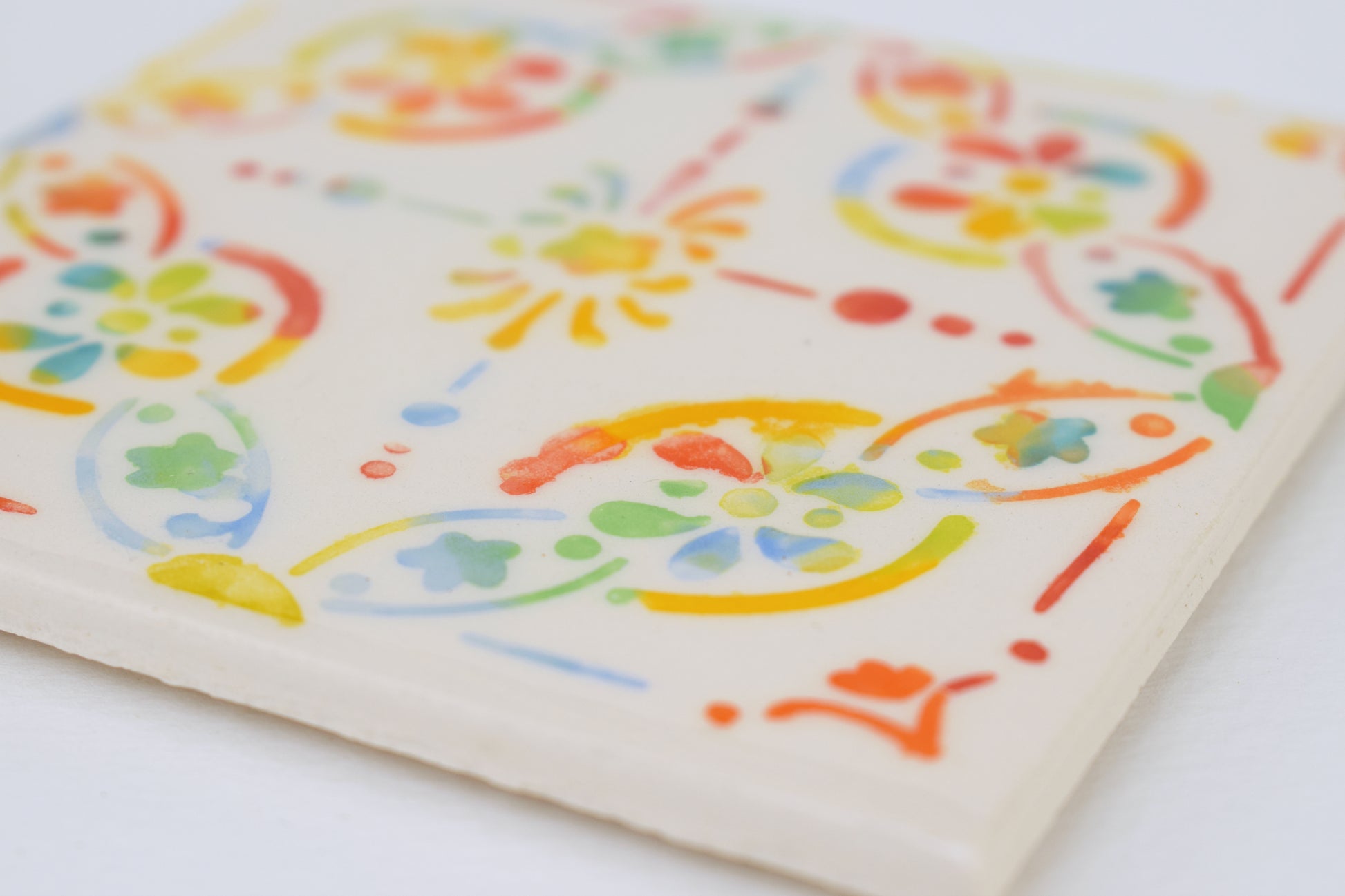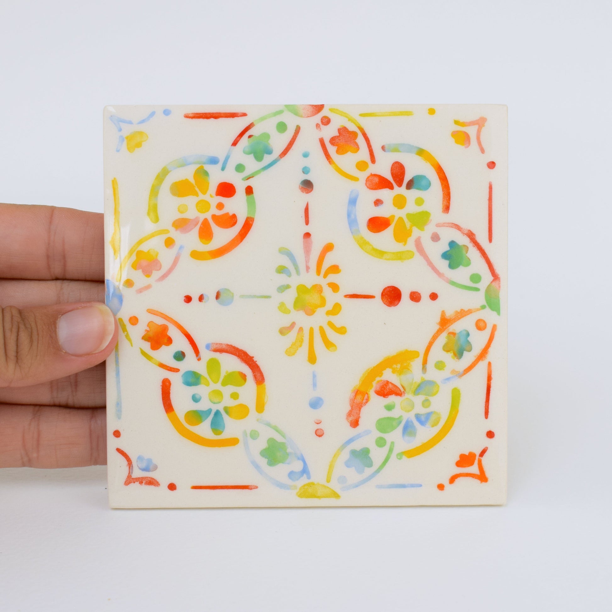 This earthenware coaster has been professionally made by a British company and hand-decorated in my cosy home studio. Twice fired to over 1000°C, each piece features a bright, joyful design — full of playful pattern and vibrant colour. No two are exactly alike, making each coaster a small, functional artwork in its own right. A cork base protects surfaces, making it both cheerful and practical.