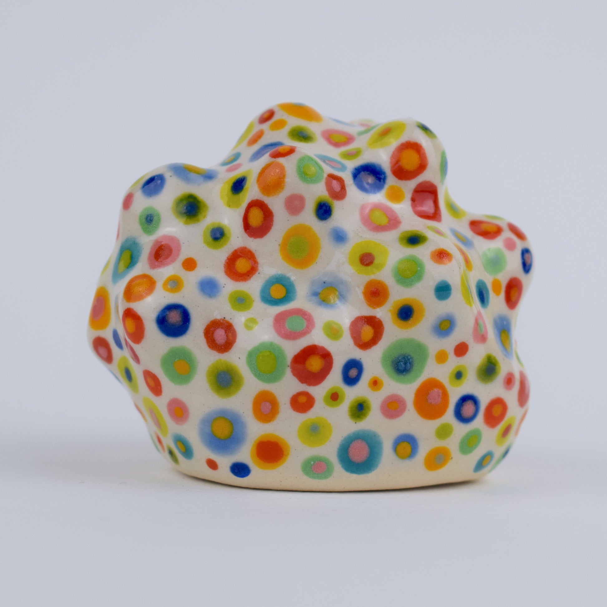 This stoneware mini sculpture has been hand built and painted with vibrant glazes using patterns inspired by nature. Twice fired to over 1000 degrees the ceramic blob can be used as a paper weight, to brighten your mantle piece or as a little colourful friend for your work desk!