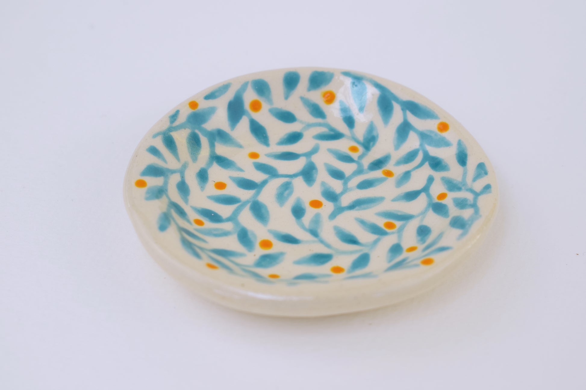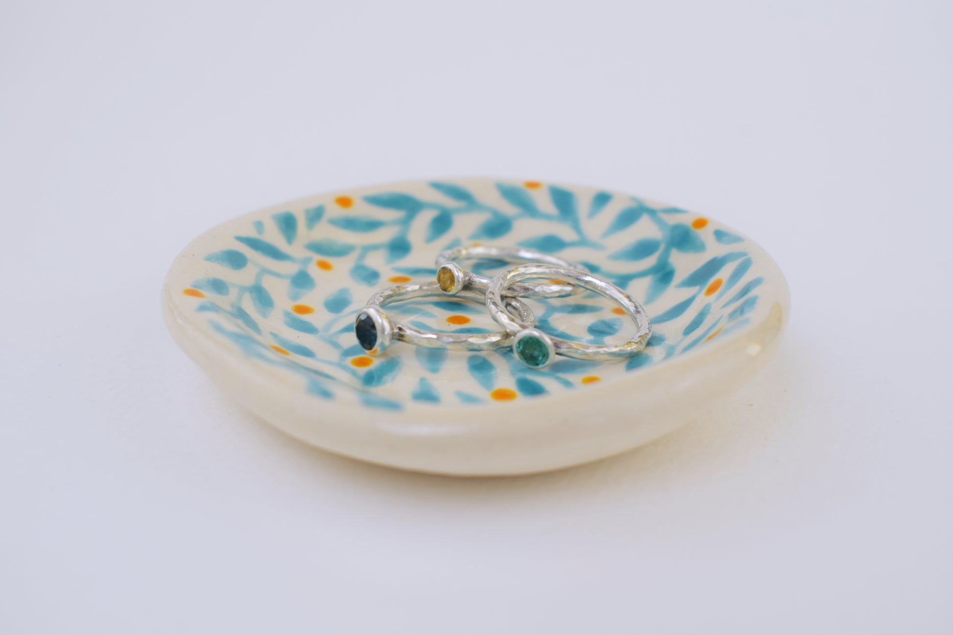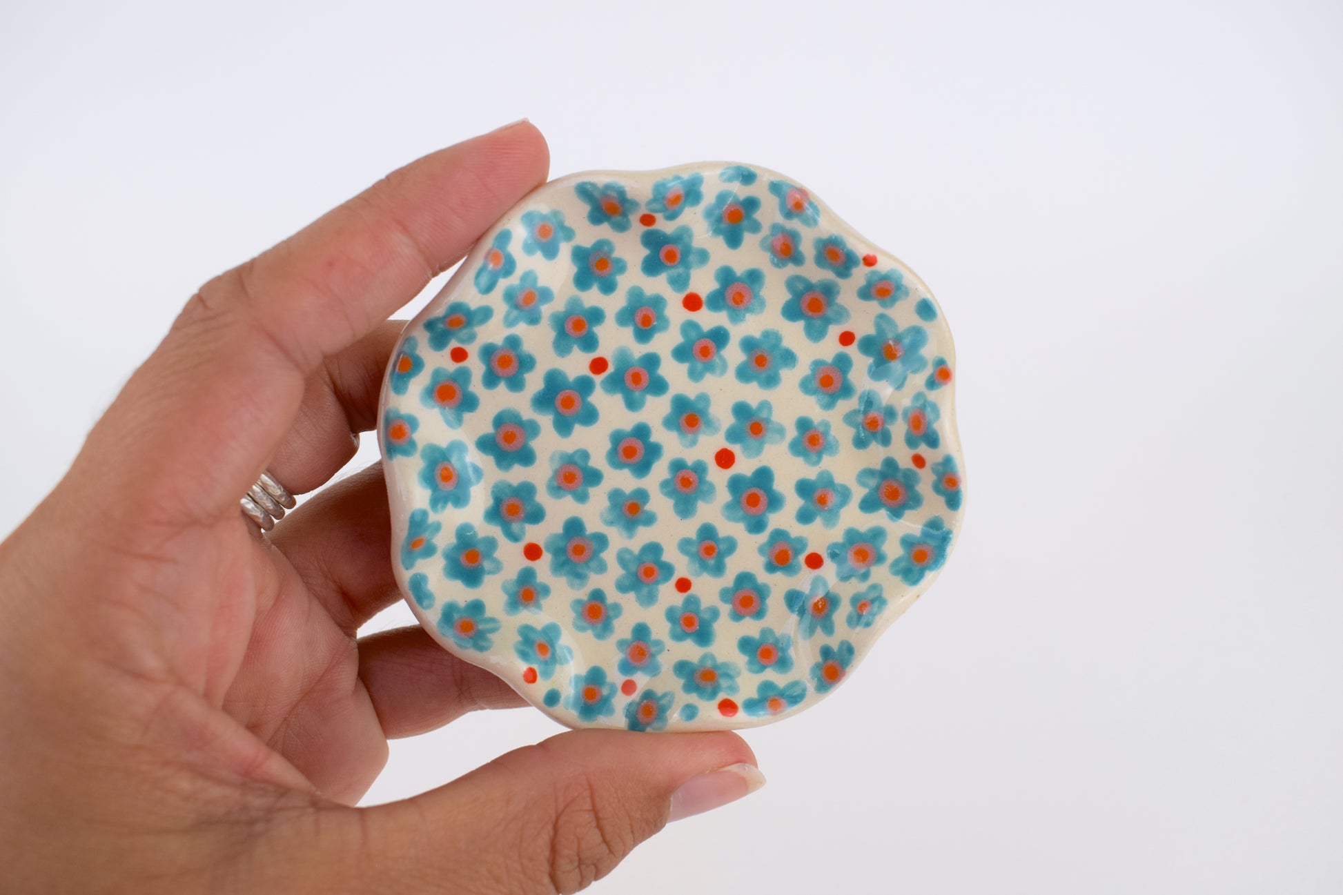 The joyful patterned trinket dish is a hand-thrown, one-of-a-kind ceramic, crafted in my cosy home studio. Fired twice to over 1200°C, it’s both durable and delightfully decorative. Each piece features a unique, hand-painted design in vibrant, layered glazes — a tiny celebration of colour and joy!
