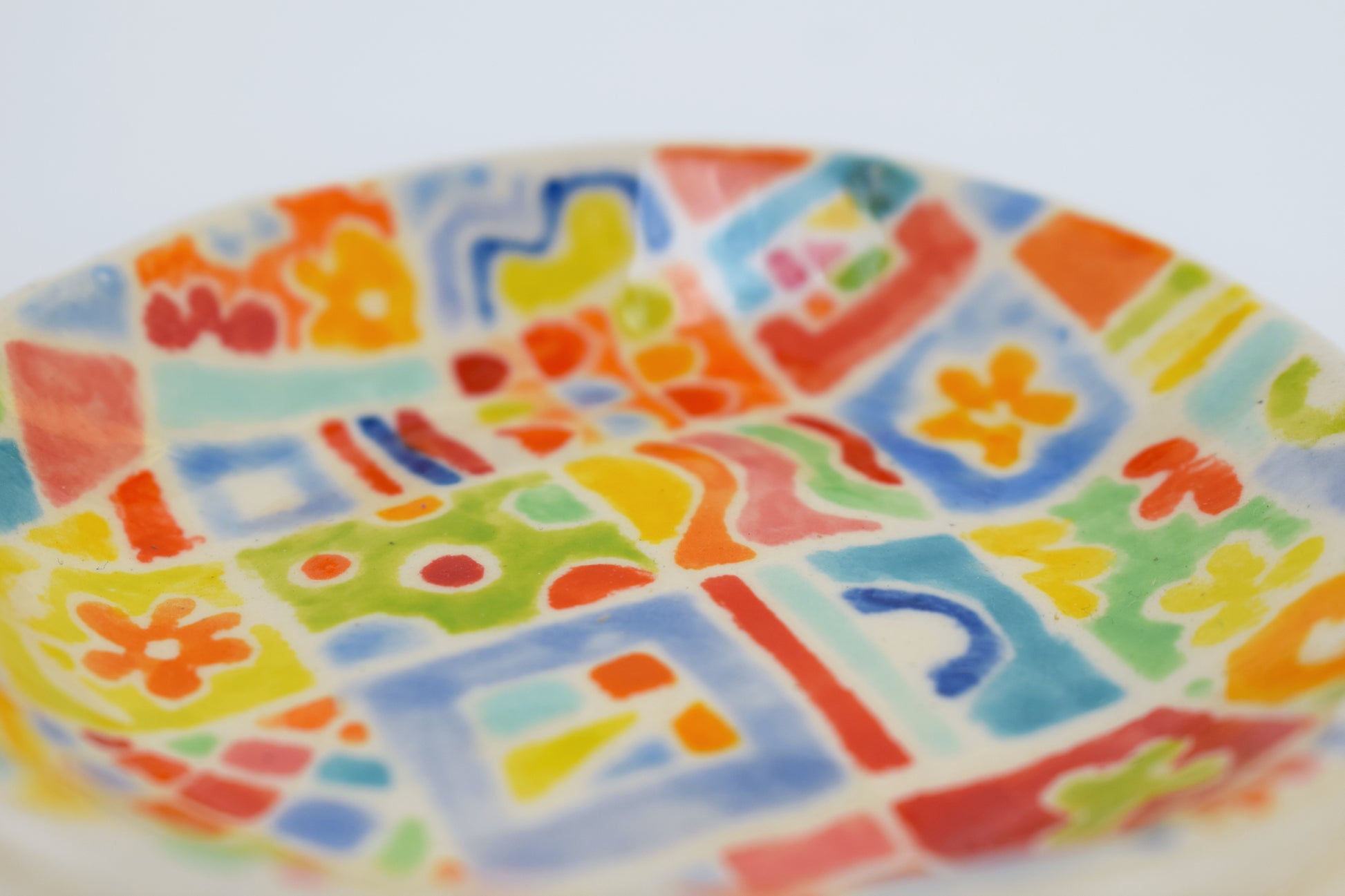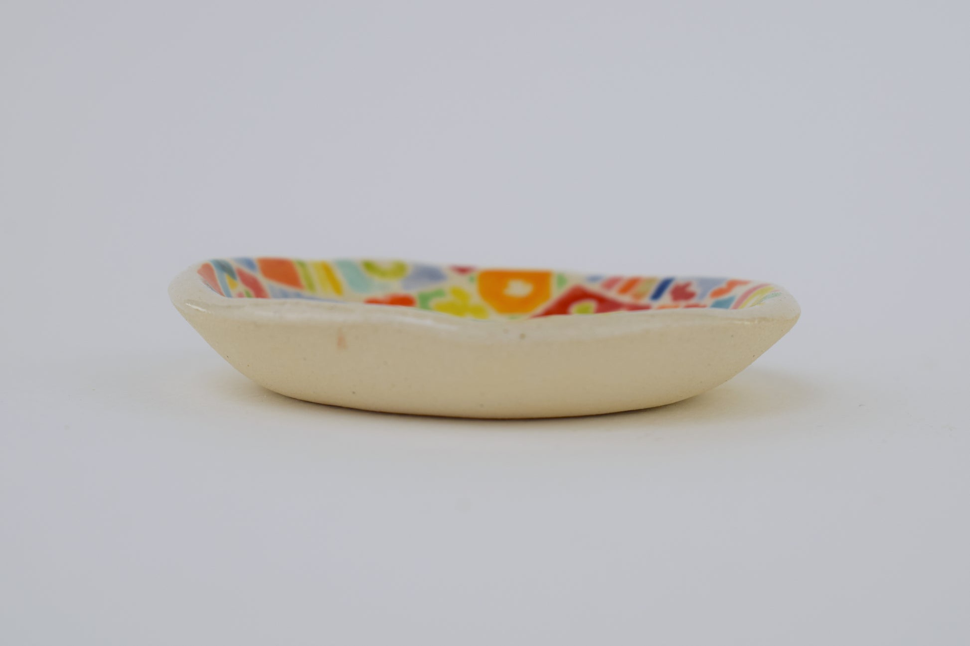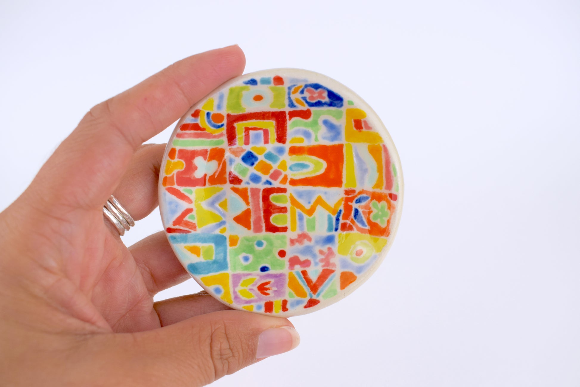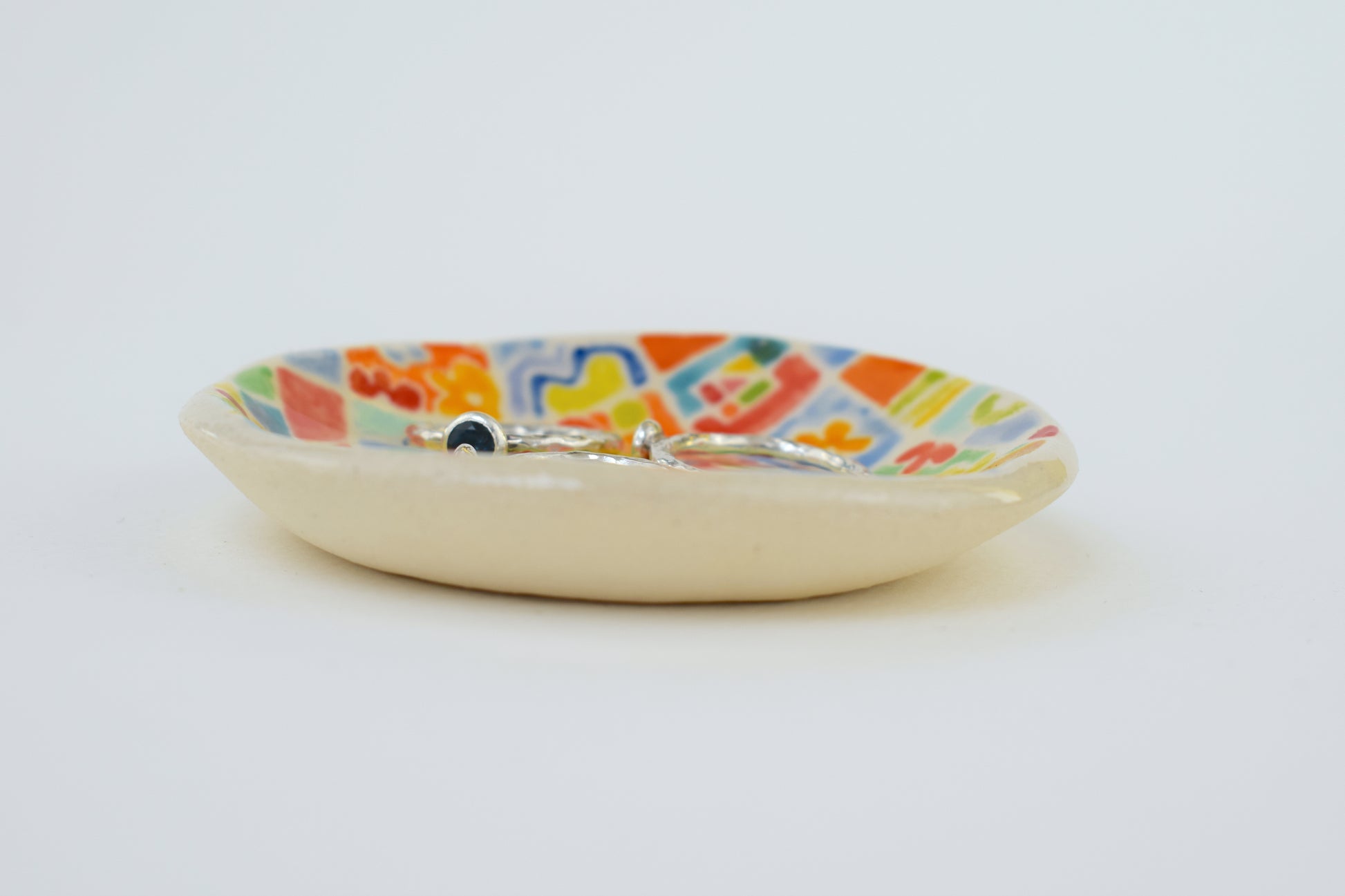 The joyful patterned trinket dish is a hand-thrown, one-of-a-kind ceramic, crafted in my cosy home studio. Fired twice to over 1200°C, it’s both durable and delightfully decorative. Each piece features a unique, hand-painted design in vibrant, layered glazes — a tiny celebration of colour and joy!