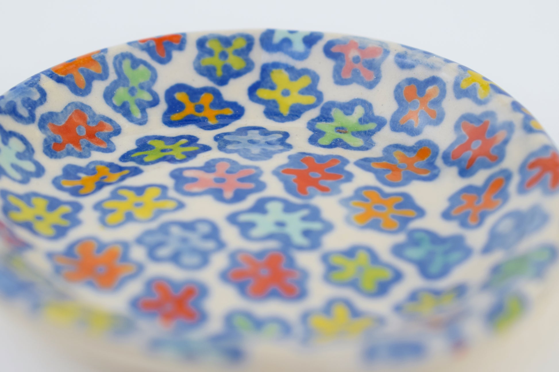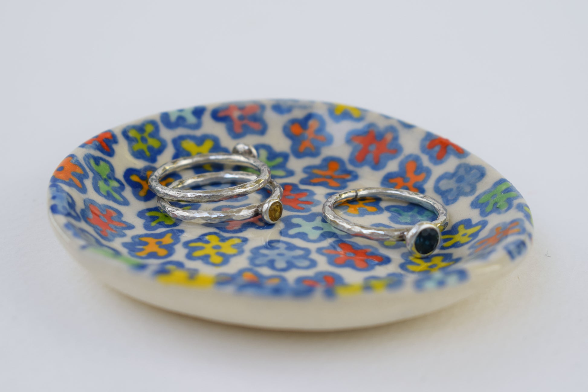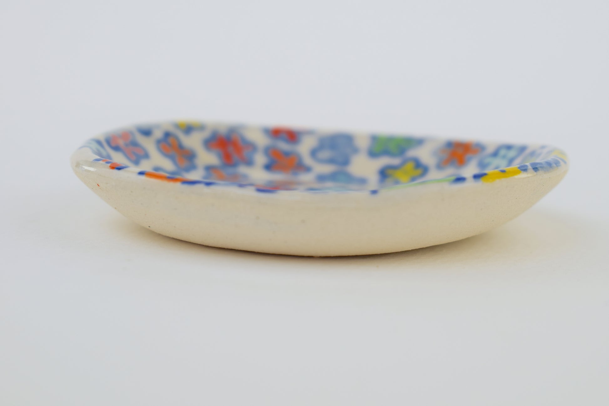 The joyful patterned trinket dish is a hand-thrown, one-of-a-kind ceramic, crafted in my cosy home studio. Fired twice to over 1200°C, it’s both durable and delightfully decorative. Each piece features a unique, hand-painted design in vibrant, layered glazes — a tiny celebration of colour and joy!